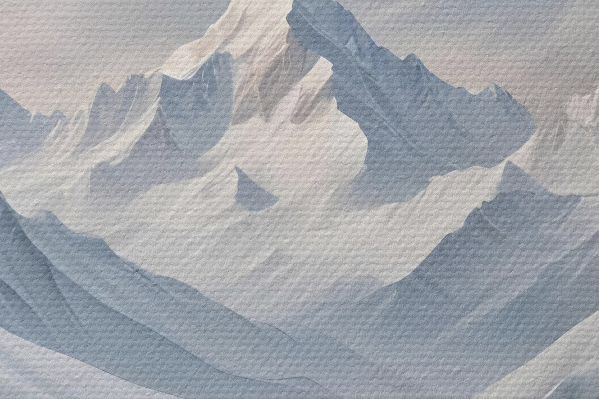 Pilt Teravate tippudega lumega kaetud mäed ja pehmelt astmeline taevas, mis muutub kahvatust helesiniseks Nr r42724