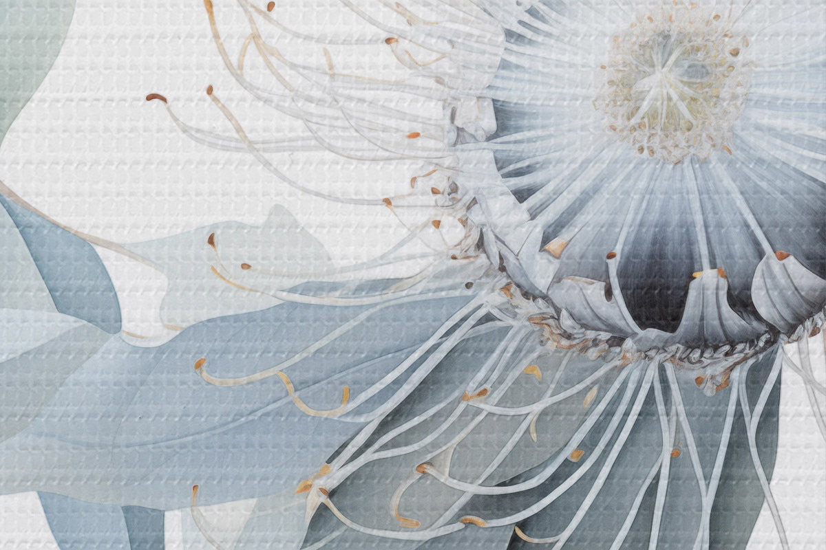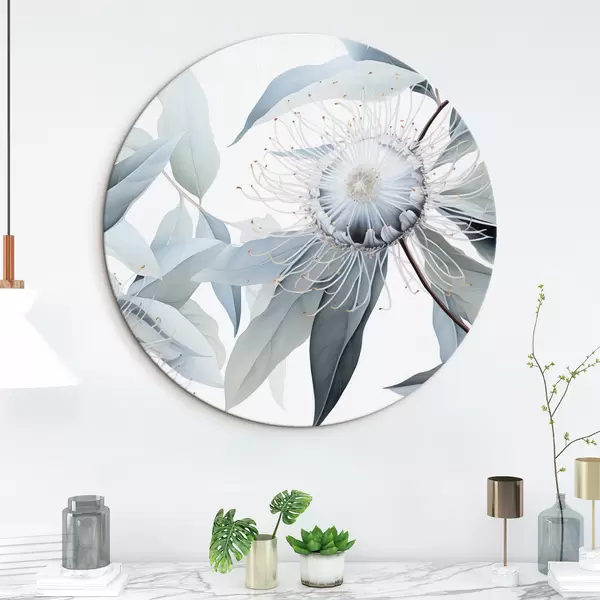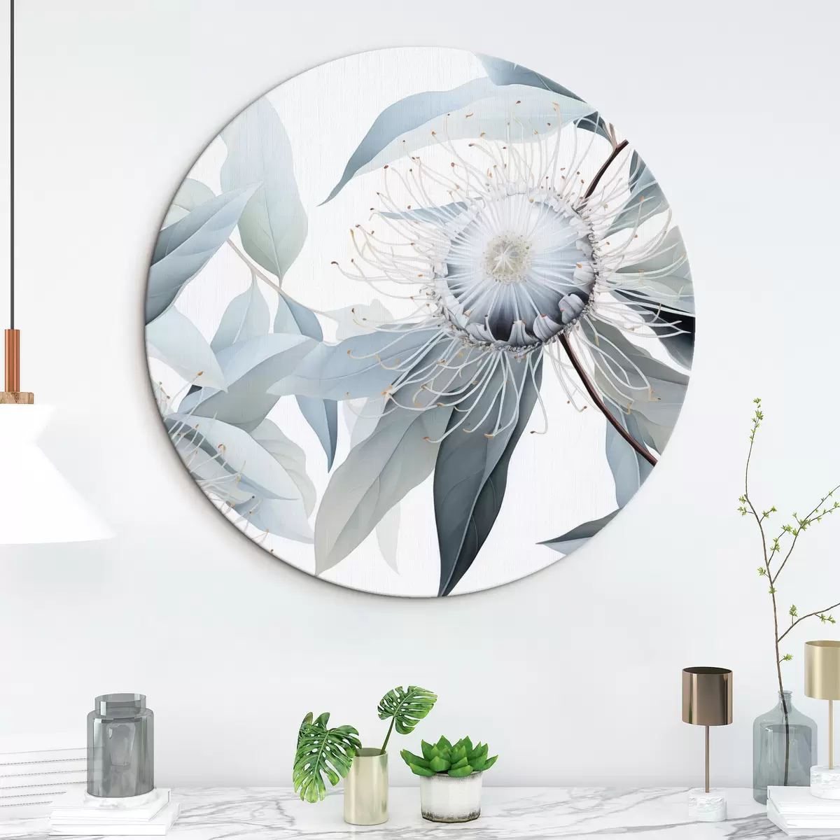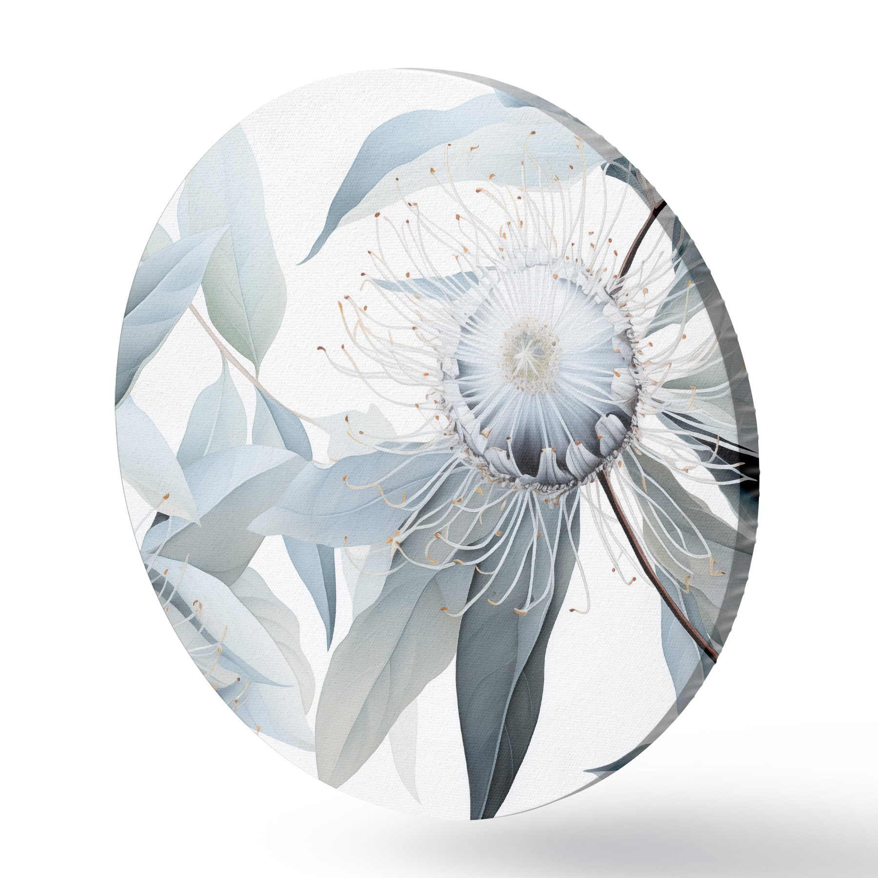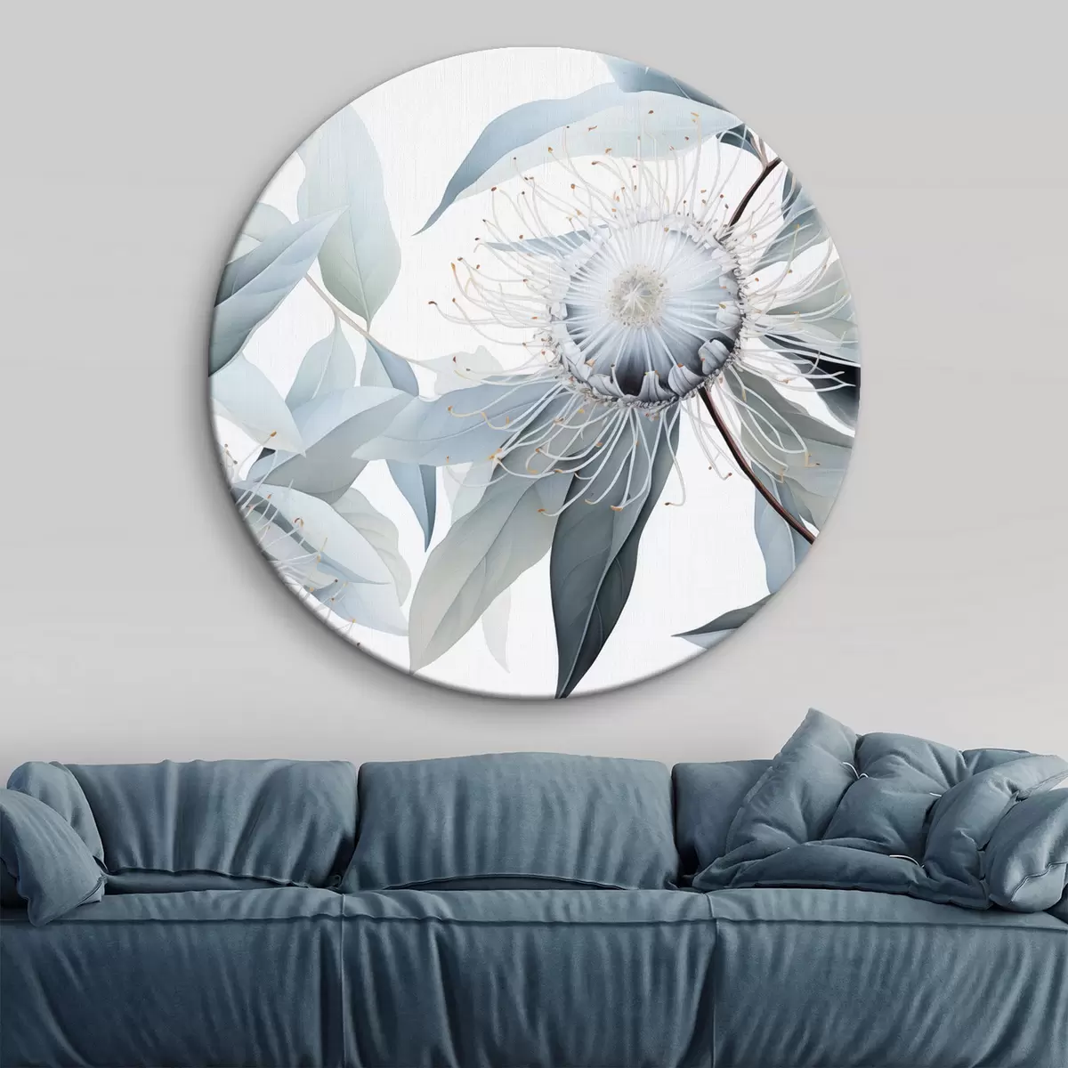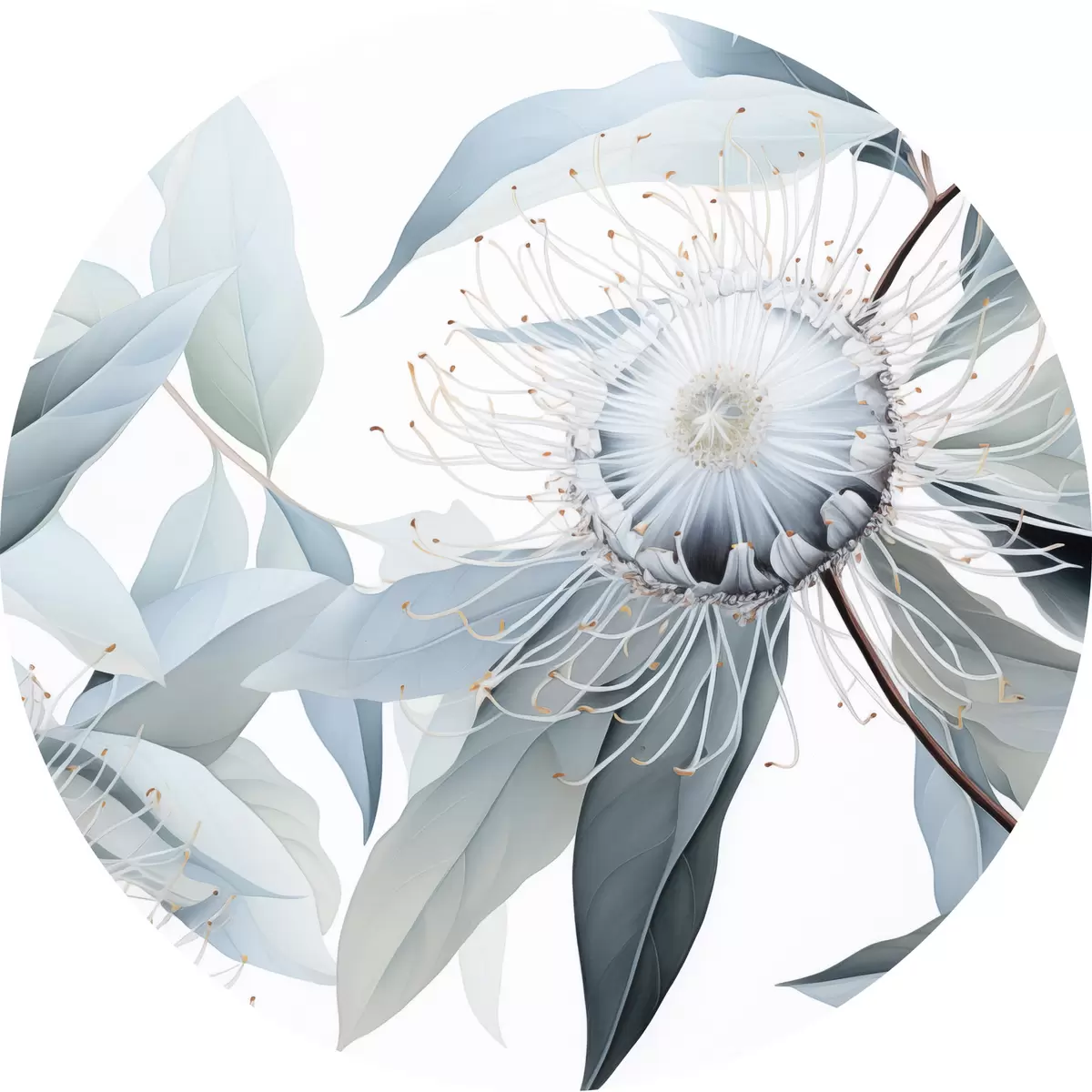 Pilt Detailne botaaniline illustratsioon eukaliptuse valge õiega lilledest, mida ümbritsevad pehmed helerohelised lehed Nr r42725