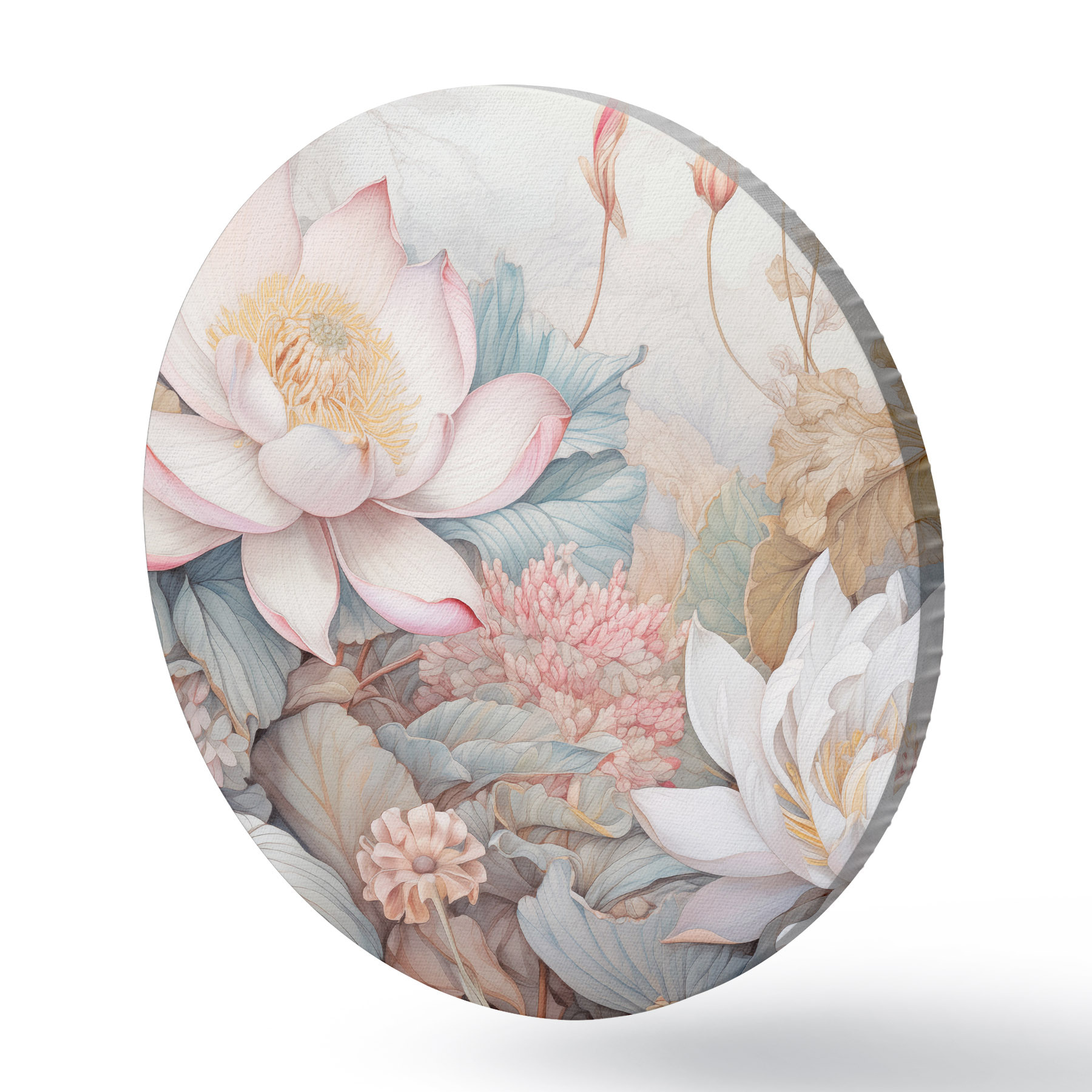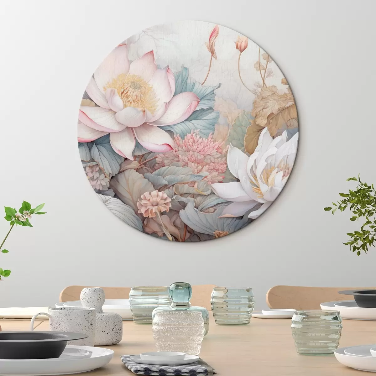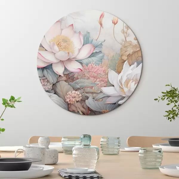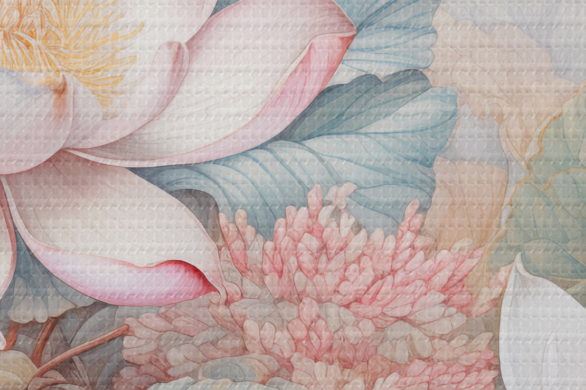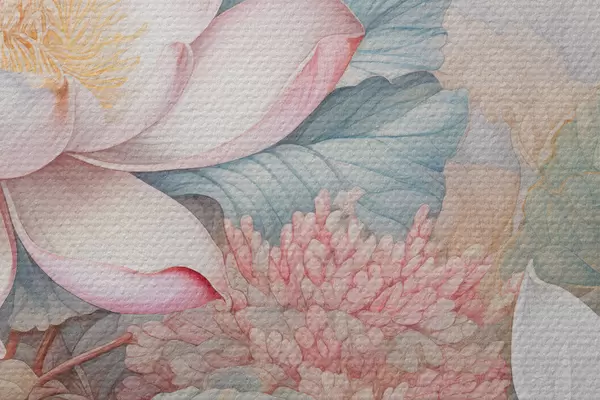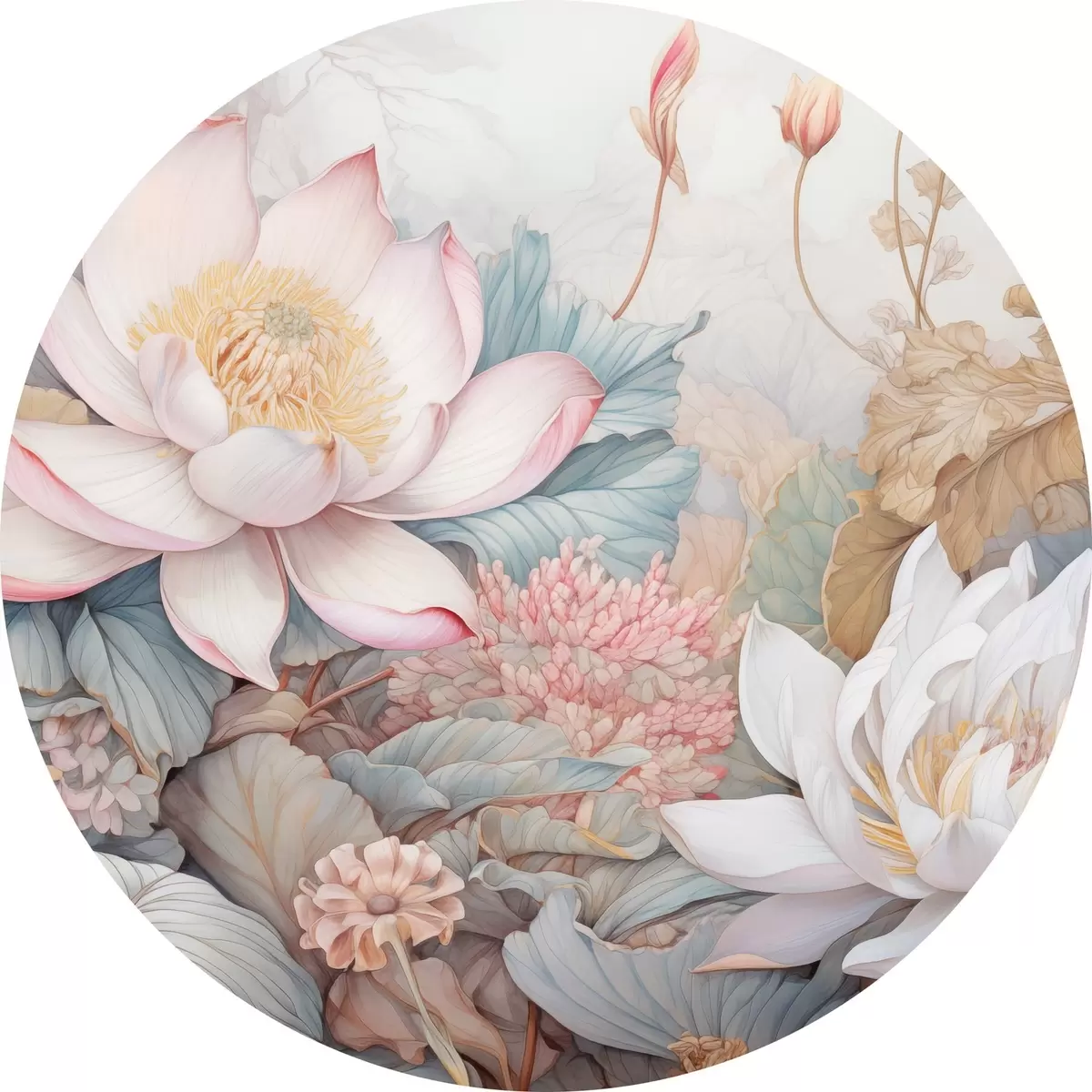 Pilt Suured, õitsevad lootoslilled pehmete roosade ja valgete toonidega, mida ümbritsevad rohelised lehed ja õrnad roosad lehed Nr r42729