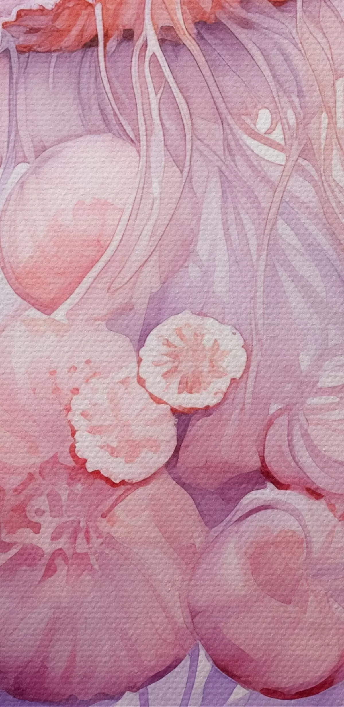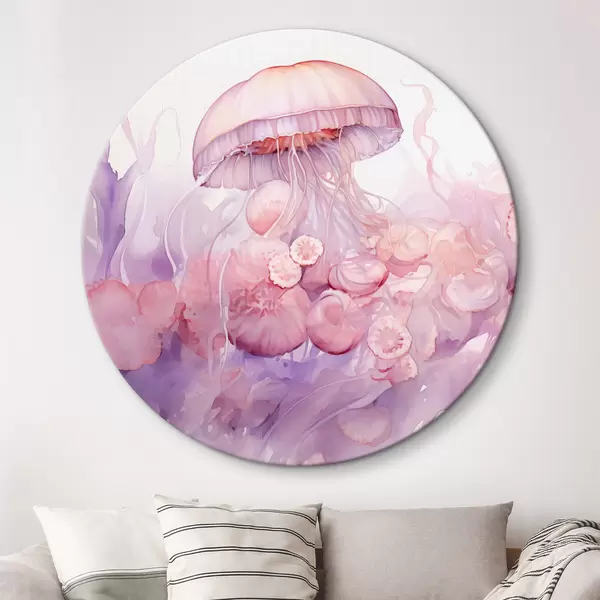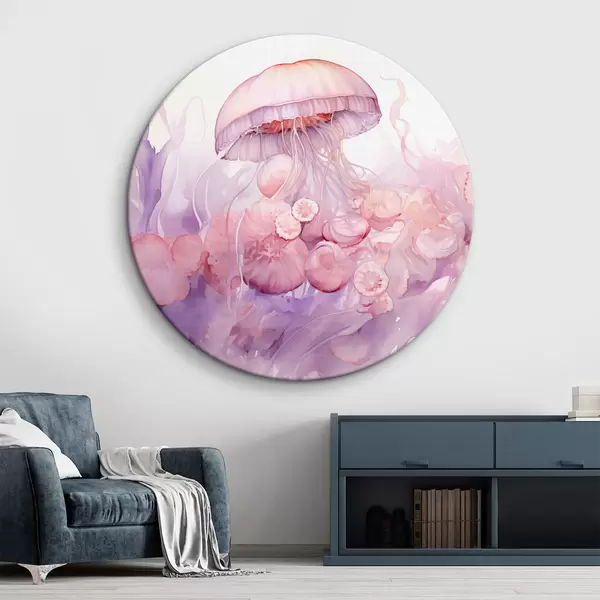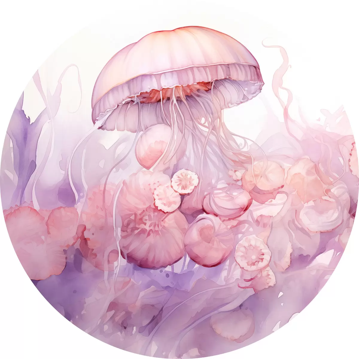 Pilt Roosa meduus, mis hõljub pehmete roosade ja lillade toonide keerises, ümbritsetud abstraktsete kujunditega Nr r42730