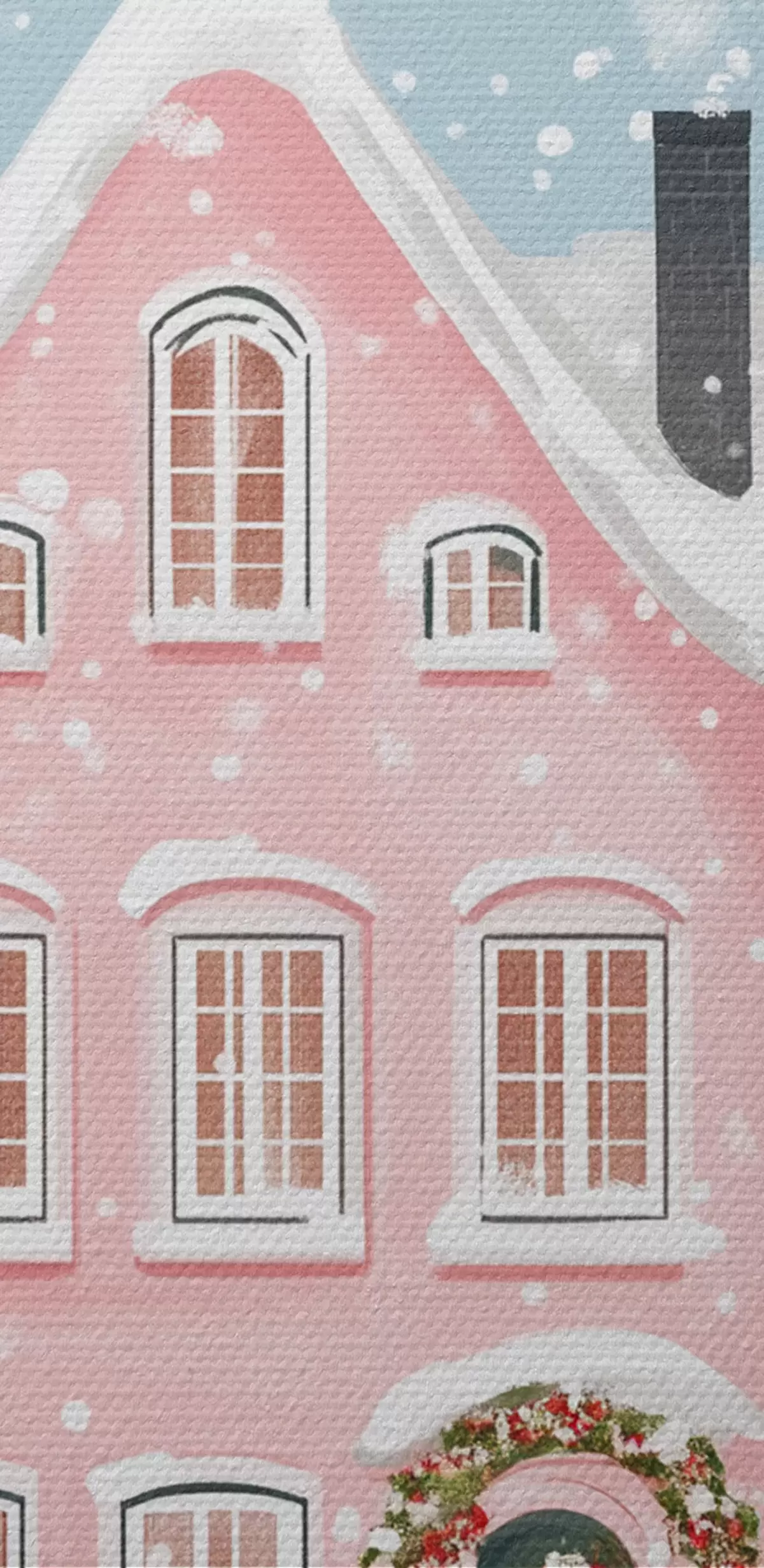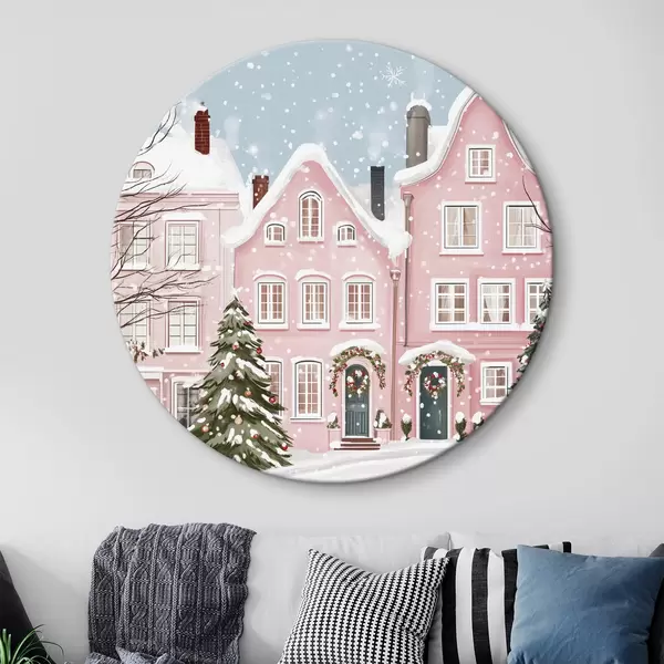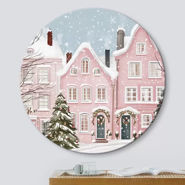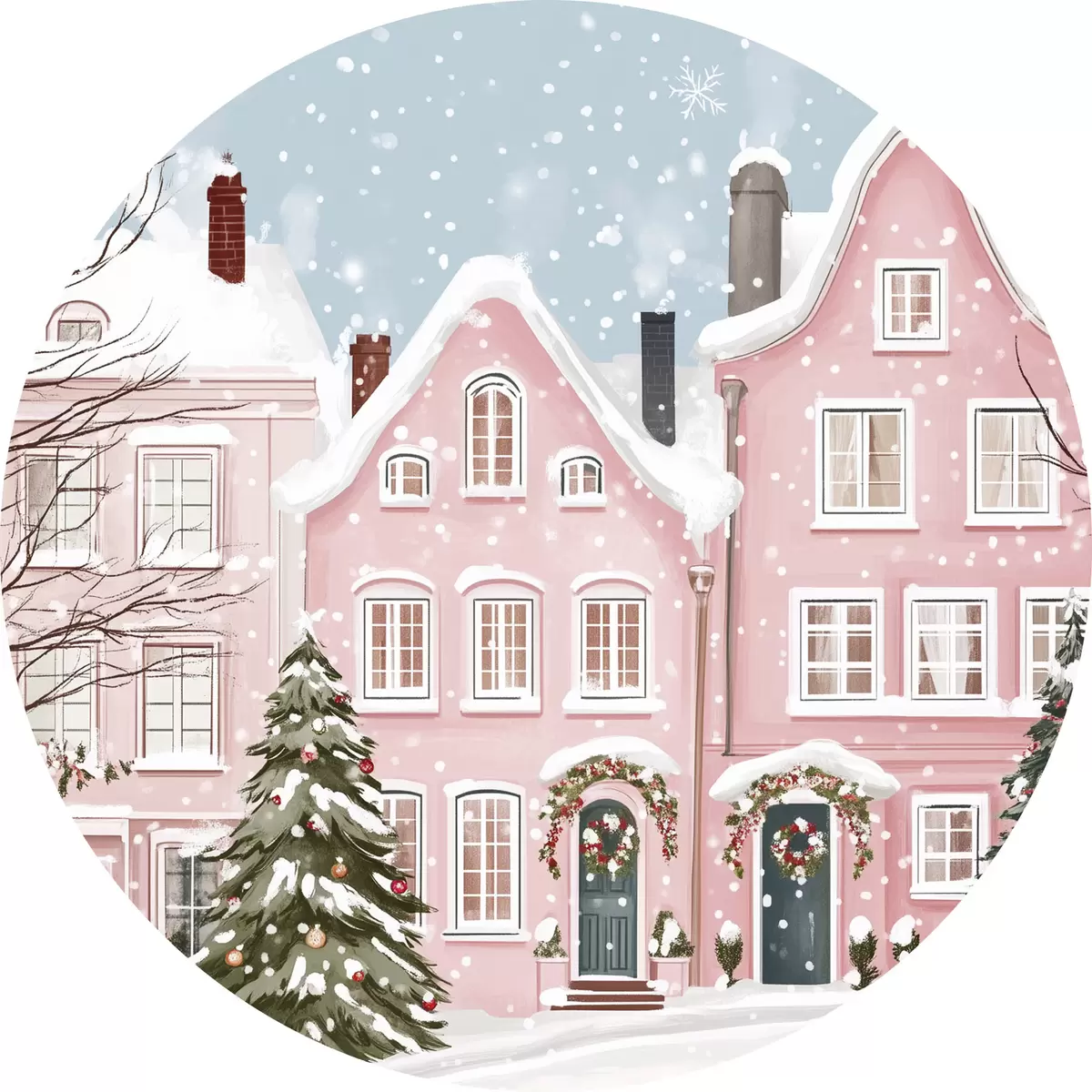 Pilt Kaunis linn armas roosade majade, talvise esteetika, lumehelvestega Nr r42793