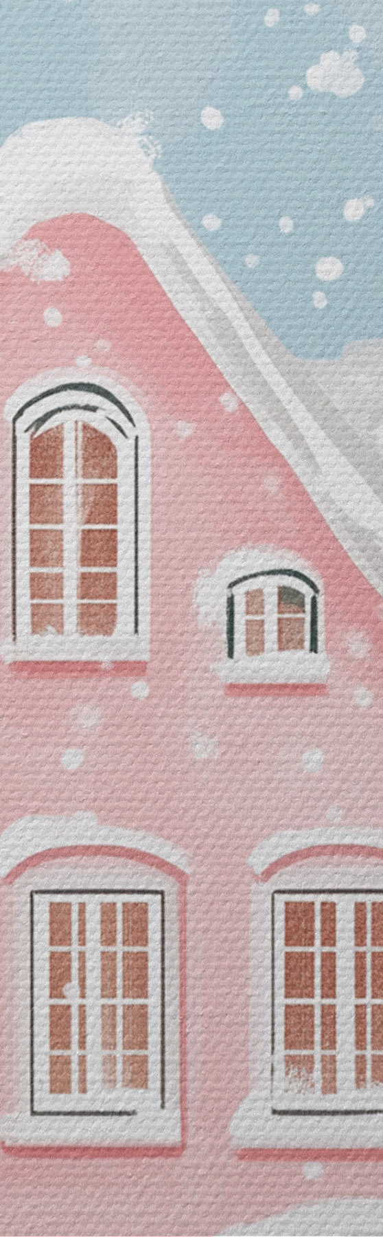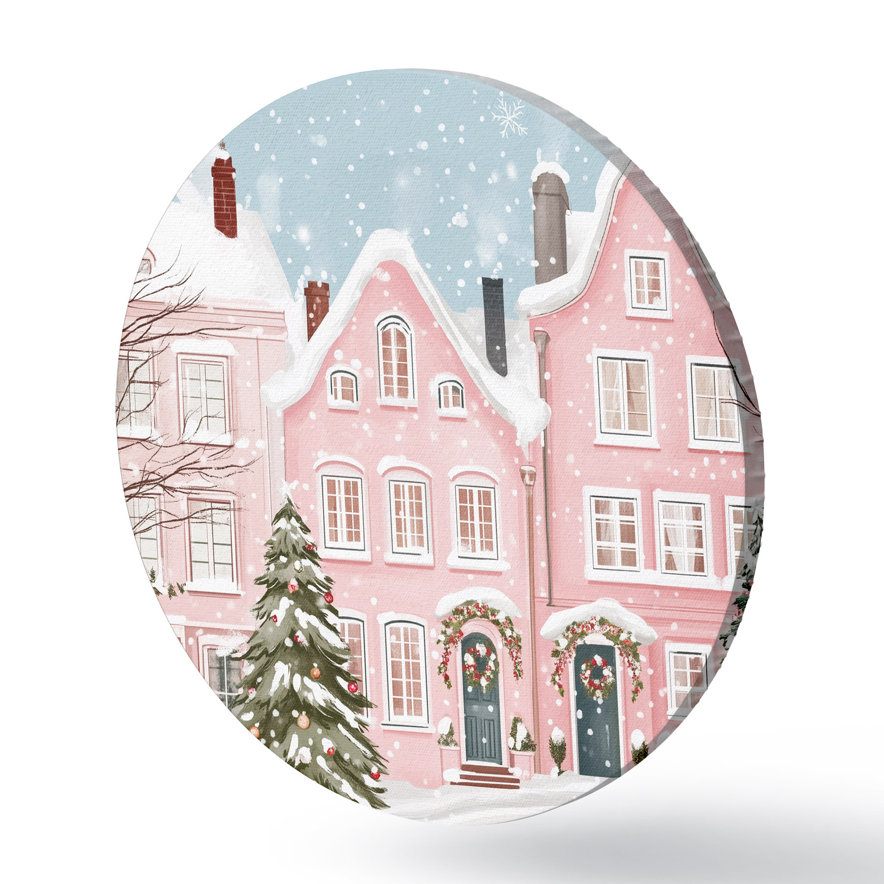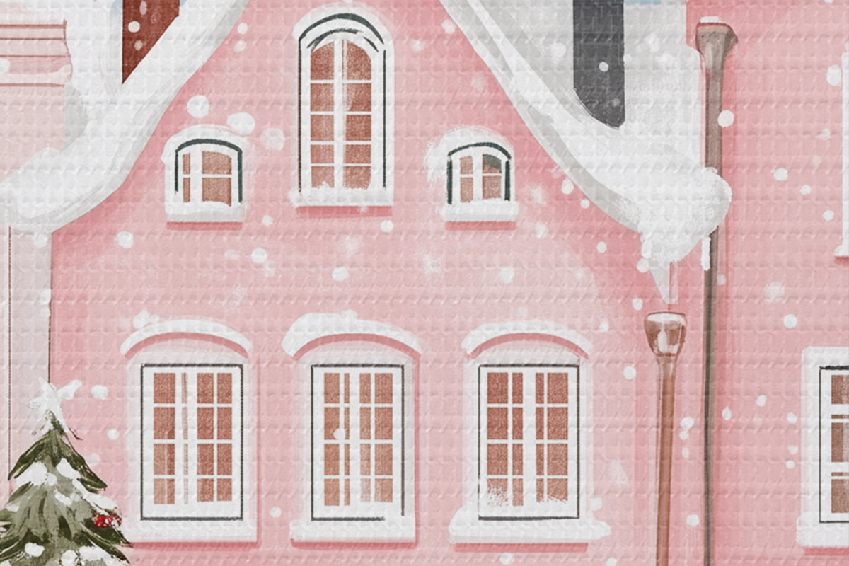 Pilt Kaunis linn armas roosade majade, talvise esteetika, lumehelvestega Nr r42793