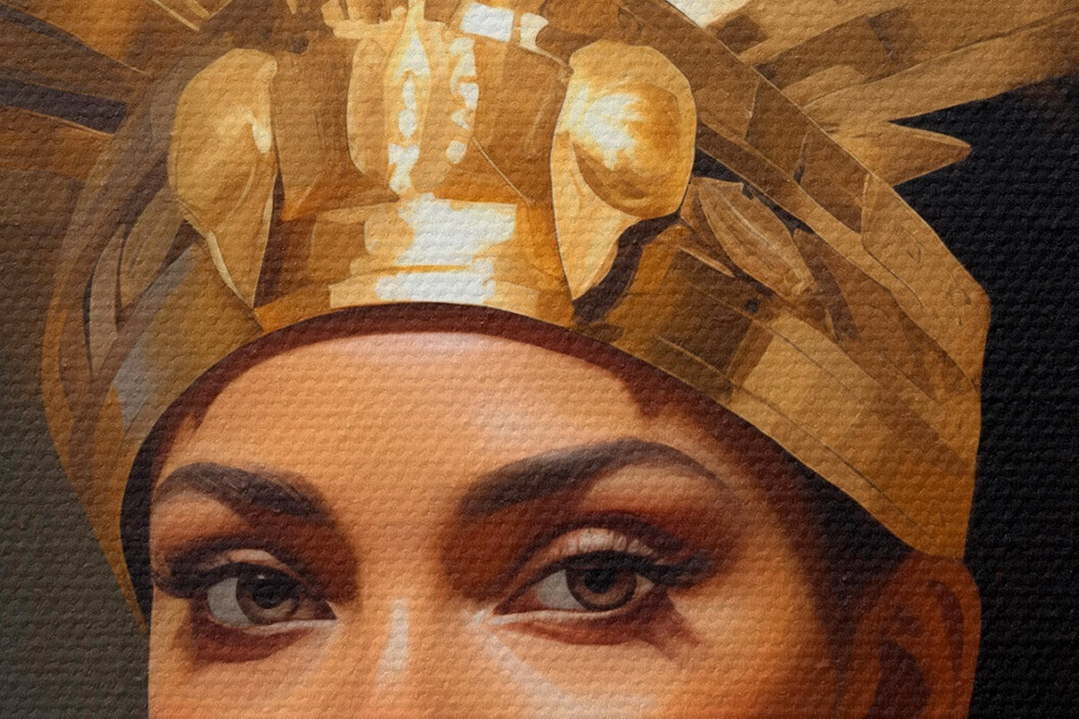 Pilt Majesteetliku peakatte ja traditsiooniliste kaunistustega naise portree Nr r42931