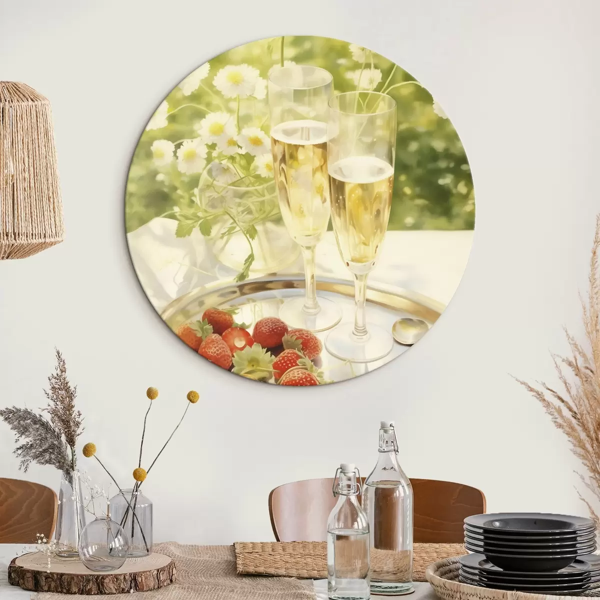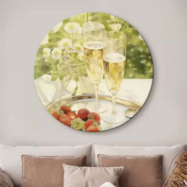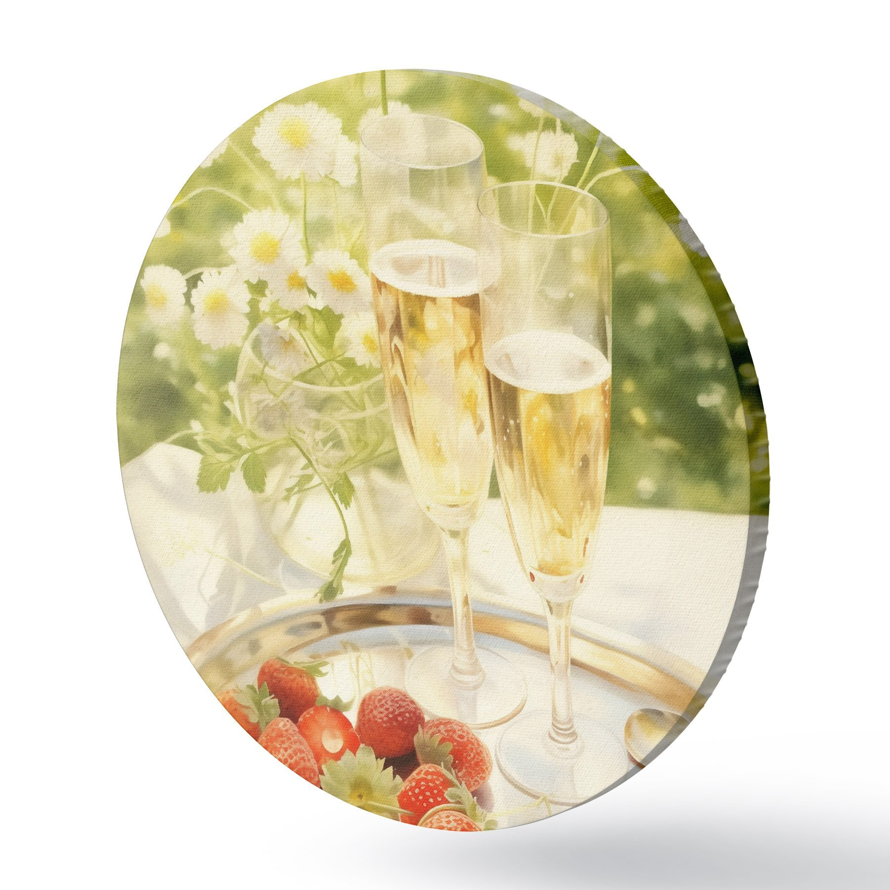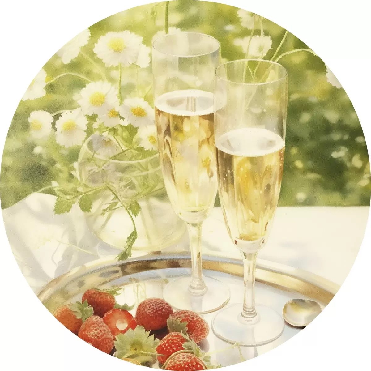 Pilt Šampanjaklaasid koos maasikatega kandikul, kummelililled, suvine Nr r43054