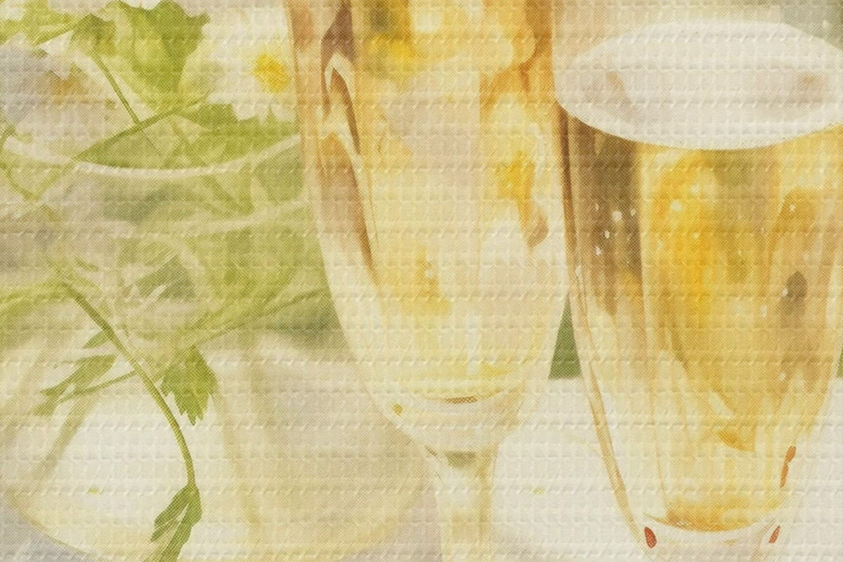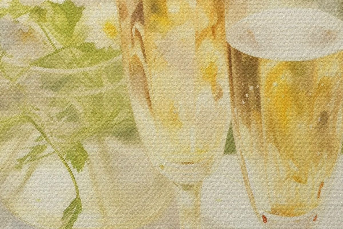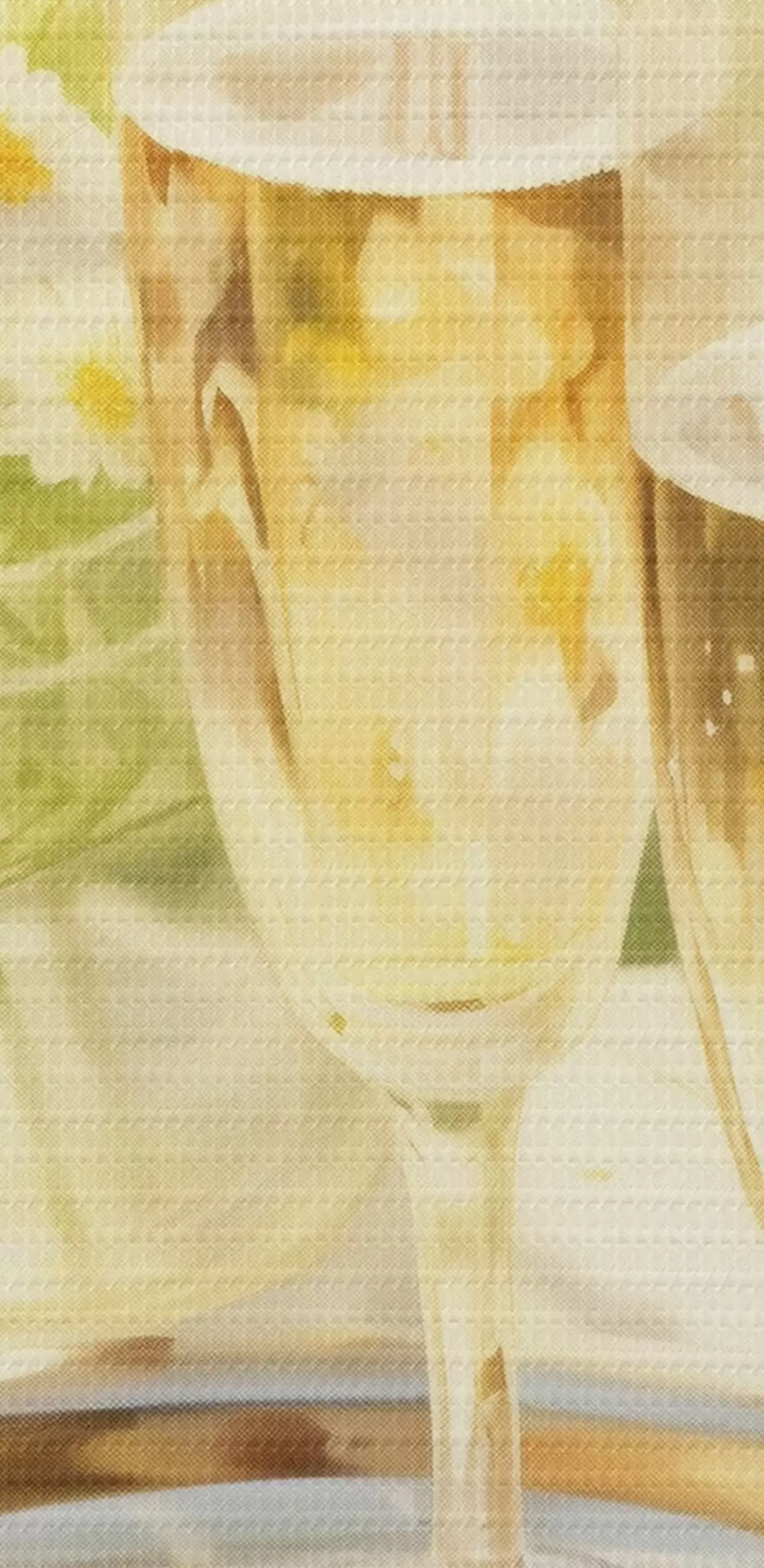 Pilt Šampanjaklaasid koos maasikatega kandikul, kummelililled, suvine Nr r43054