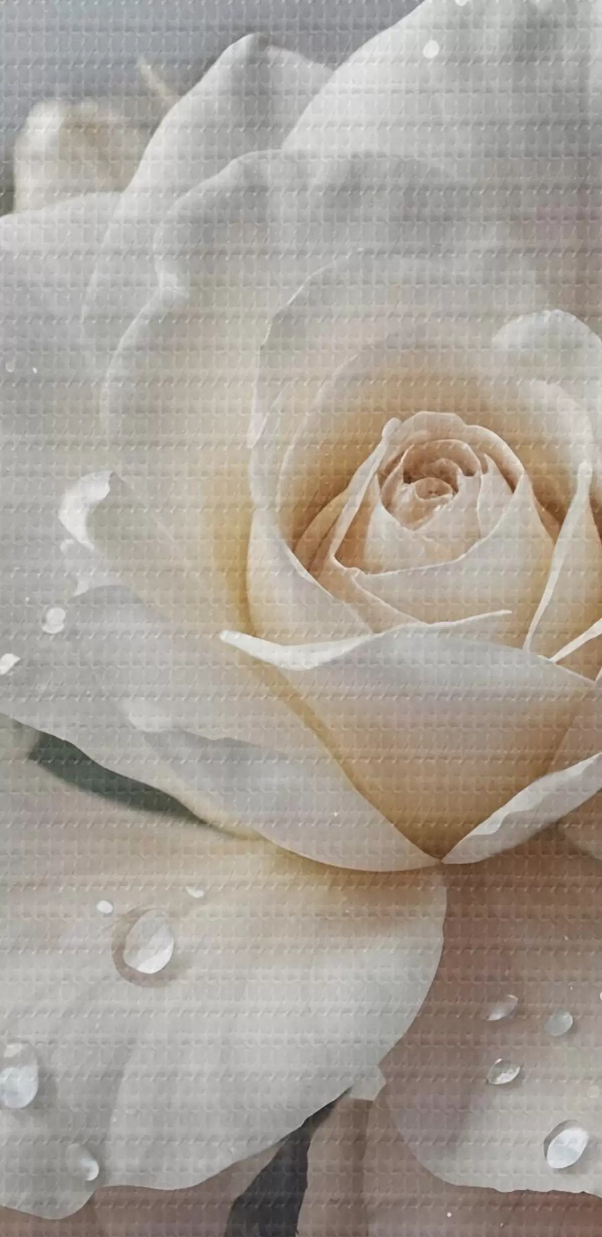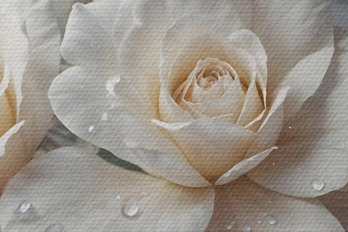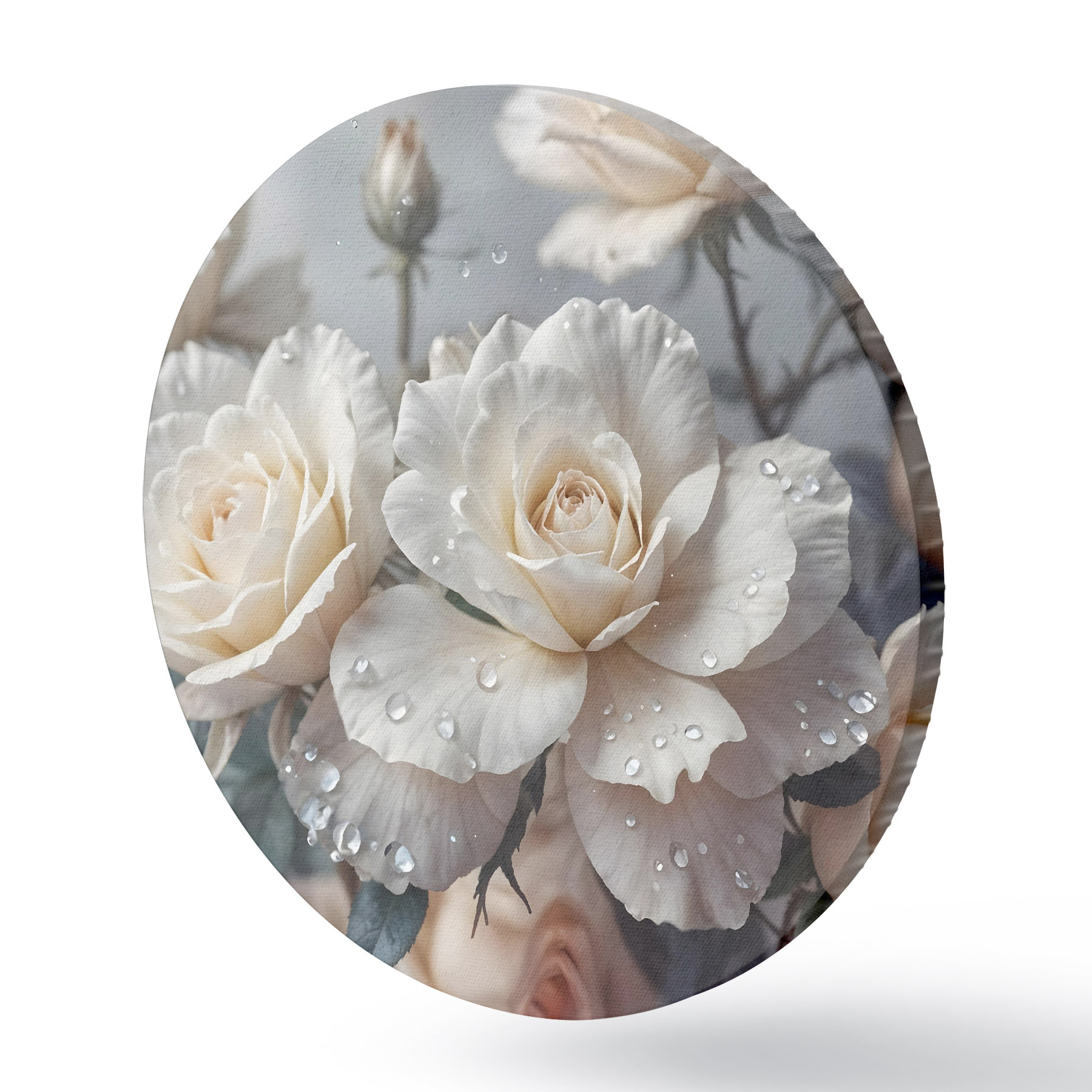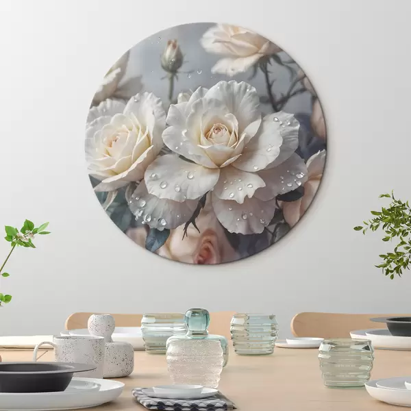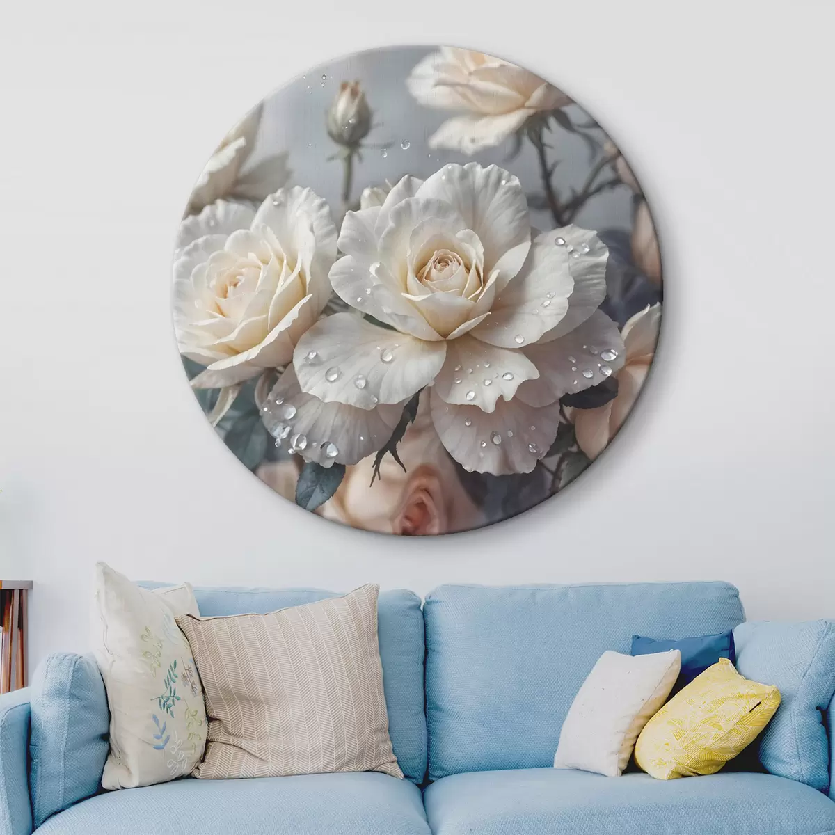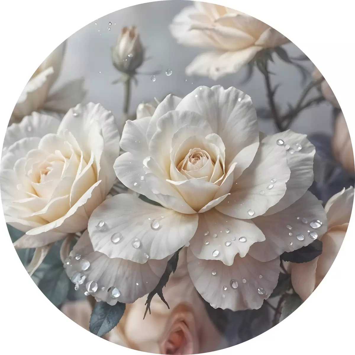 Pilt Rühm valgeid roose, mille kroonlehtedel on veetilgad, mõned rohelised lehed, summutatud taust, pehme valgus Nr r43163