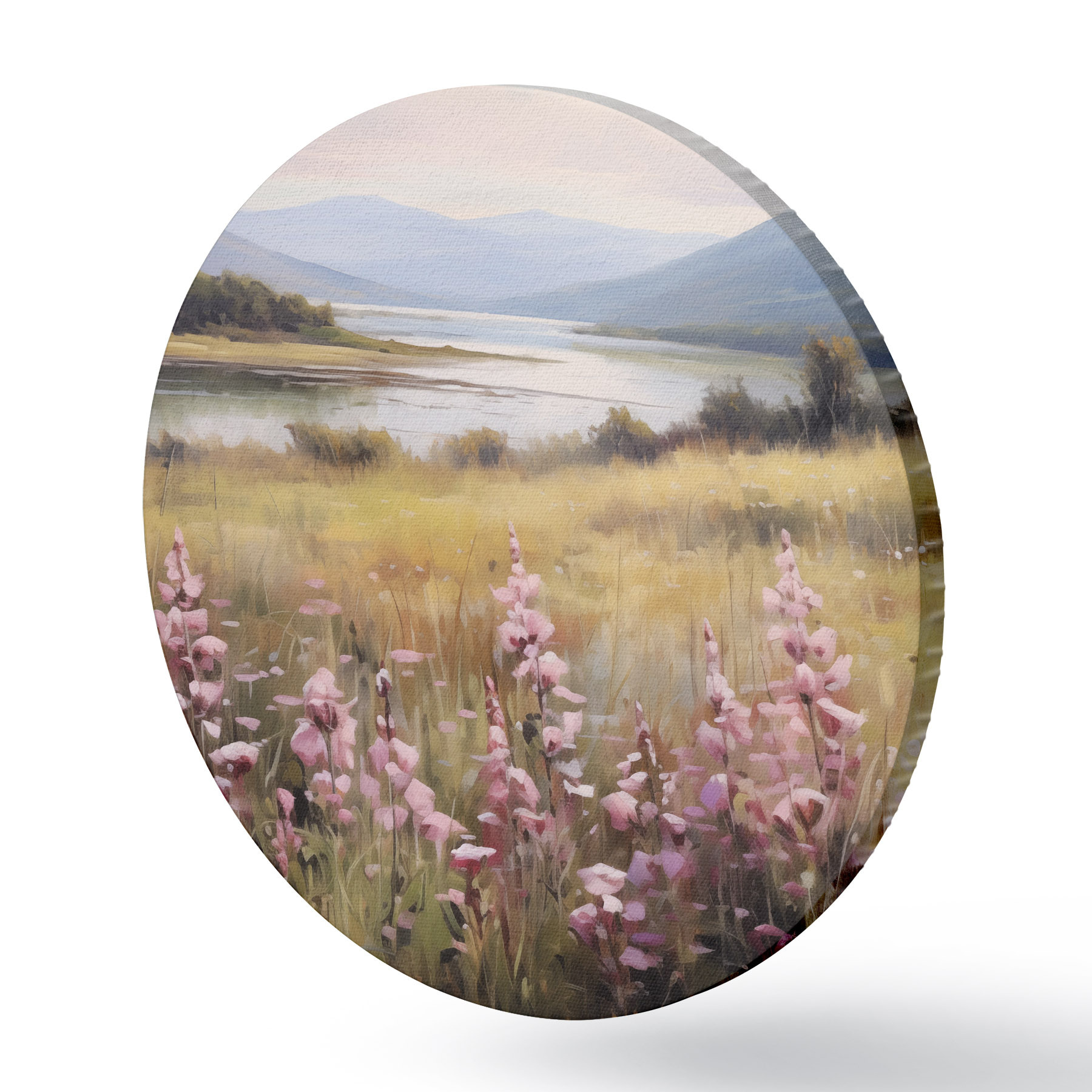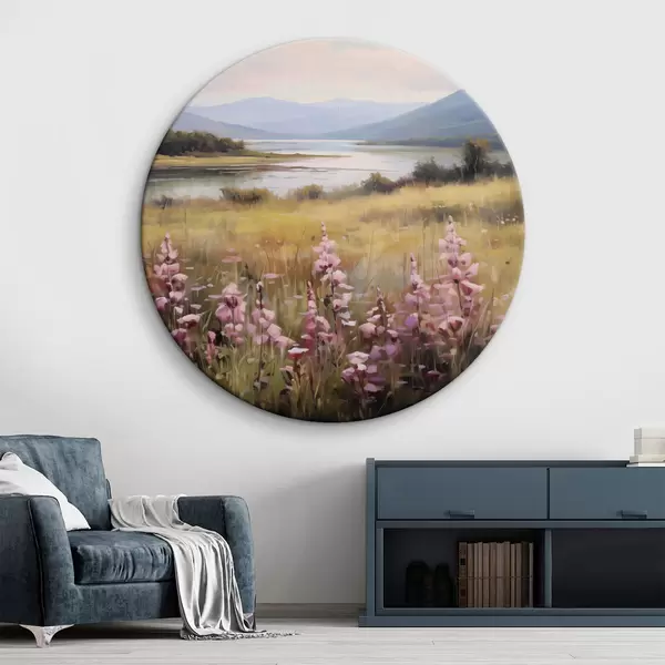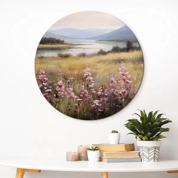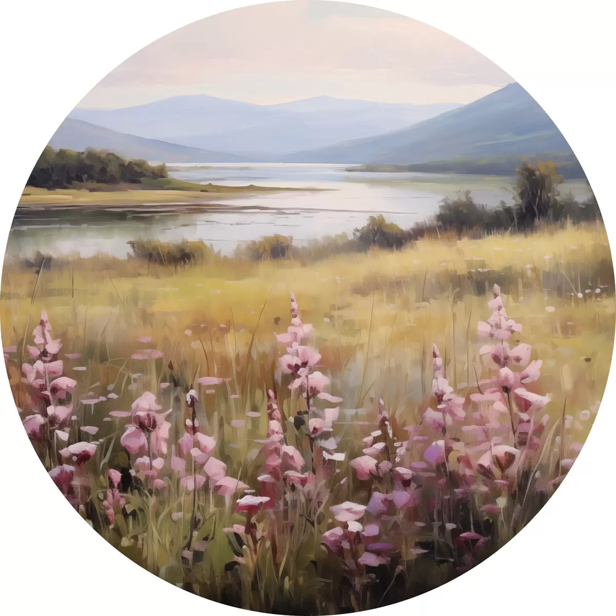 Pilt Maastik roosade lillede põllu, järve ja mägedega taustal, pilvise taeva all Nr r43165