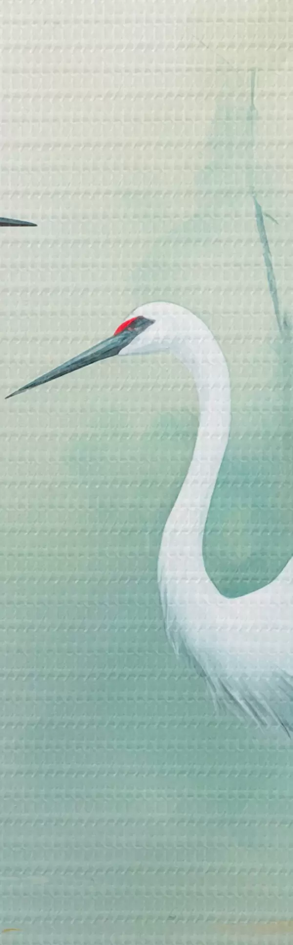 Pilt Kaks valget kraanat seisavad tiigis, mida ümbritseb lopsakas roheline mets pehme hajutatud valgusega Nr r43166