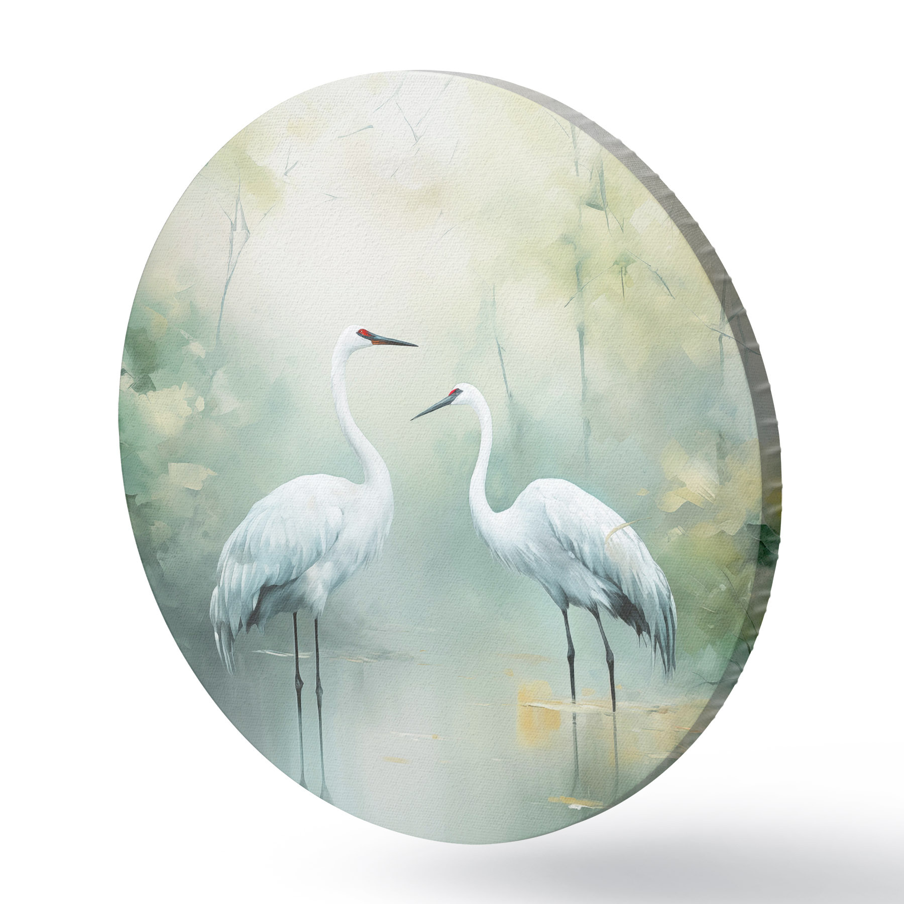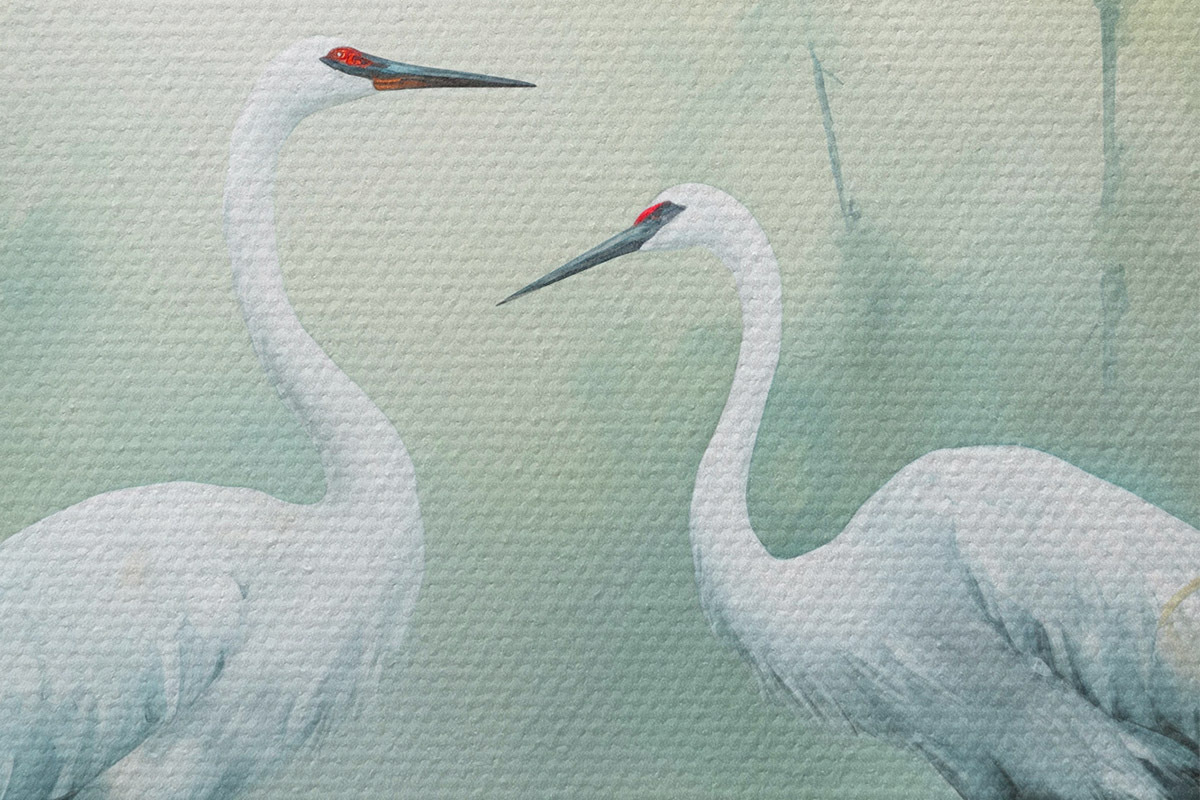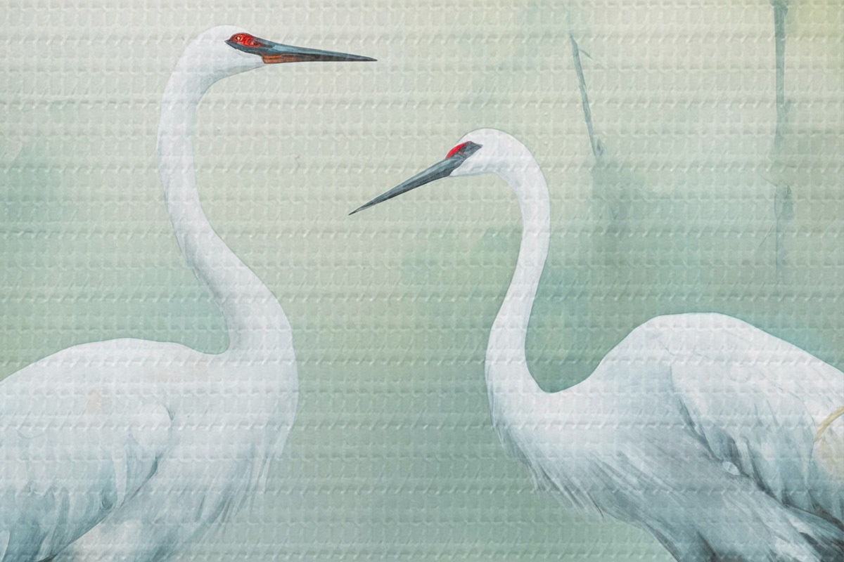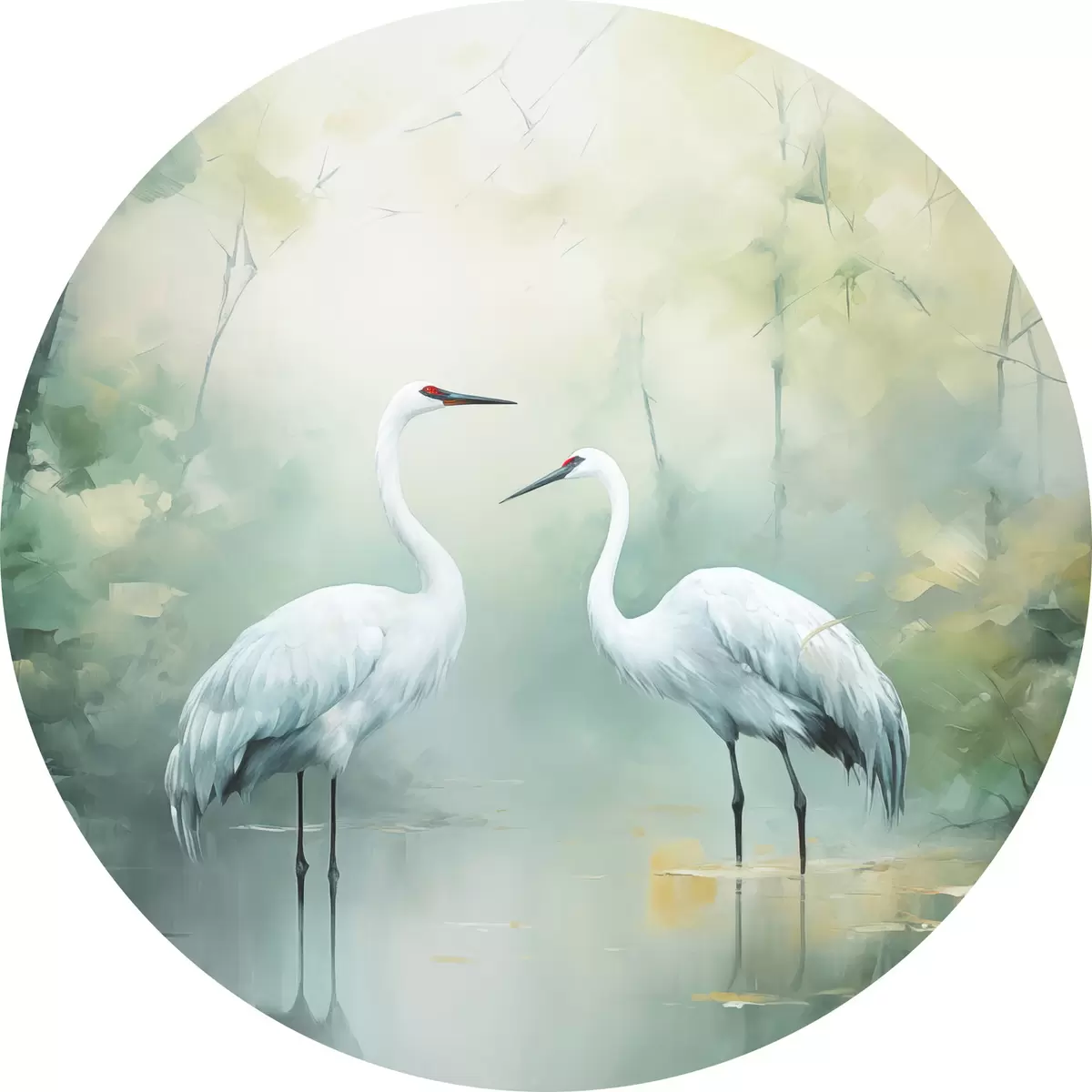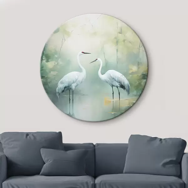 Pilt Kaks valget kraanat seisavad tiigis, mida ümbritseb lopsakas roheline mets pehme hajutatud valgusega Nr r43166