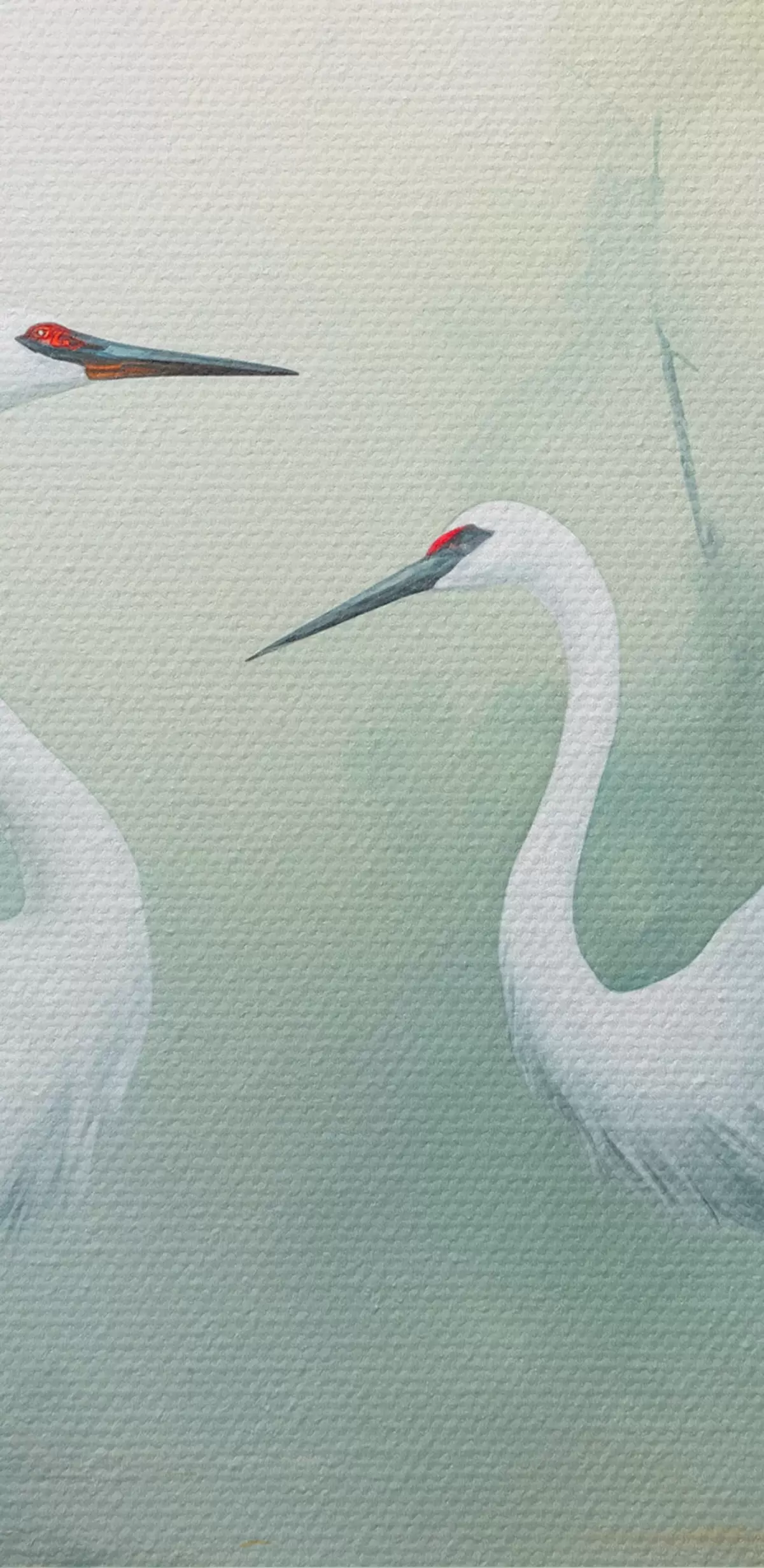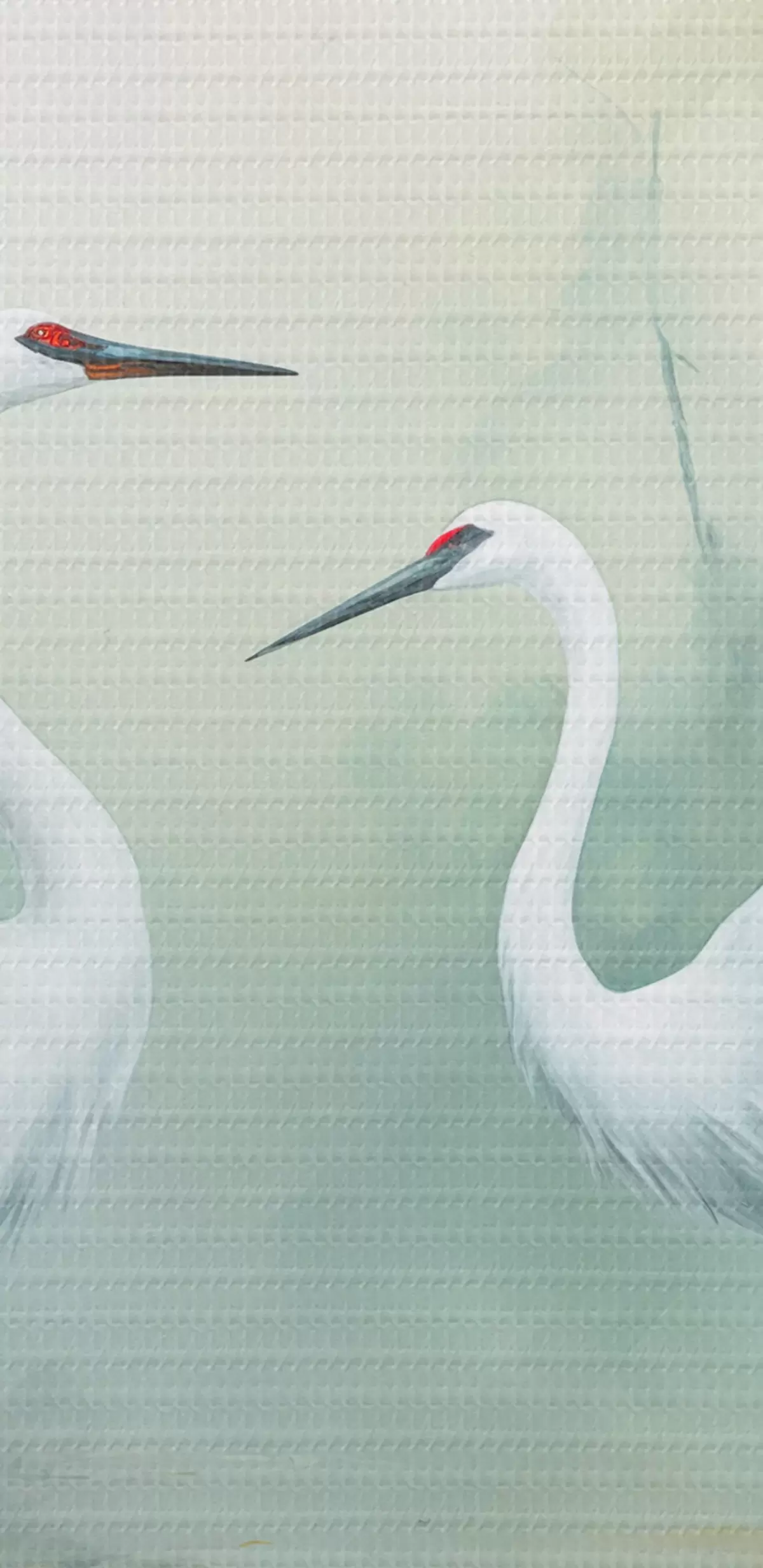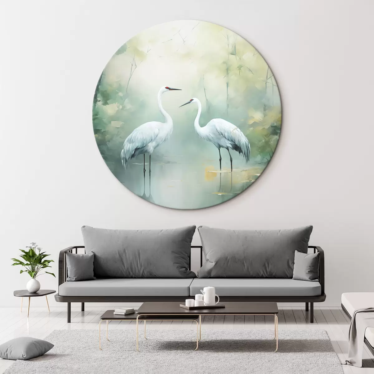 Pilt Kaks valget kraanat seisavad tiigis, mida ümbritseb lopsakas roheline mets pehme hajutatud valgusega Nr r43166