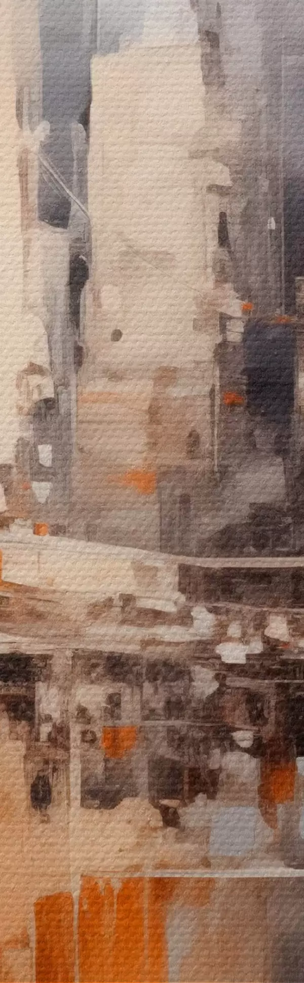 Pilt Abstraktne linnapilt, kus kõrged hooned on pruunide, hallide ja valgete toonidega, mis peegelduvad allolevas vees Nr r43168
