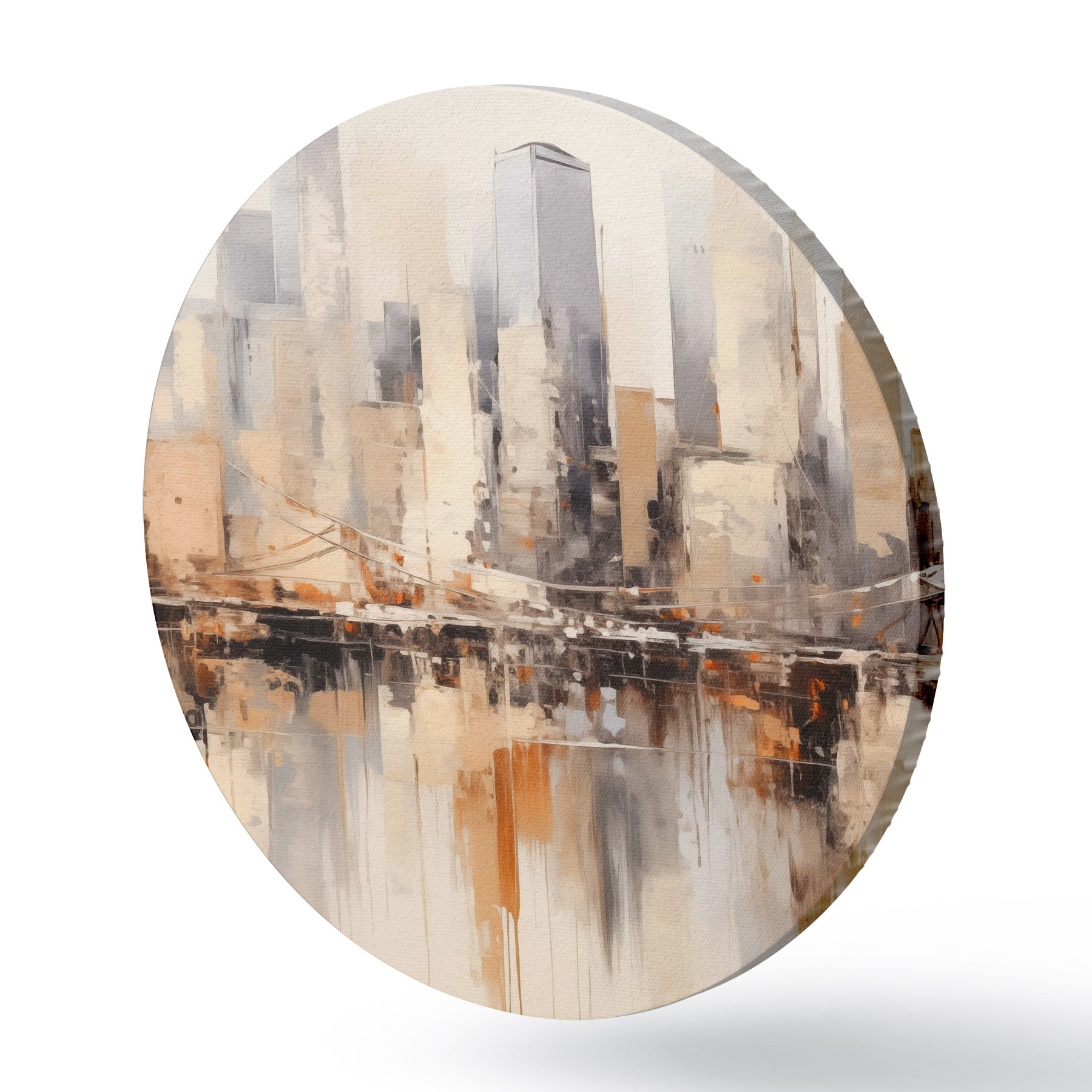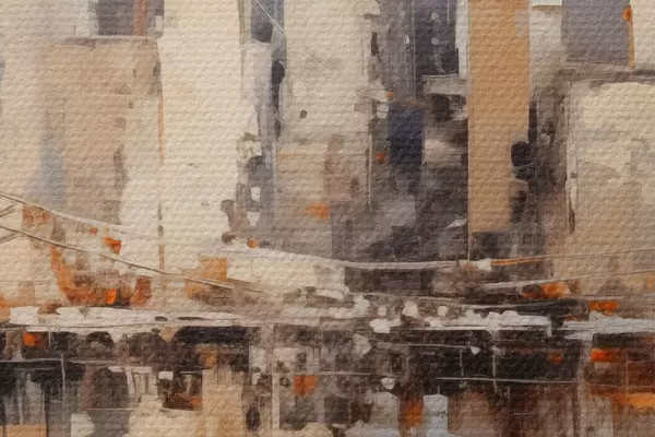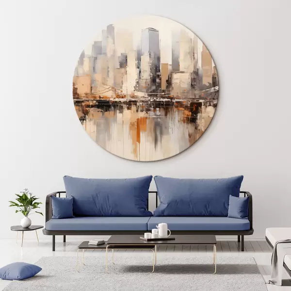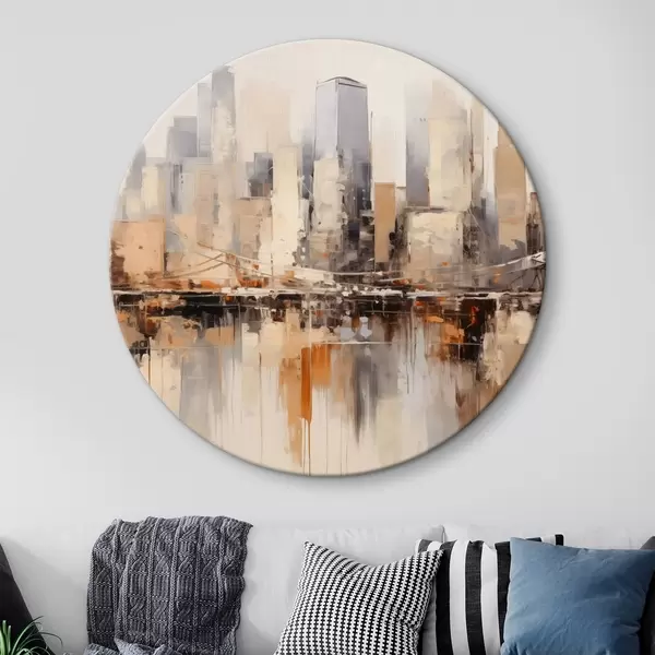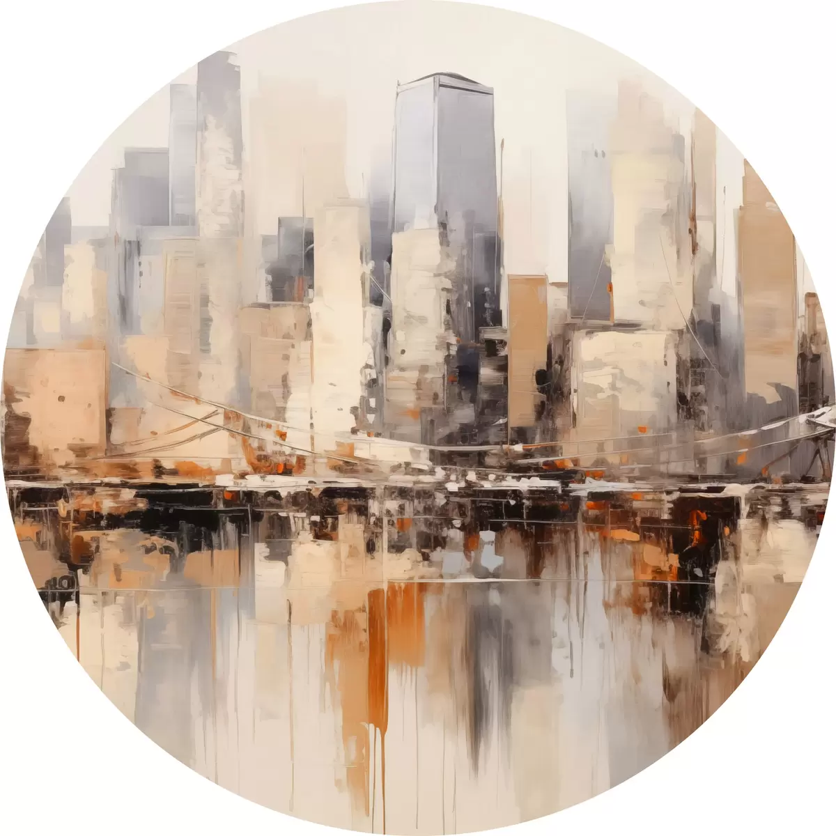 Pilt Abstraktne linnapilt, kus kõrged hooned on pruunide, hallide ja valgete toonidega, mis peegelduvad allolevas vees Nr r43168