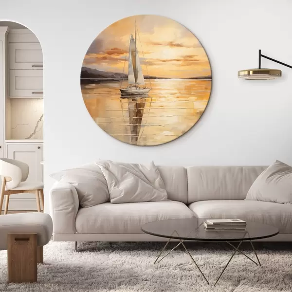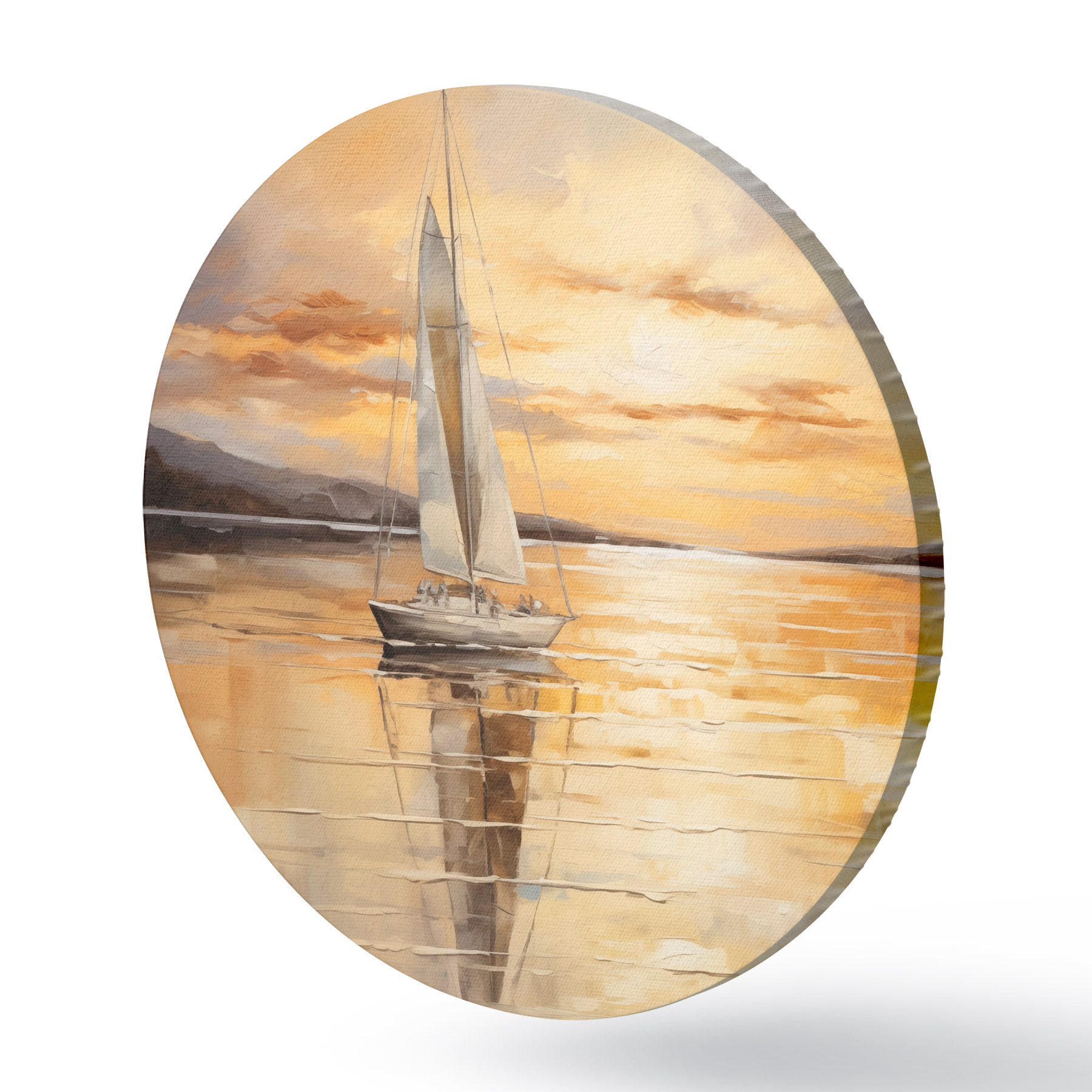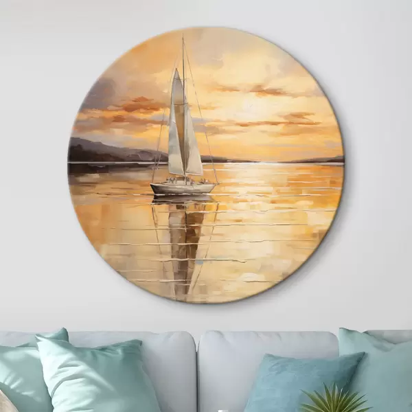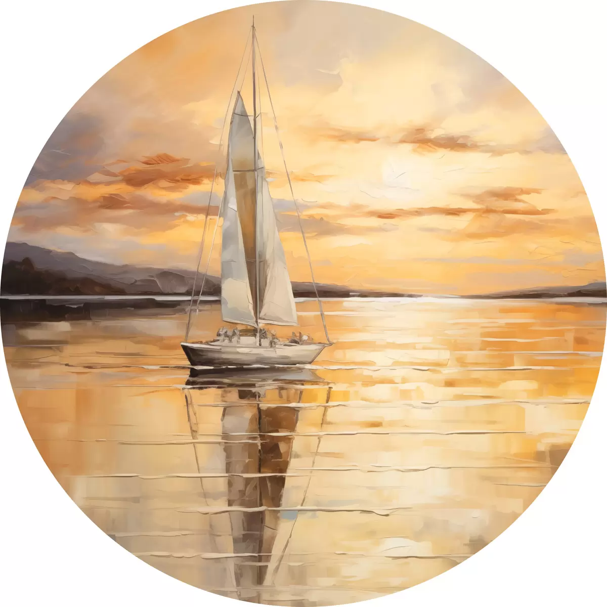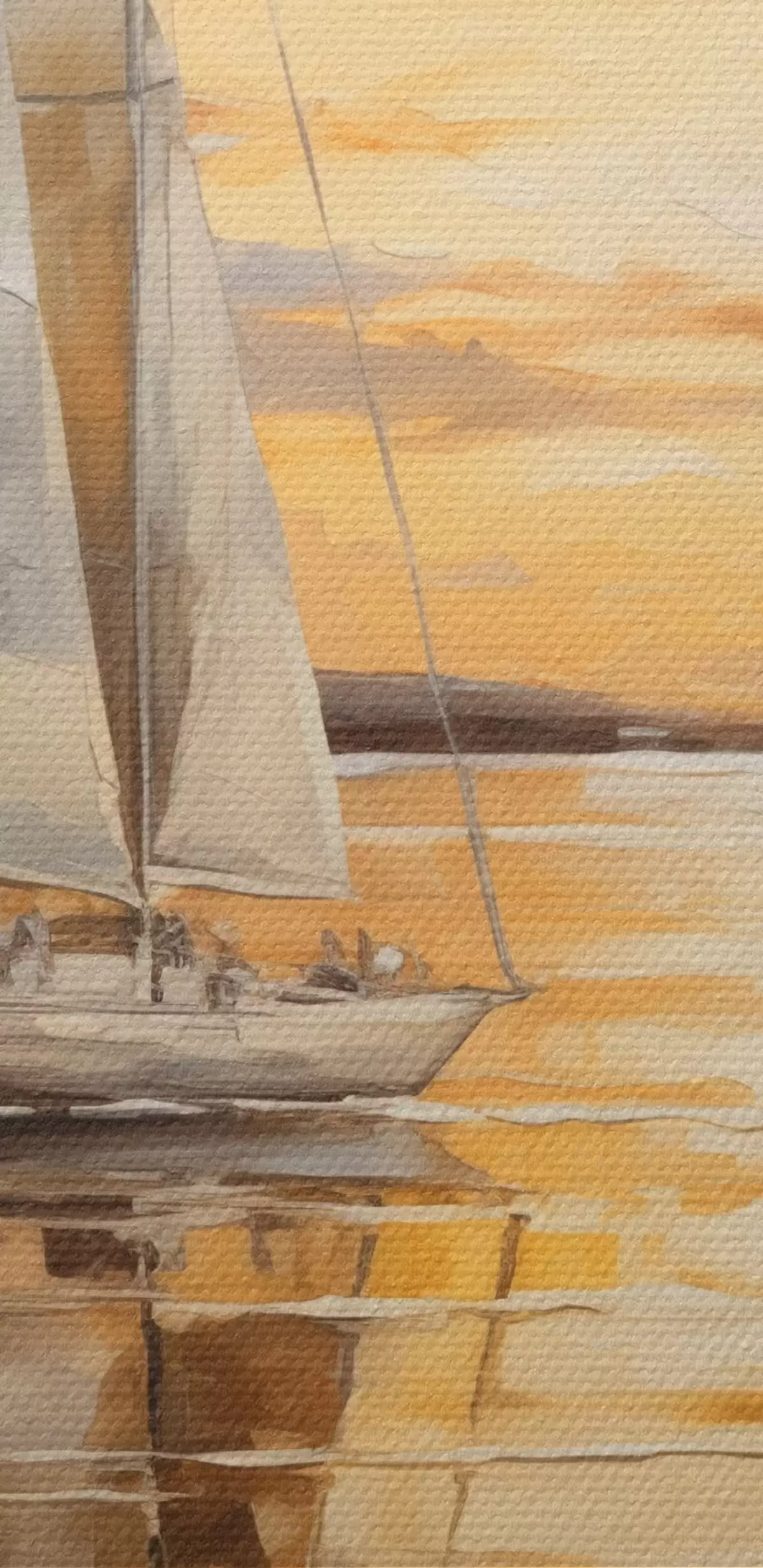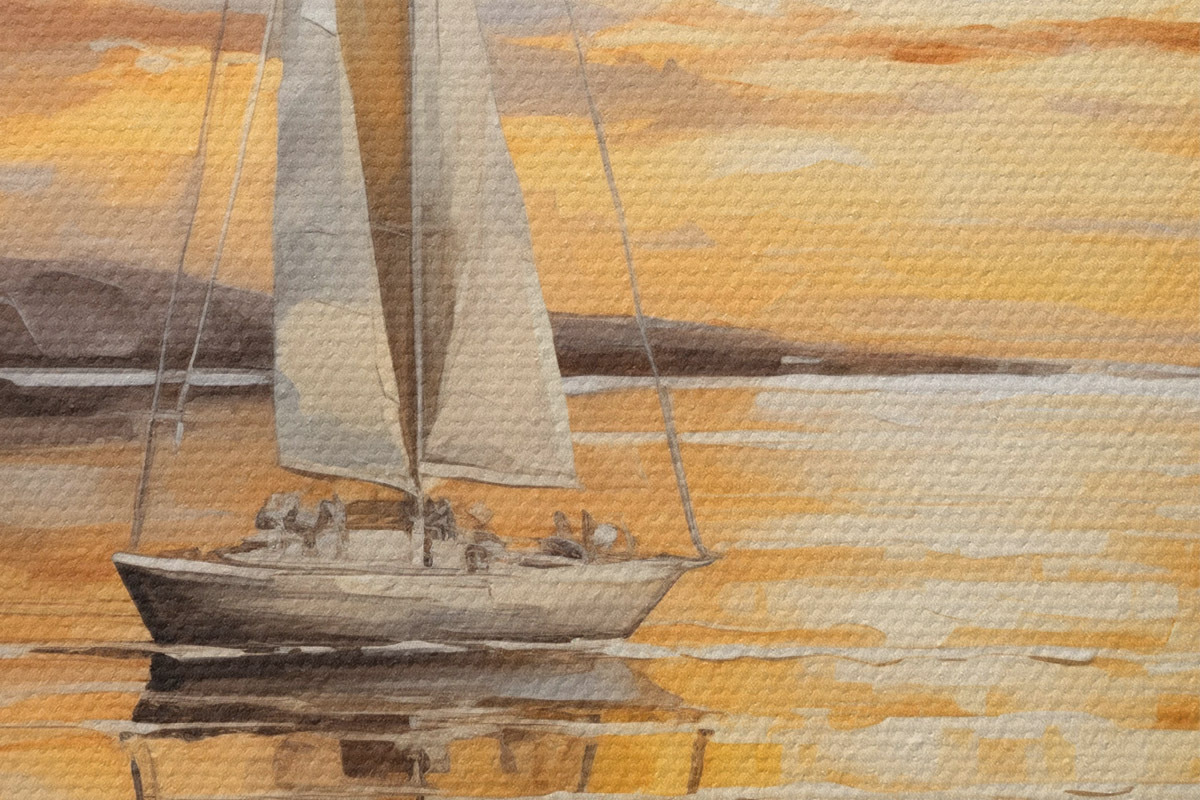 Pilt Maastikumaal koos purjekaga rahulikul merel, oranžikas ja kollane taevas, kauged mäed Nr r43169