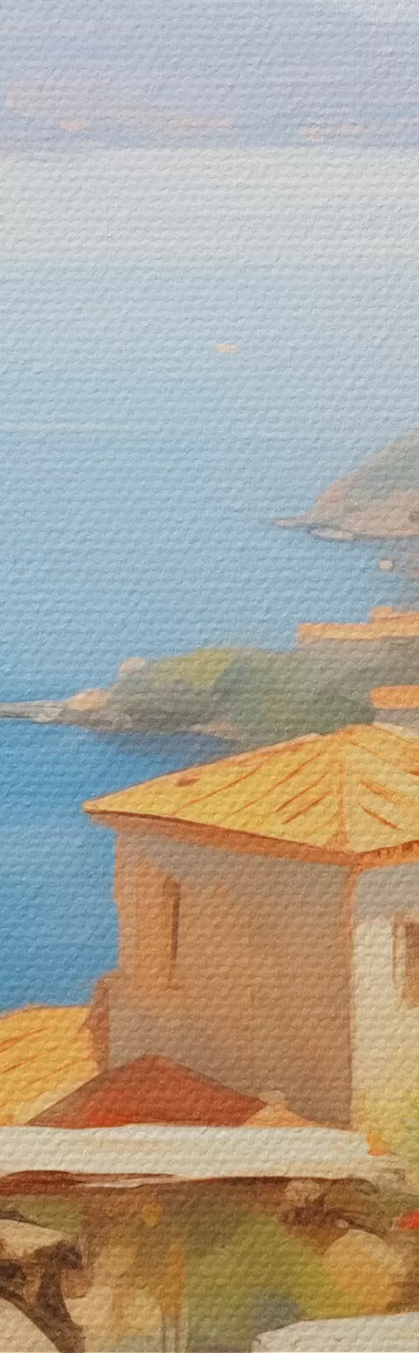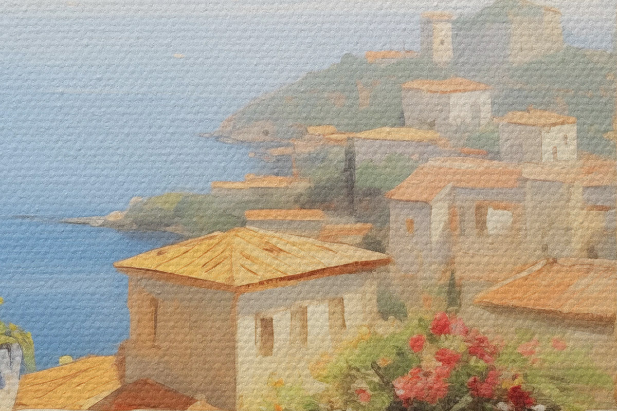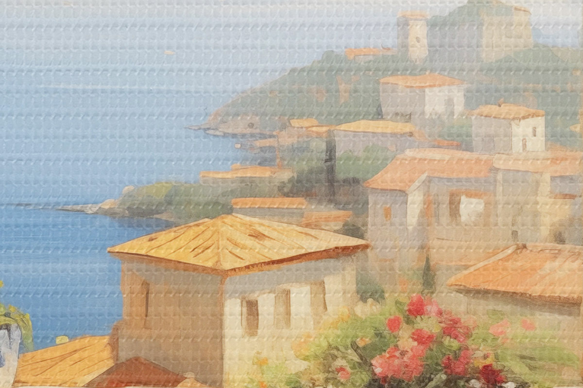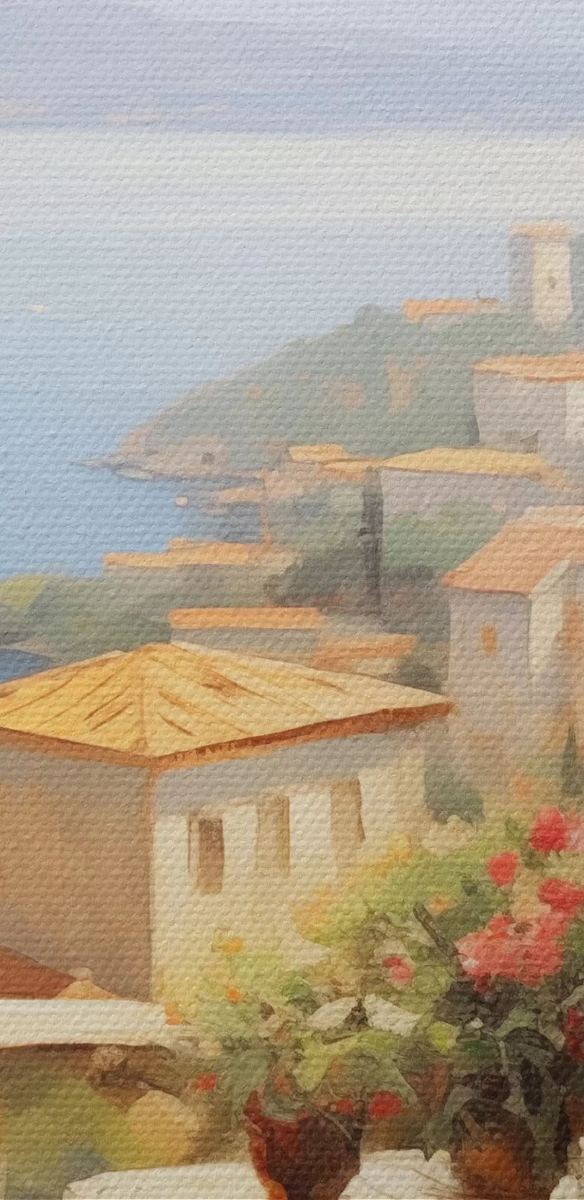 Pilt Õlimaal imitatsioon rõdu lilledega, vaatega merele, majad rannikul, päikesepaisteline päev, sinine taevas Nr r43173