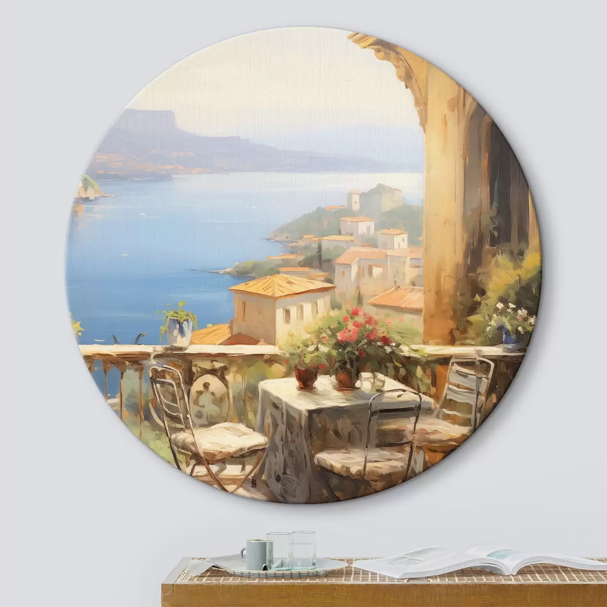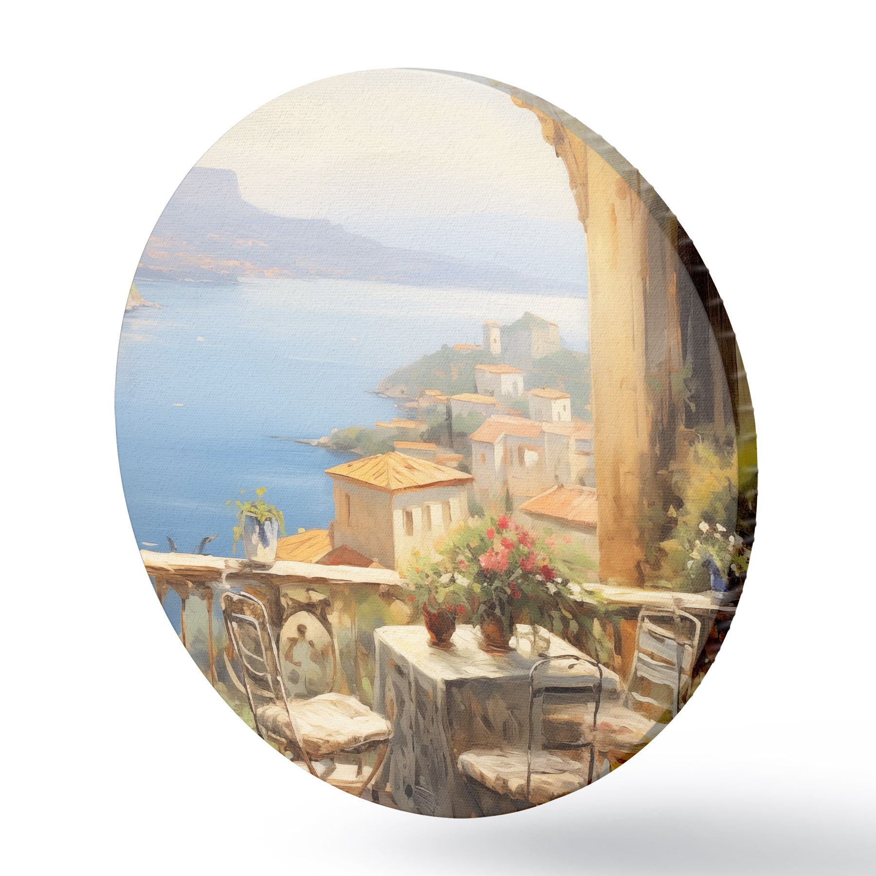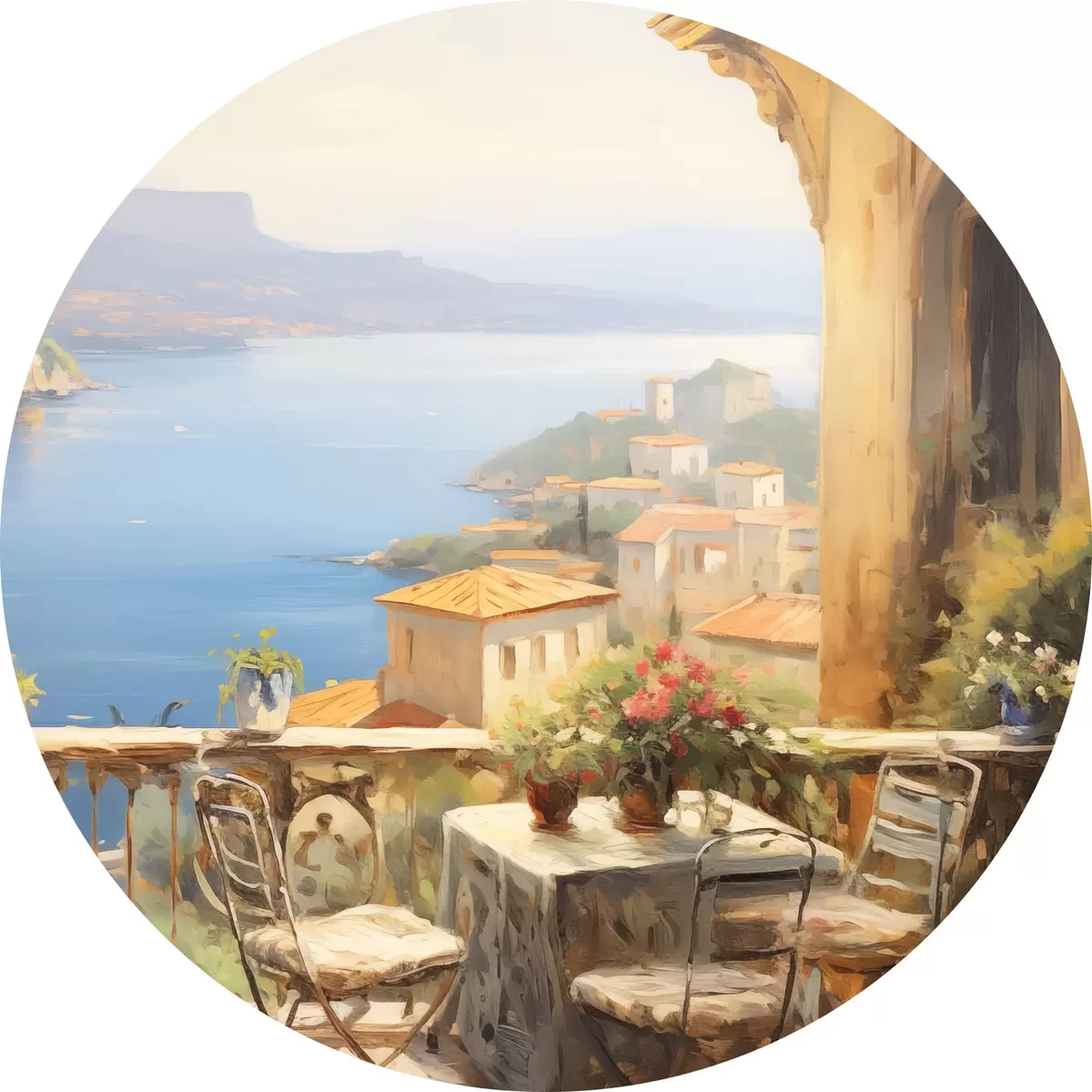 Pilt Õlimaal imitatsioon rõdu lilledega, vaatega merele, majad rannikul, päikesepaisteline päev, sinine taevas Nr r43173