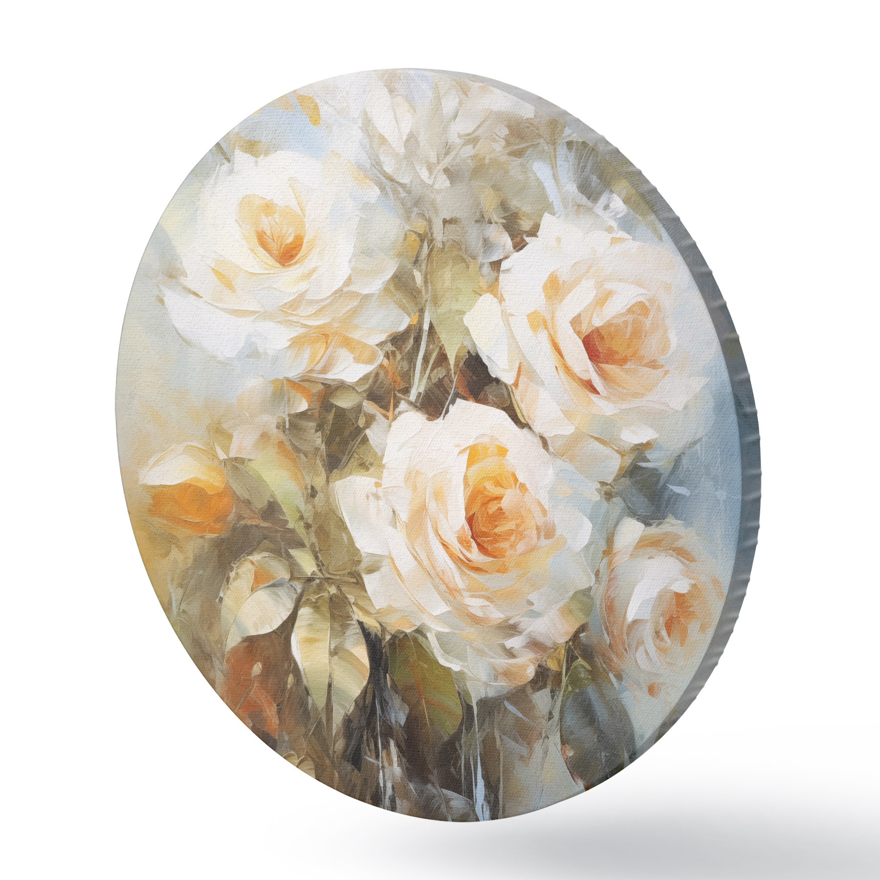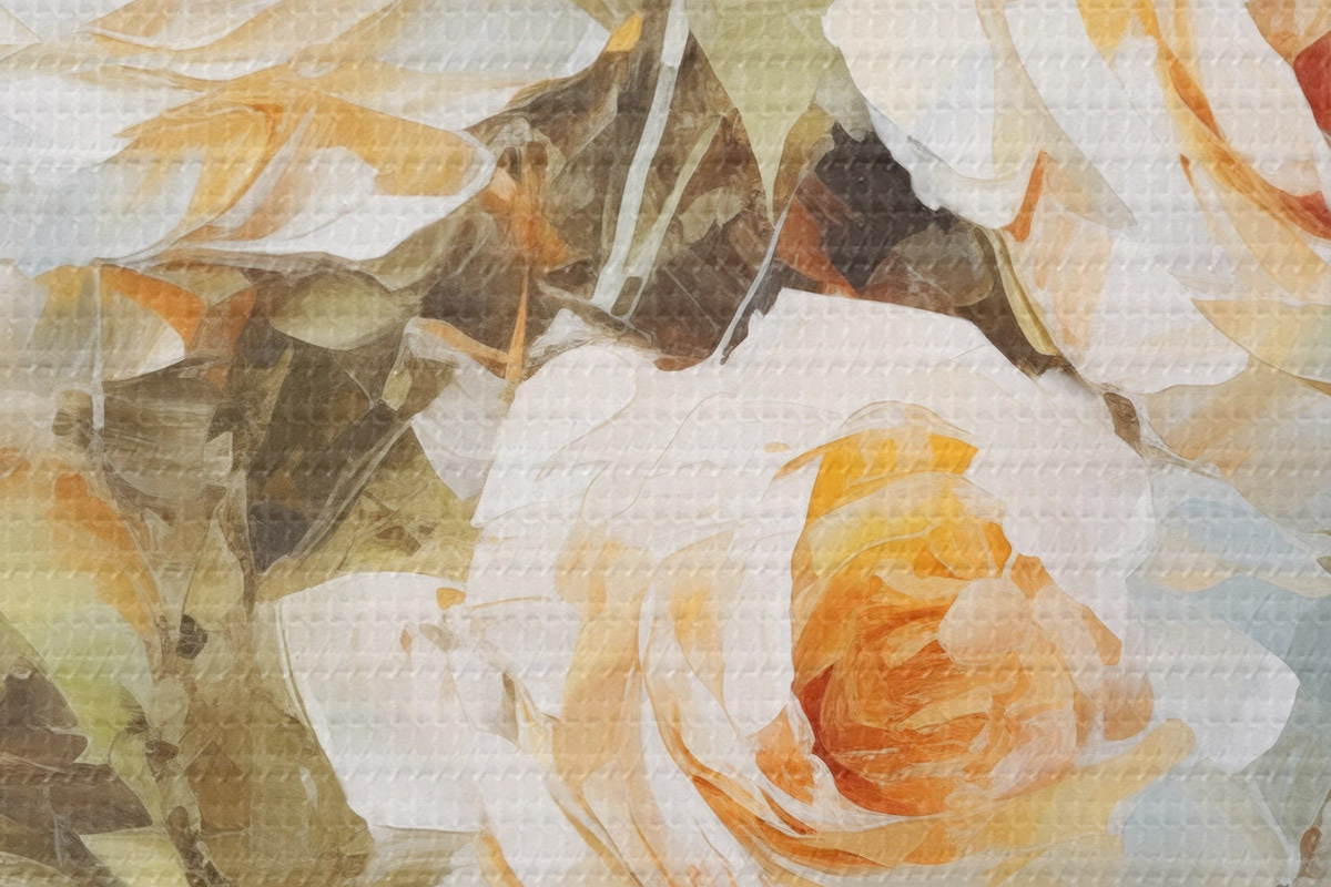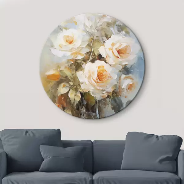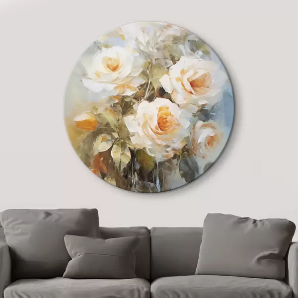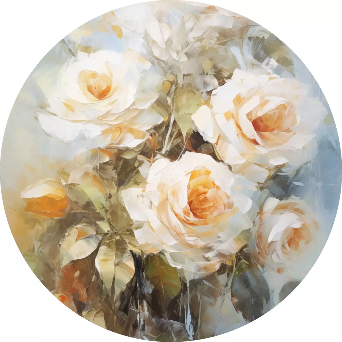 Pilt Valged roosid koos oranžiga, pehmel helesinisel taustal, nähtava pintslitõmbega ja maalikunstniku stiiliga Nr r43175