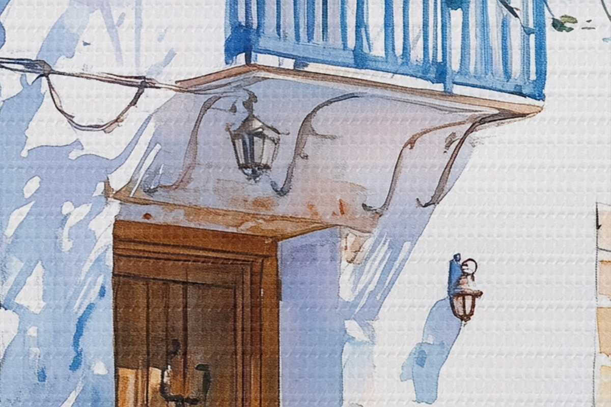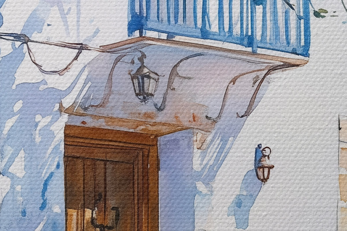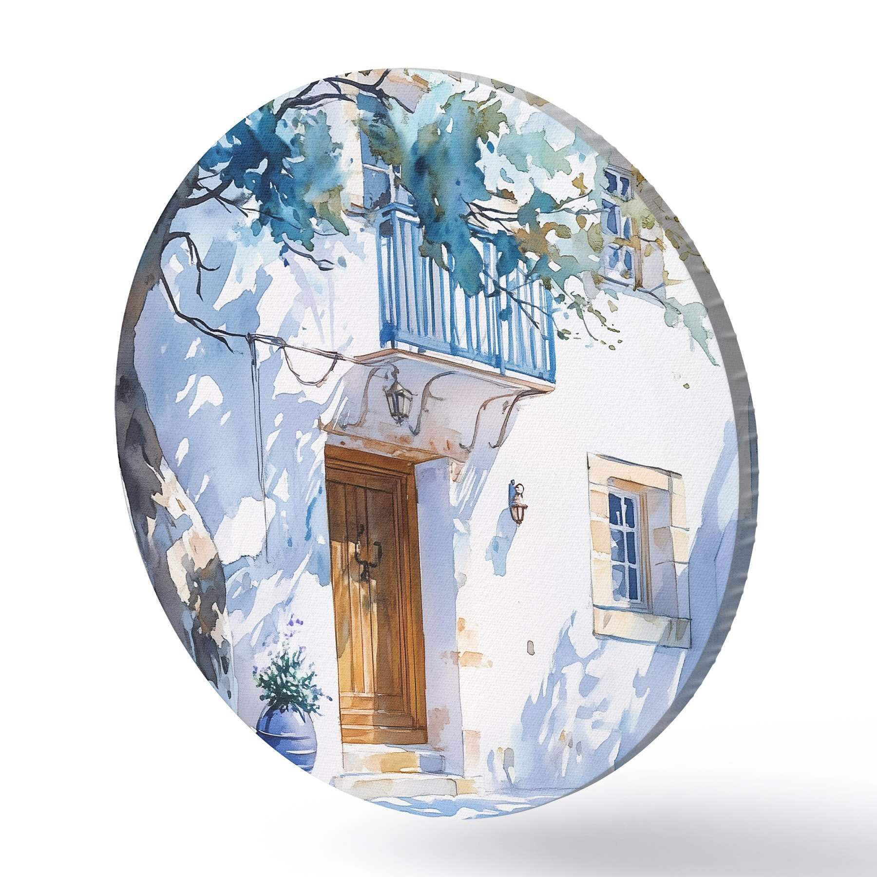 Pilt Akvarellstiil, kreeka maja, õitsev puu, arhitektuur Nr r43182