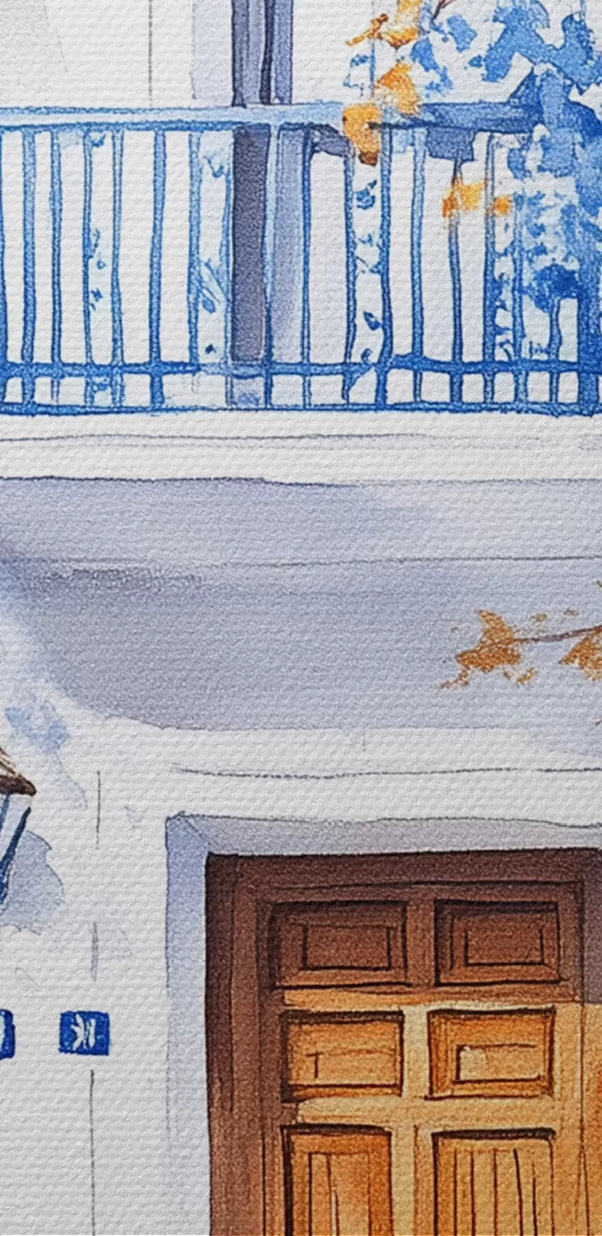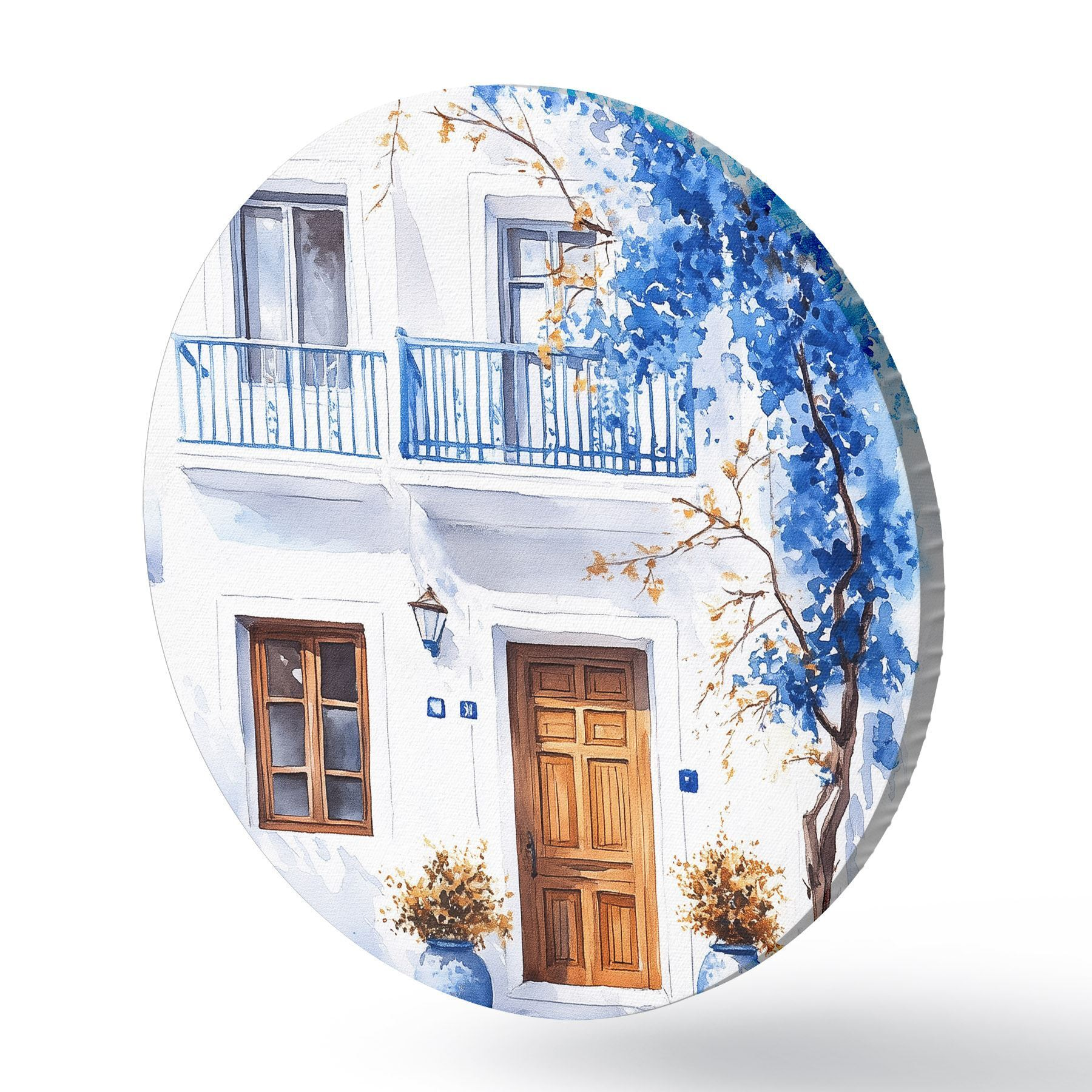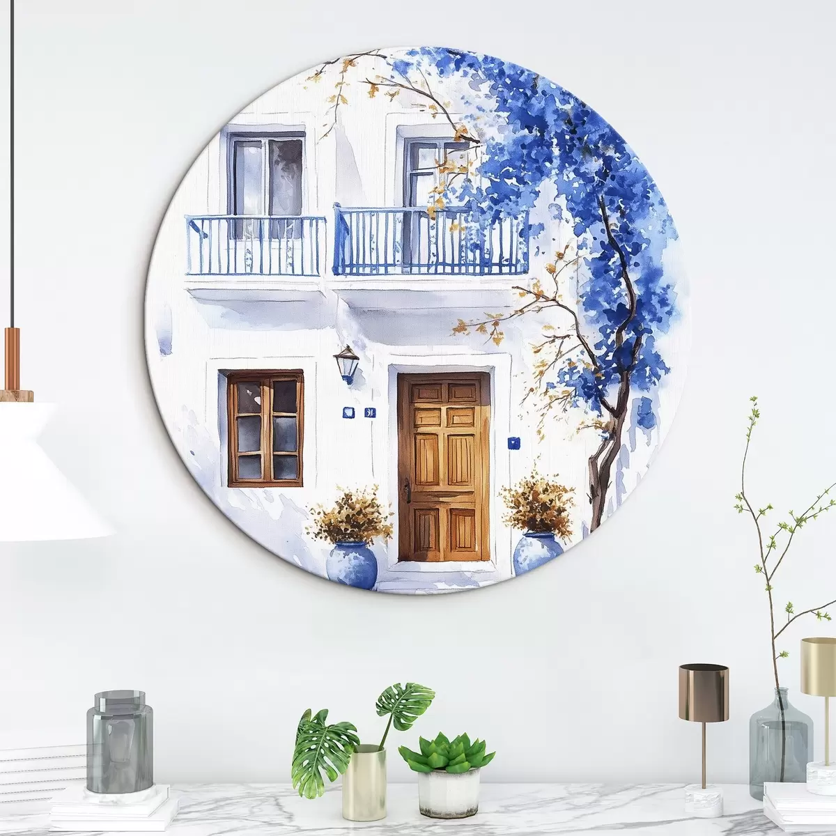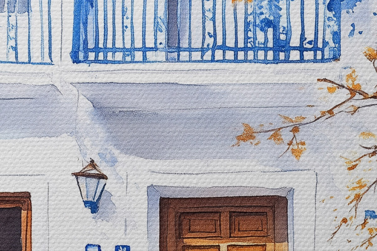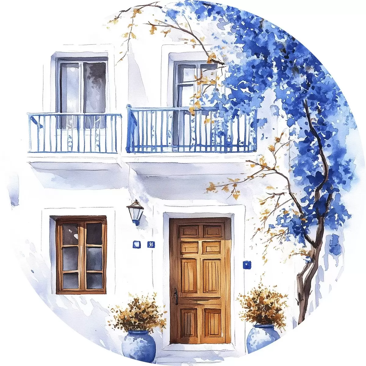 Pilt Siniste lilledega õitsev puu, valge maja, Kreeka, akvarellstiilis Nr r43183