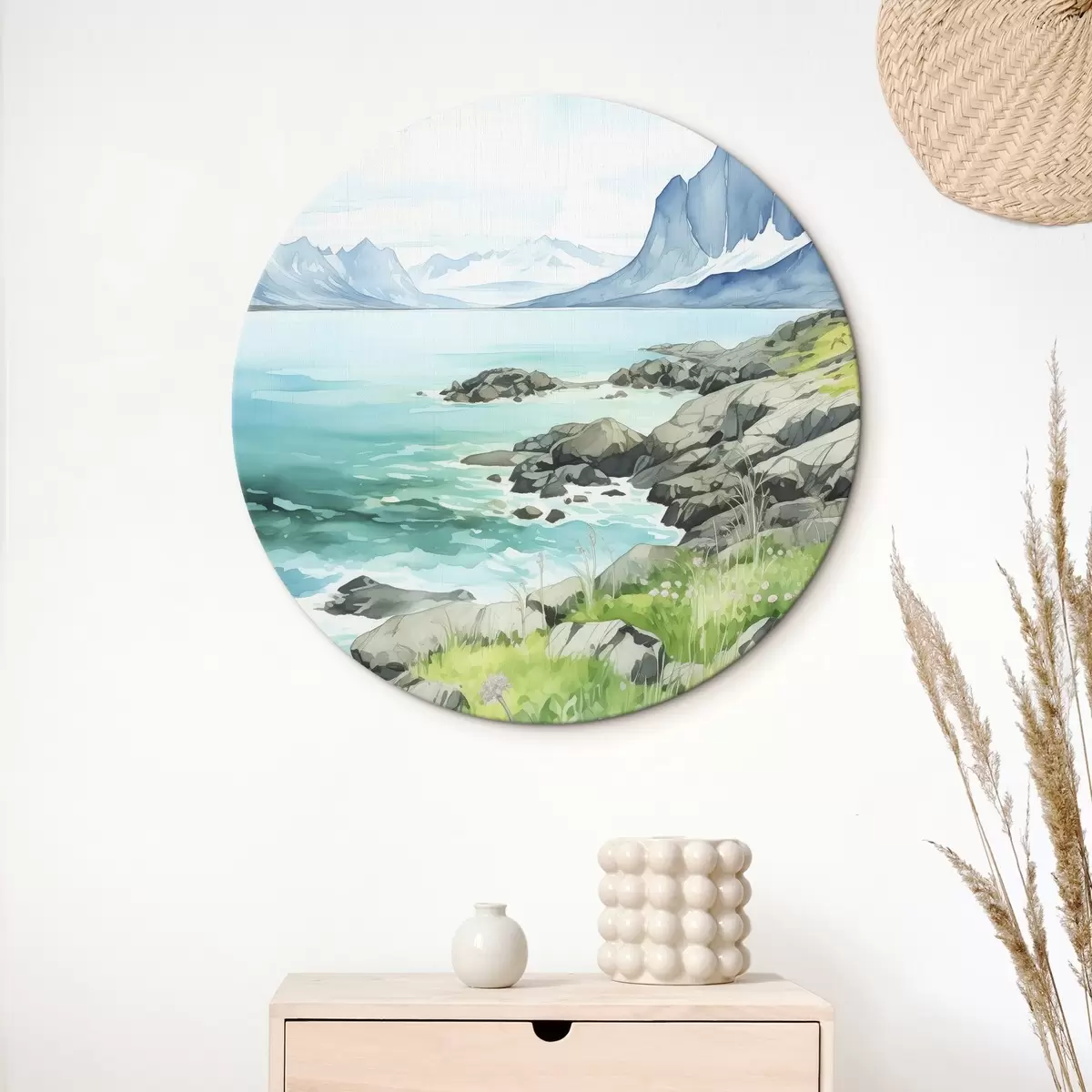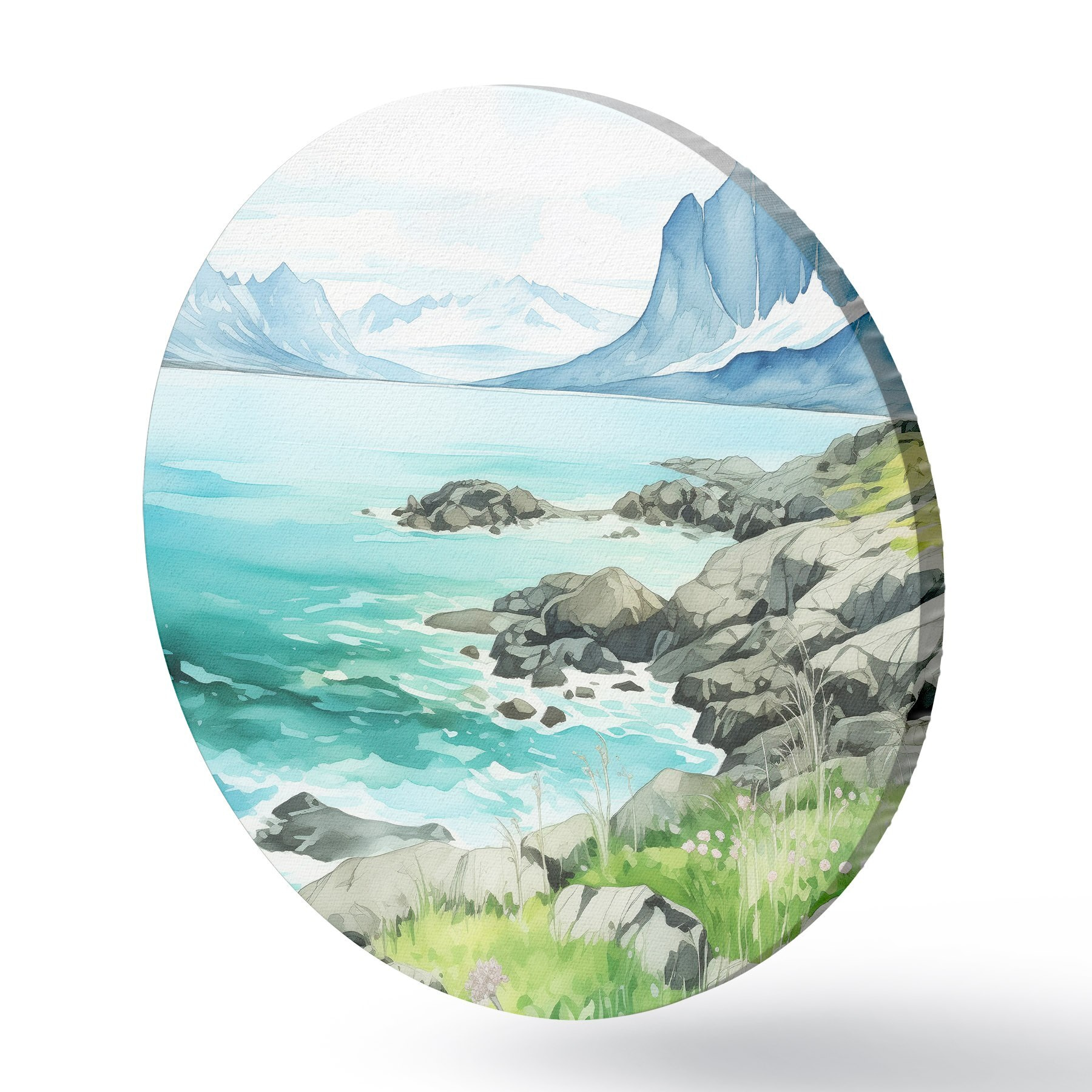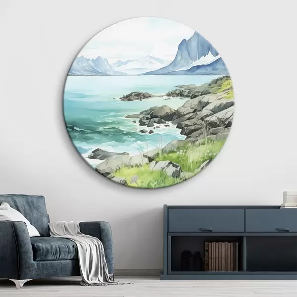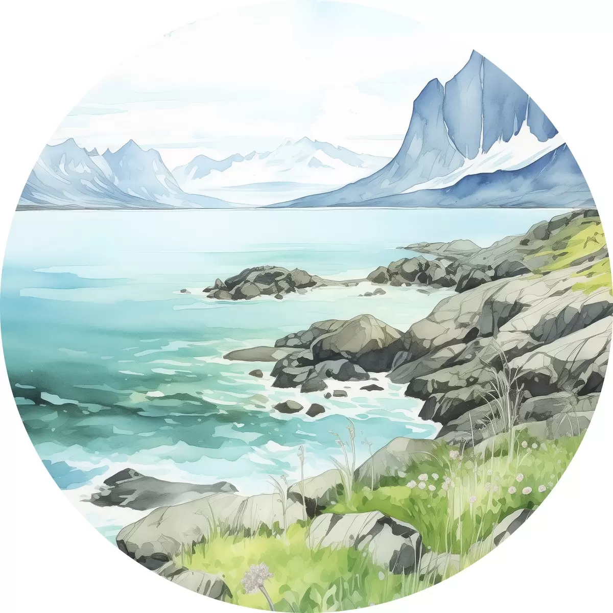 Pilt Norra loodus, fjordid, suvine maastik, roheline rohi, mäed, akvarellstiil Nr r43188