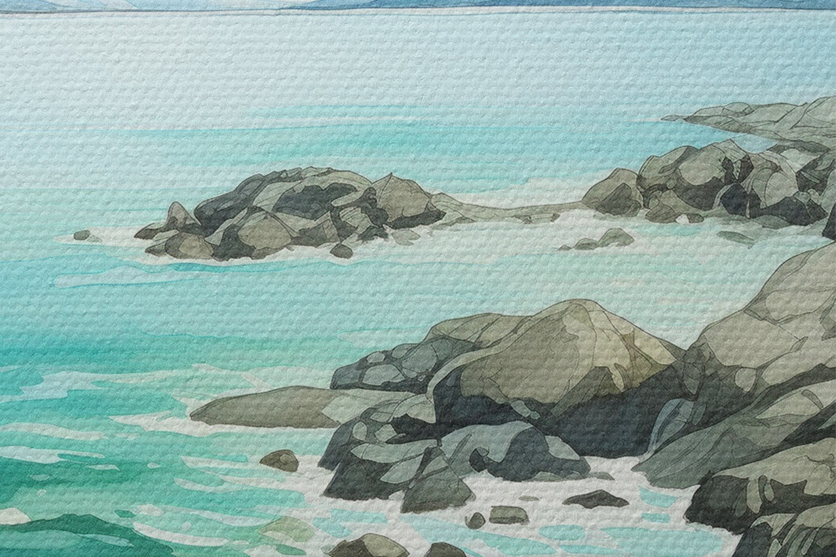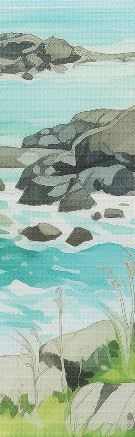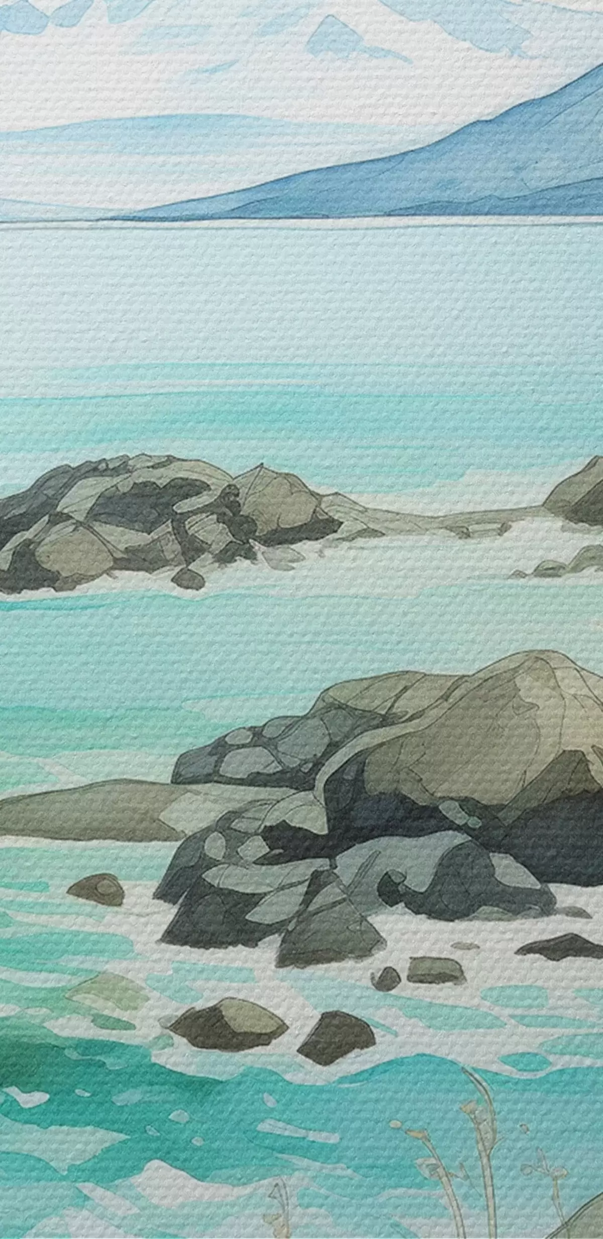 Pilt Norra loodus, fjordid, suvine maastik, roheline rohi, mäed, akvarellstiil Nr r43188