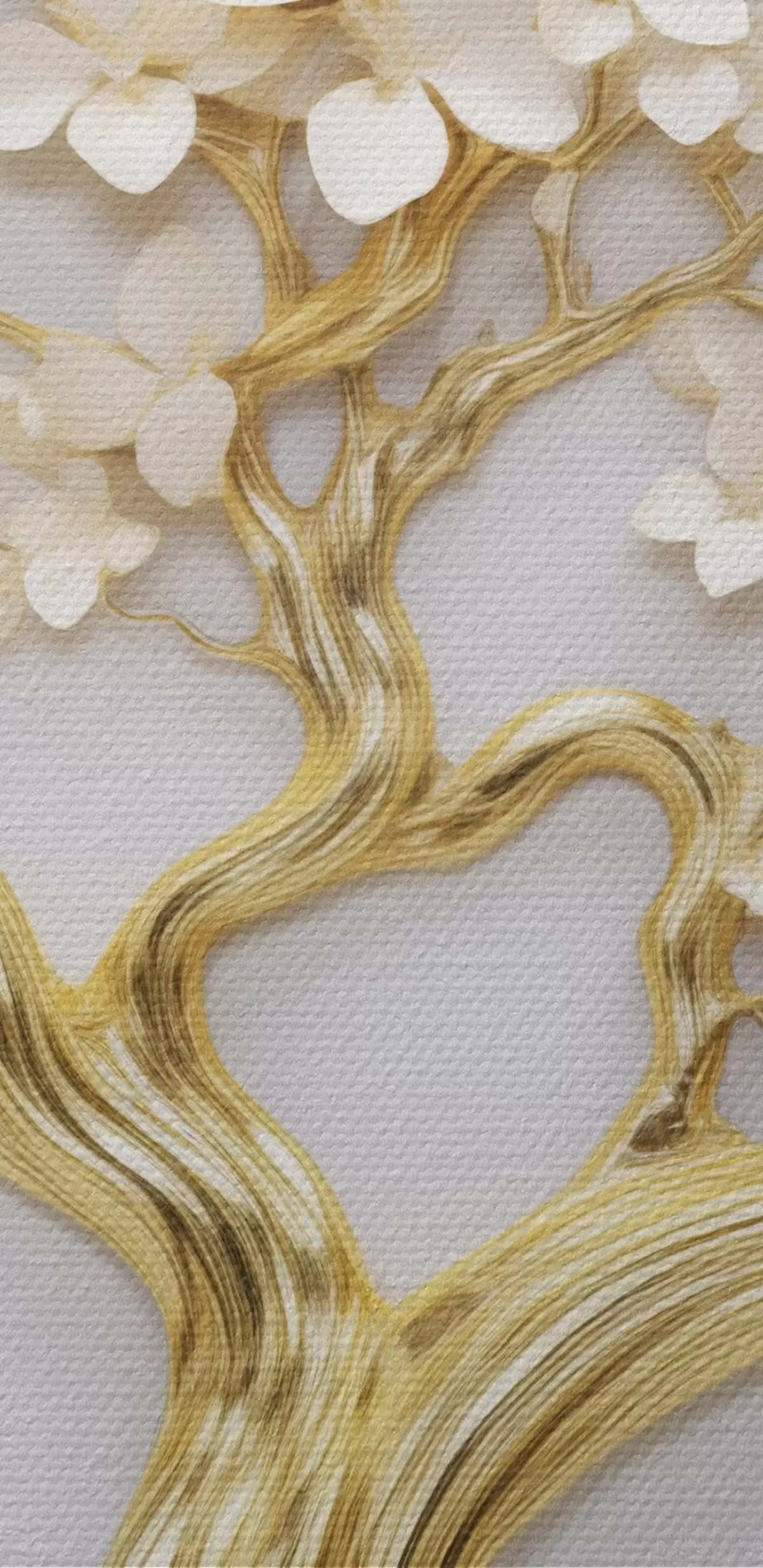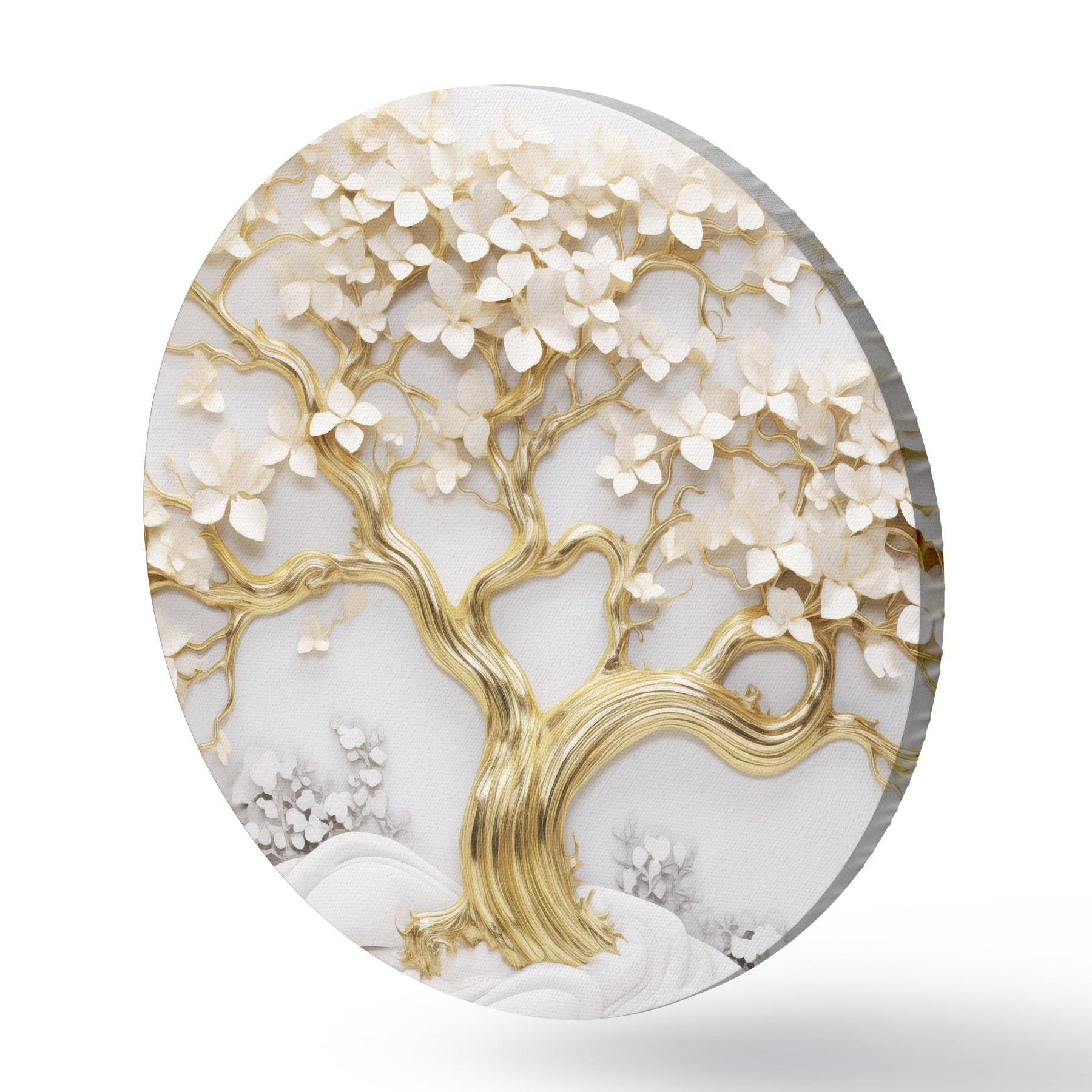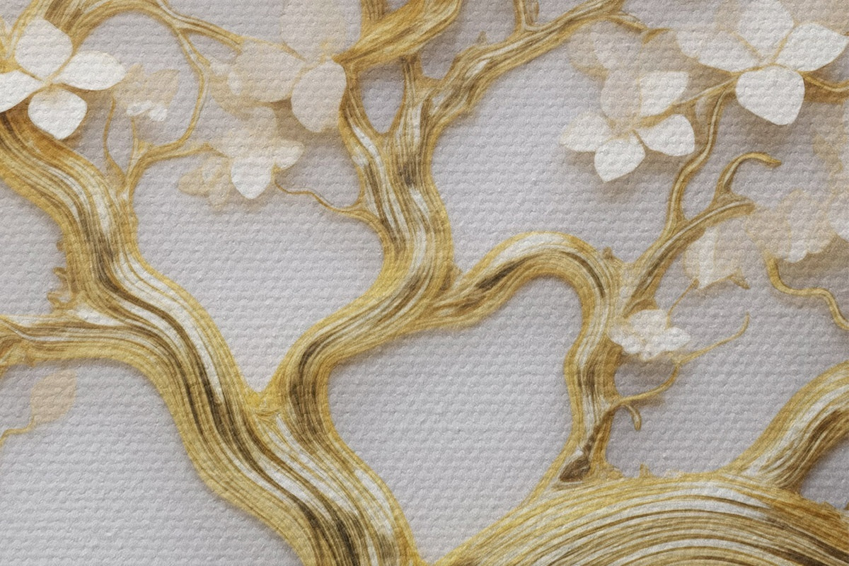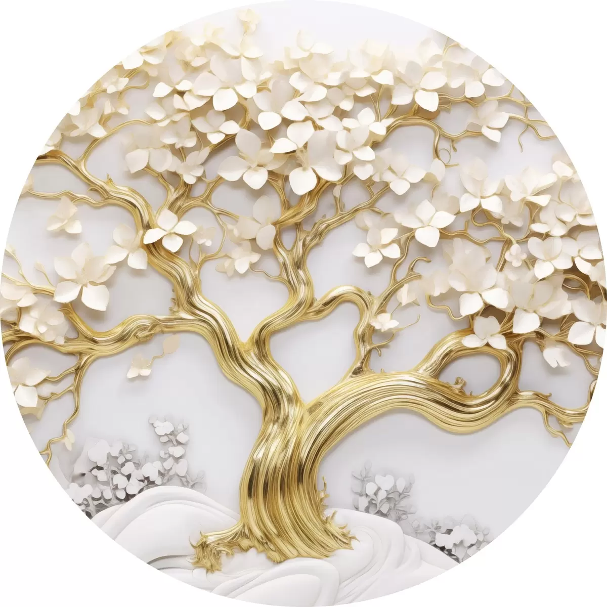 Pilt Dekoratiivne puu valgete lilledega, valge taust, valged kivid, keerulised detailid, loodusest inspireeritud kunst Nr r43388