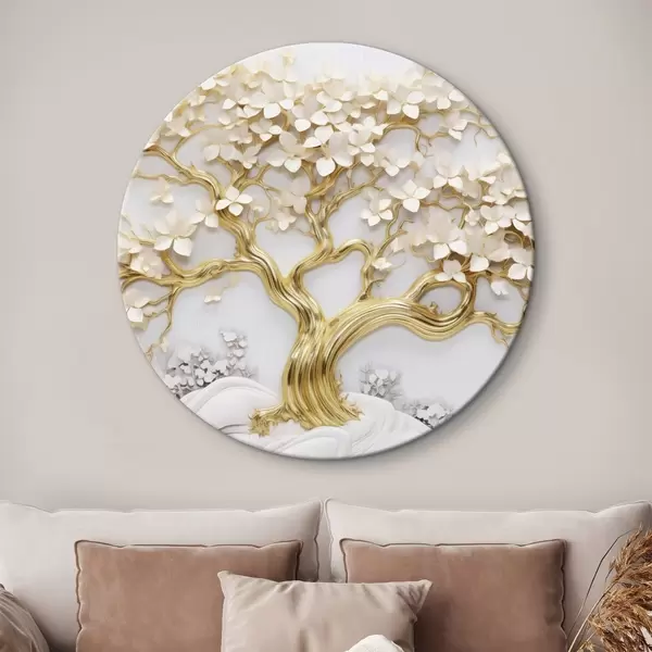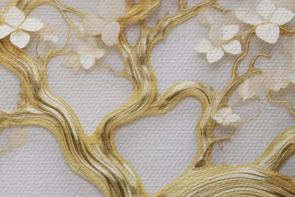 Pilt Dekoratiivne puu valgete lilledega, valge taust, valged kivid, keerulised detailid, loodusest inspireeritud kunst Nr r43388