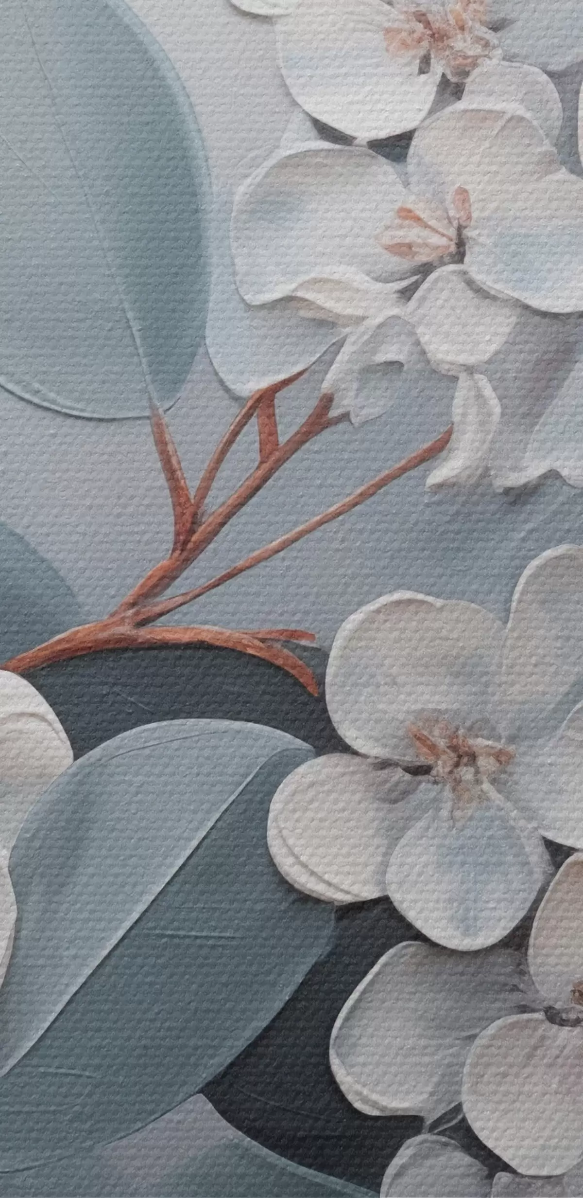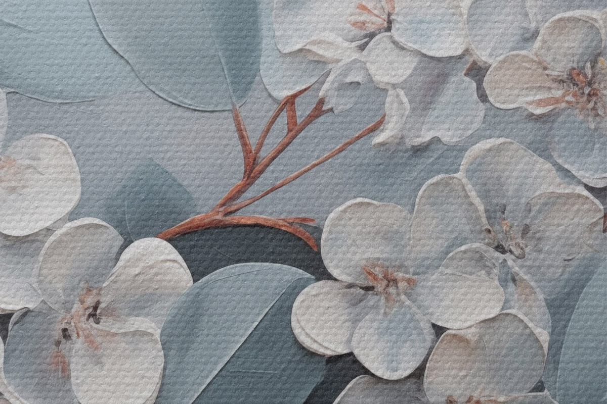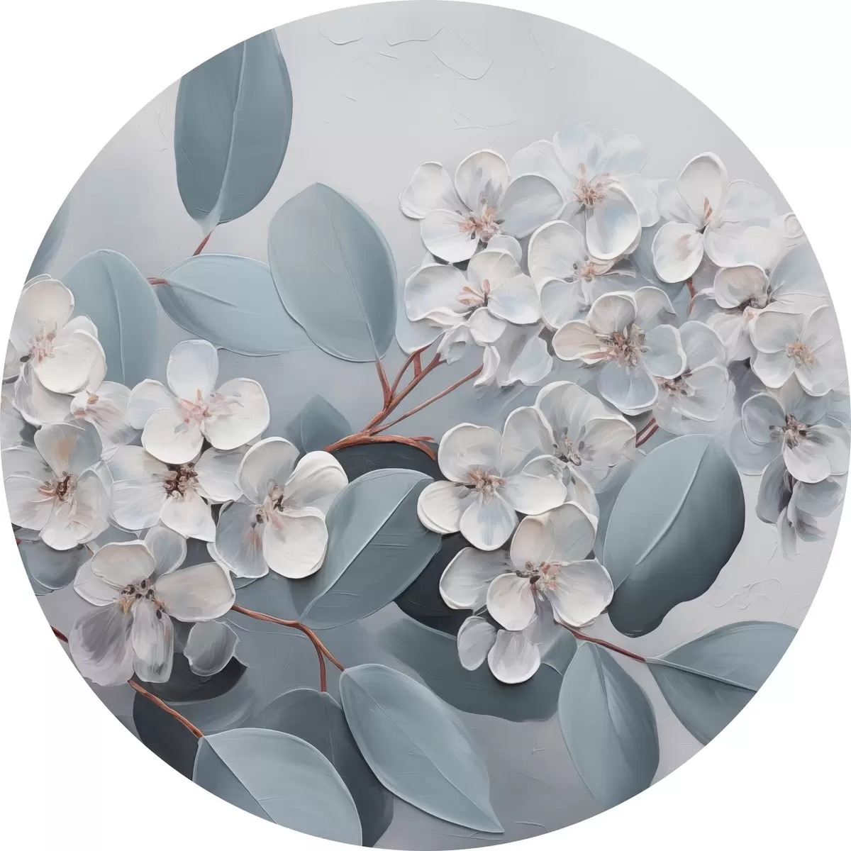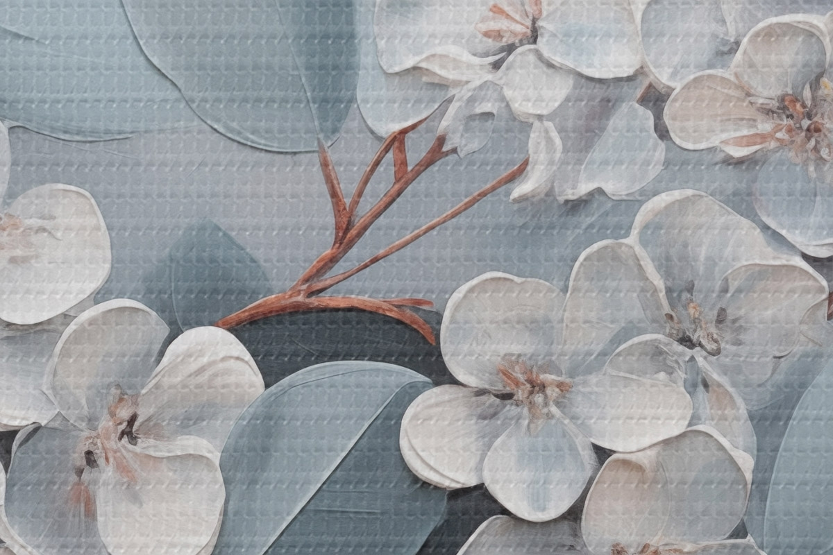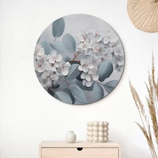 Pilt Oksas valge hortensialillede täies õitsengus, siniste lehtedega helehallil taustal, õlimaal stiilis Nr r43391