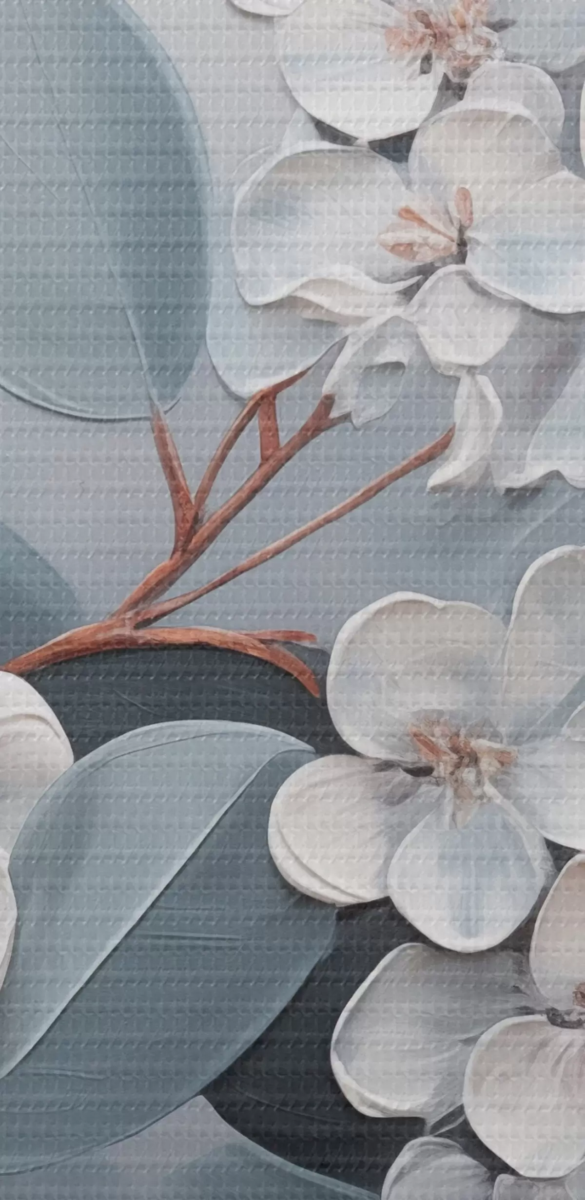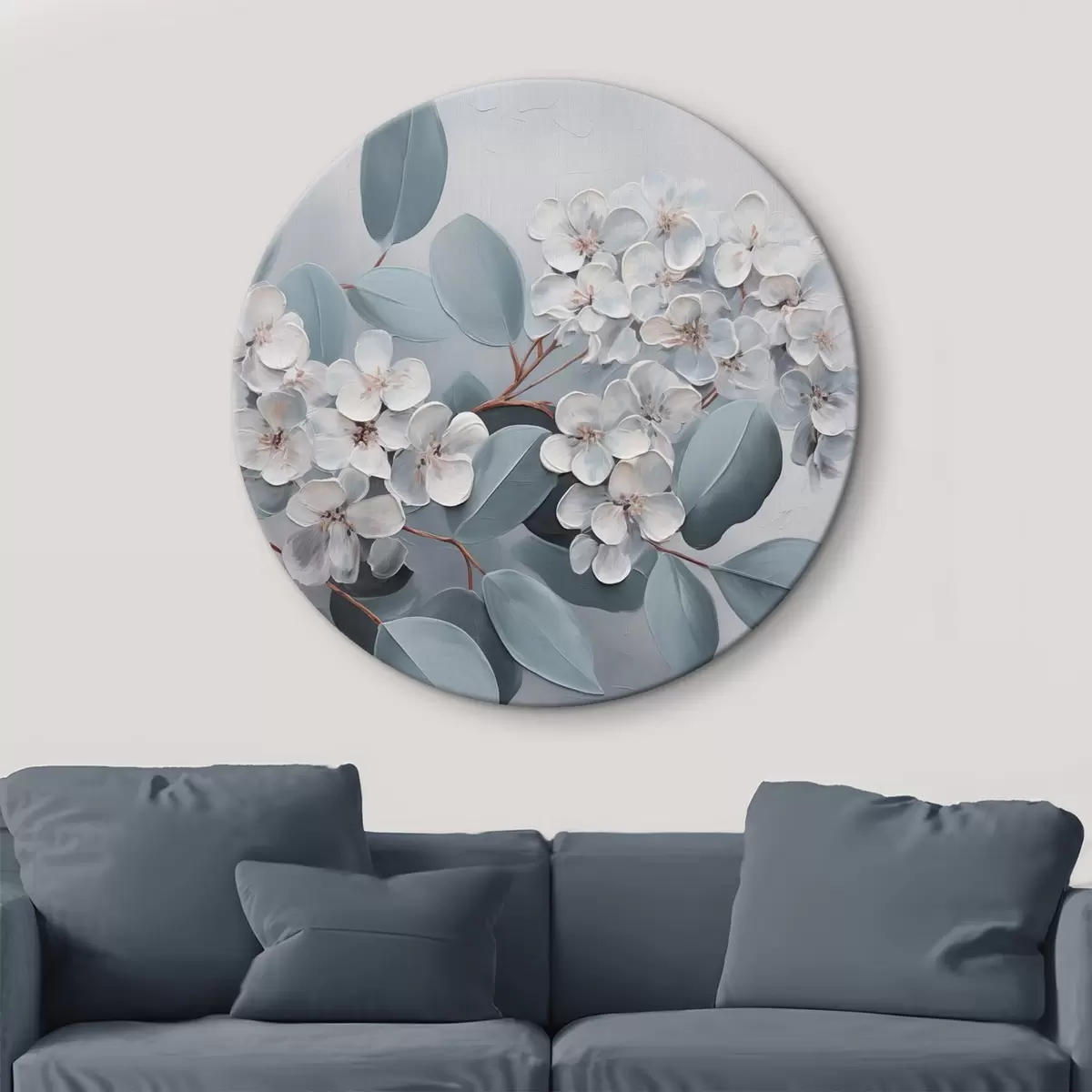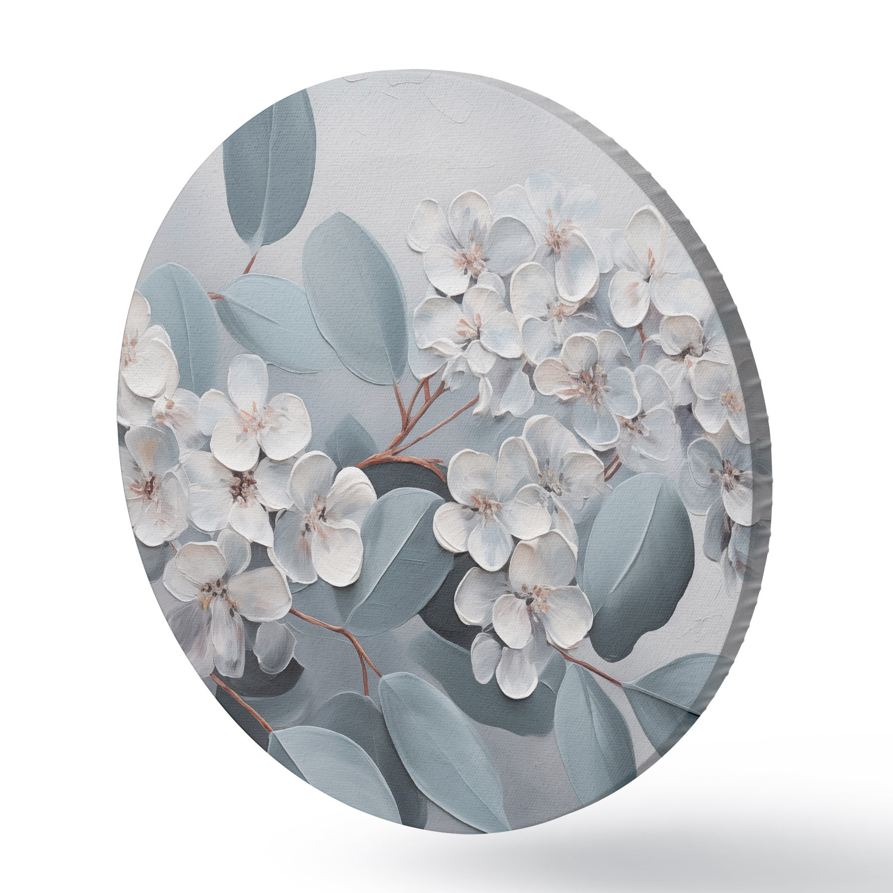 Pilt Oksas valge hortensialillede täies õitsengus, siniste lehtedega helehallil taustal, õlimaal stiilis Nr r43391