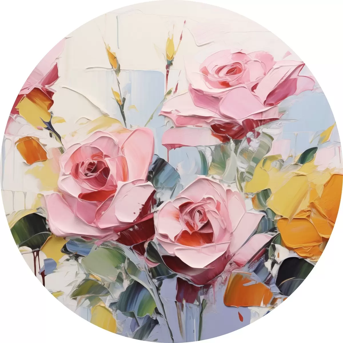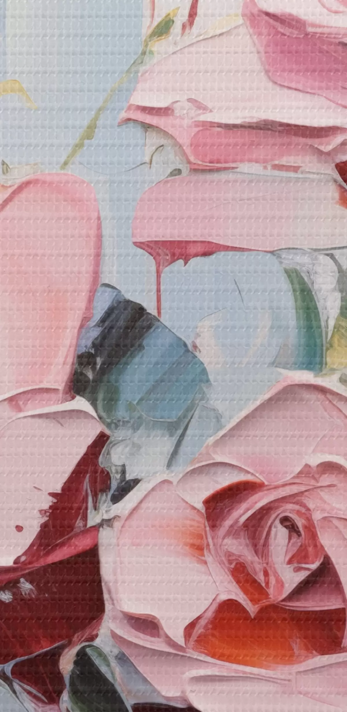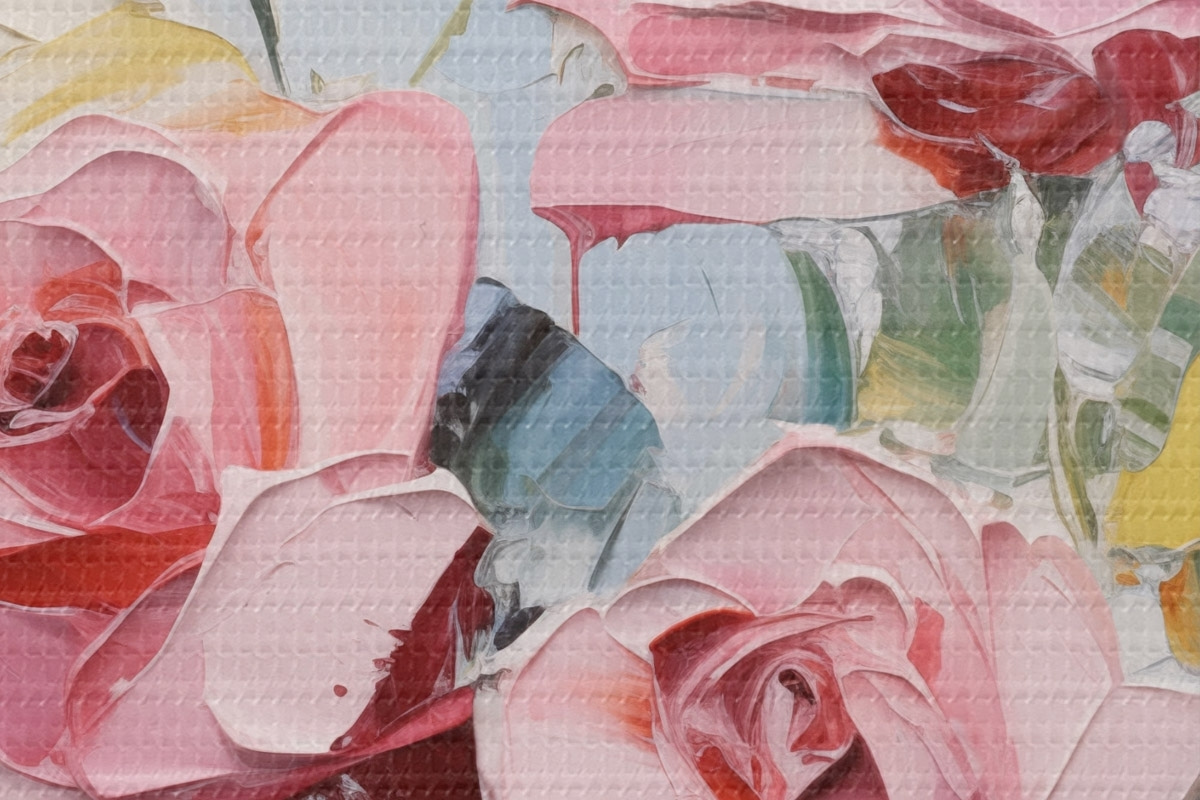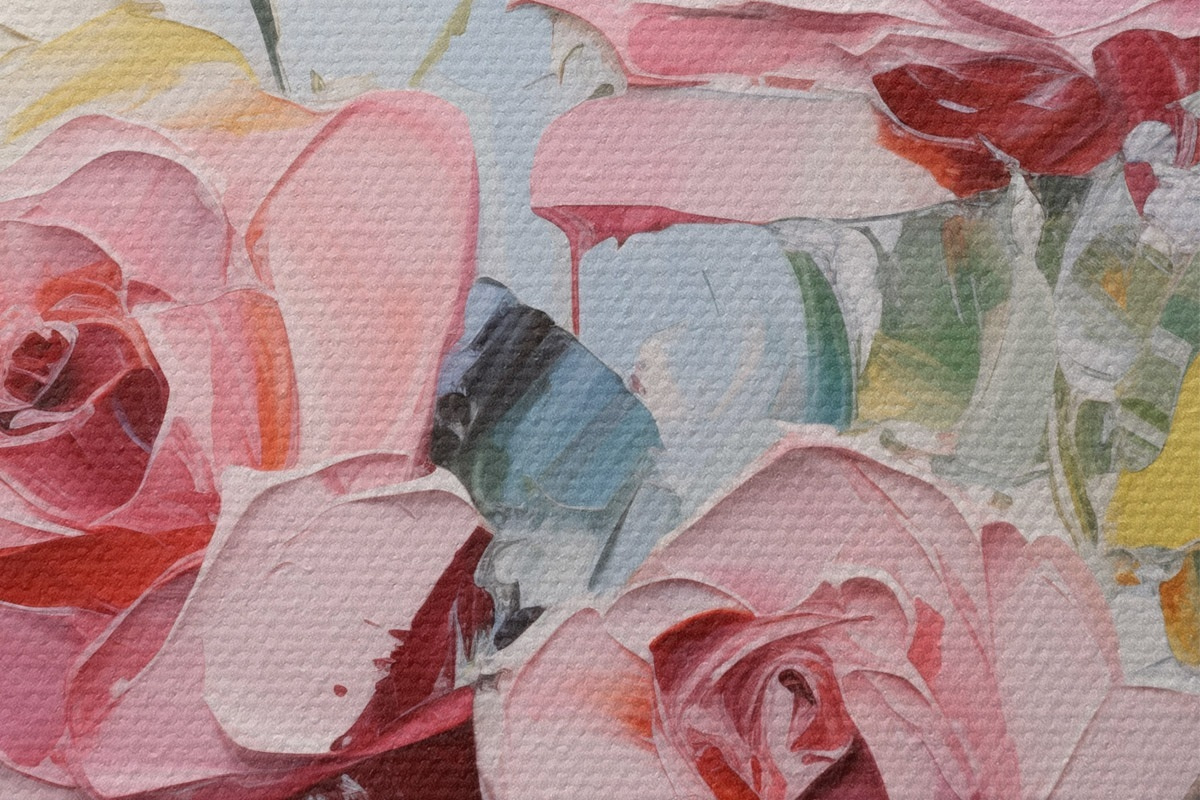 Pilt Moodne abstraktne kunst roosa ja kollane roosade lehtedega, paksud pintslitõmbed, õlimaali imitatsioon, pastellvärvid Nr r43392