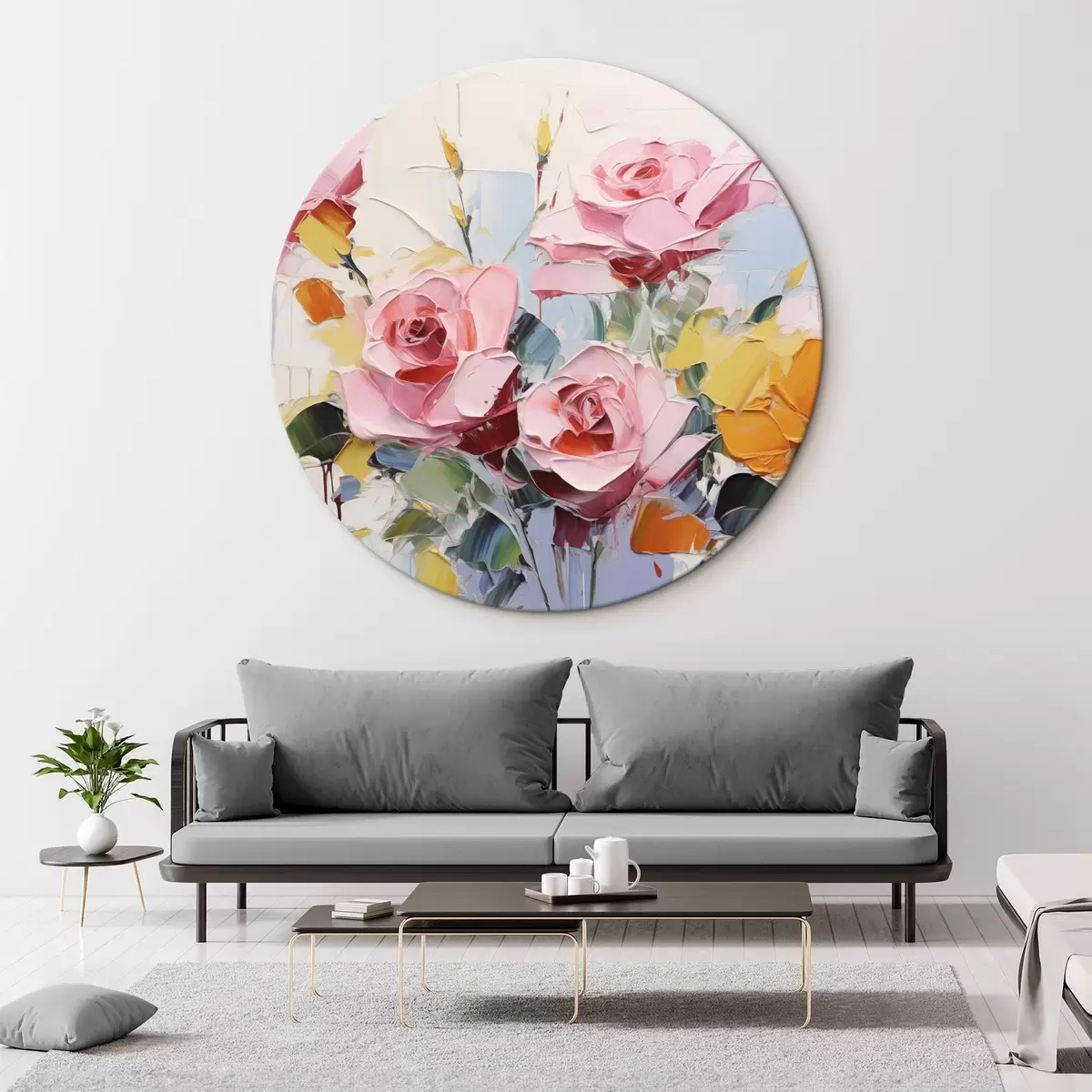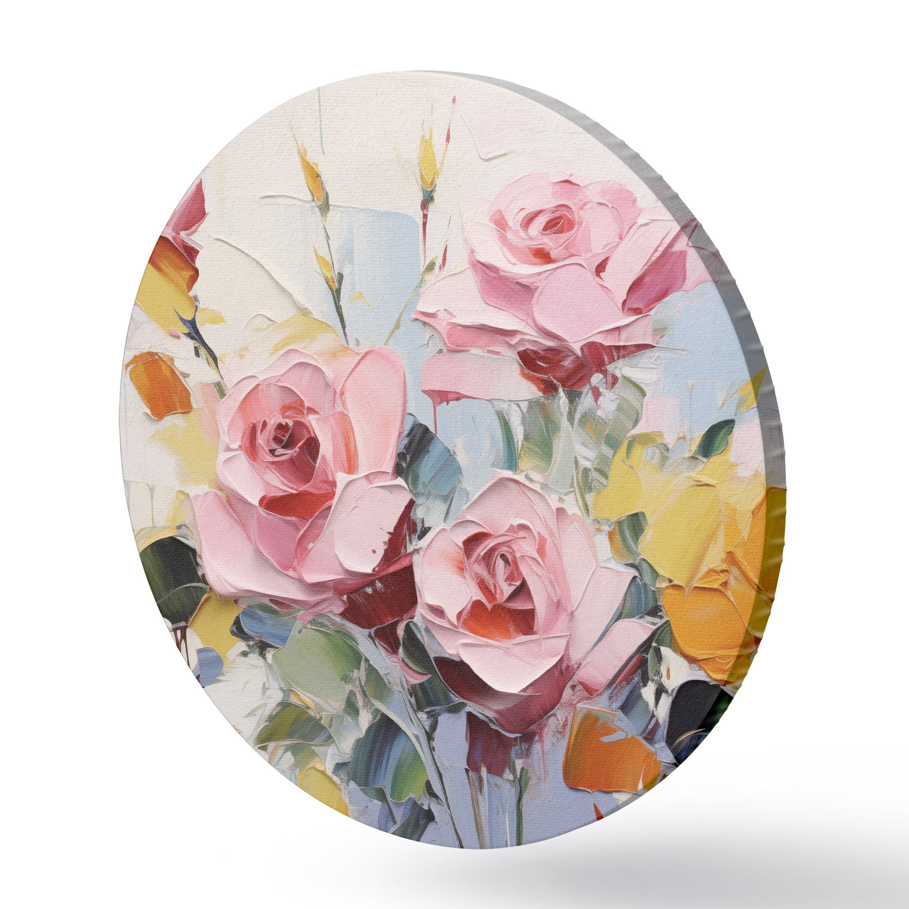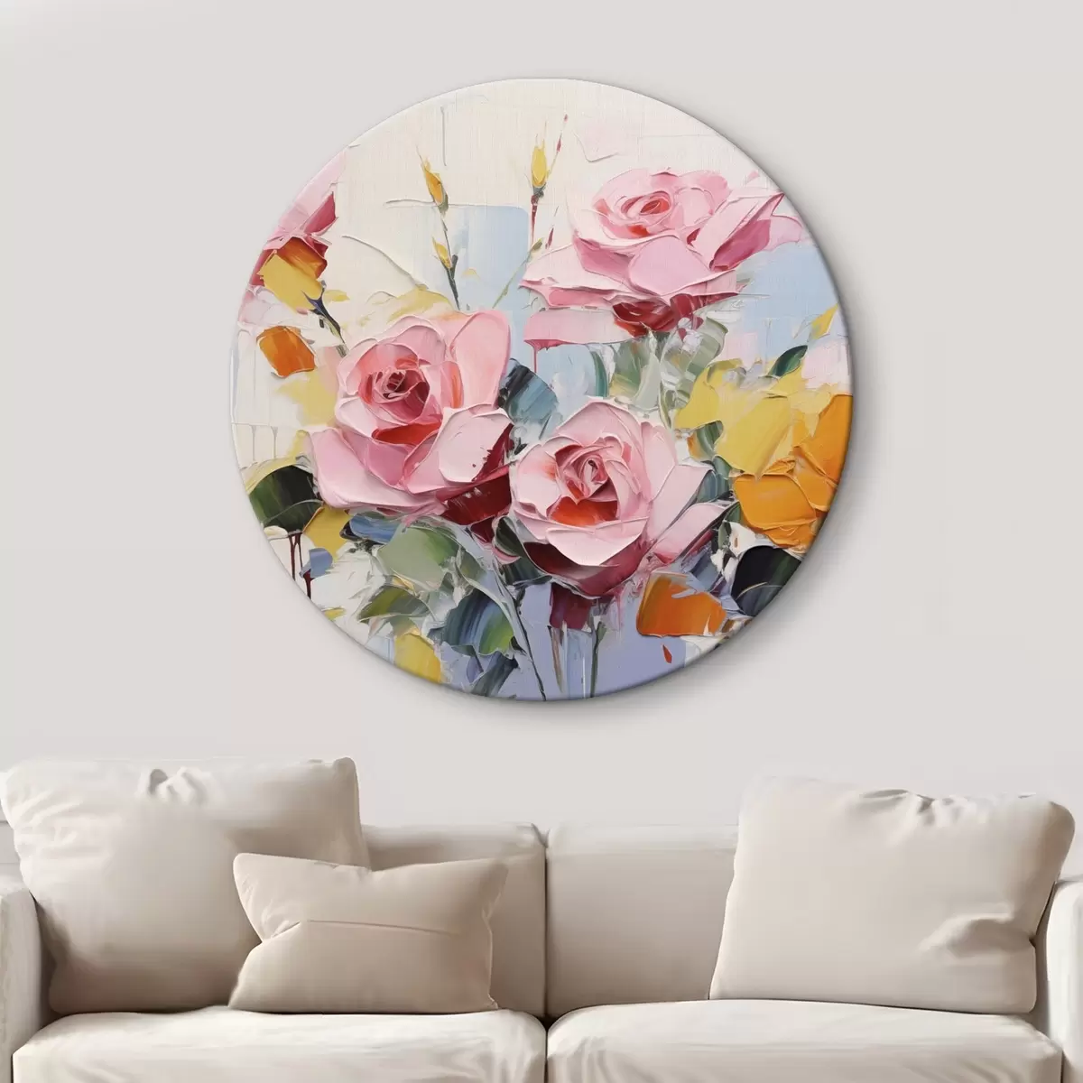 Pilt Moodne abstraktne kunst roosa ja kollane roosade lehtedega, paksud pintslitõmbed, õlimaali imitatsioon, pastellvärvid Nr r43392