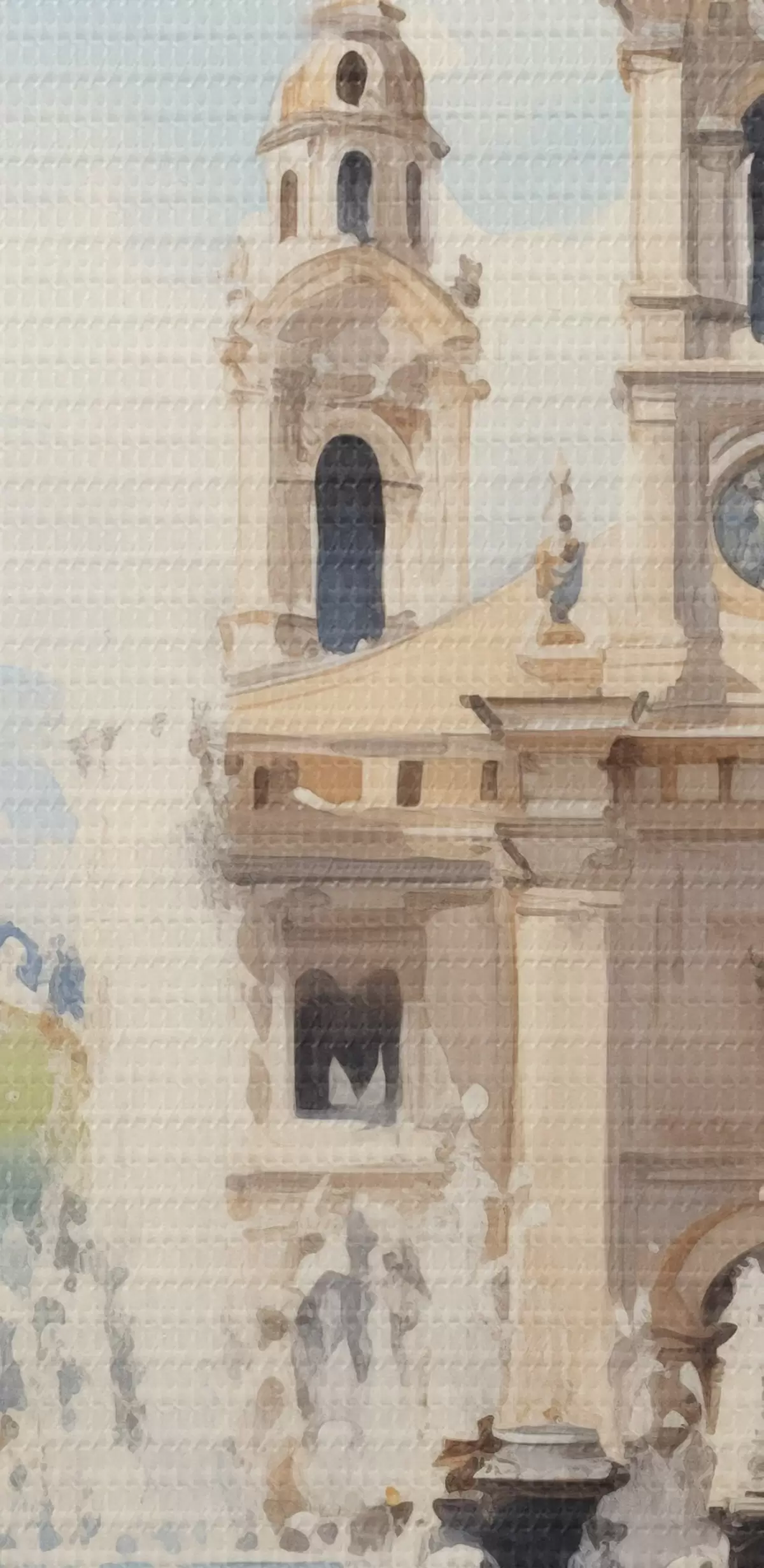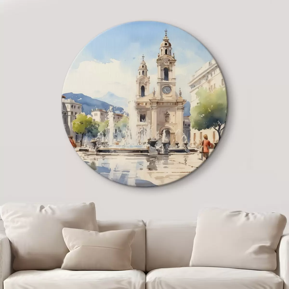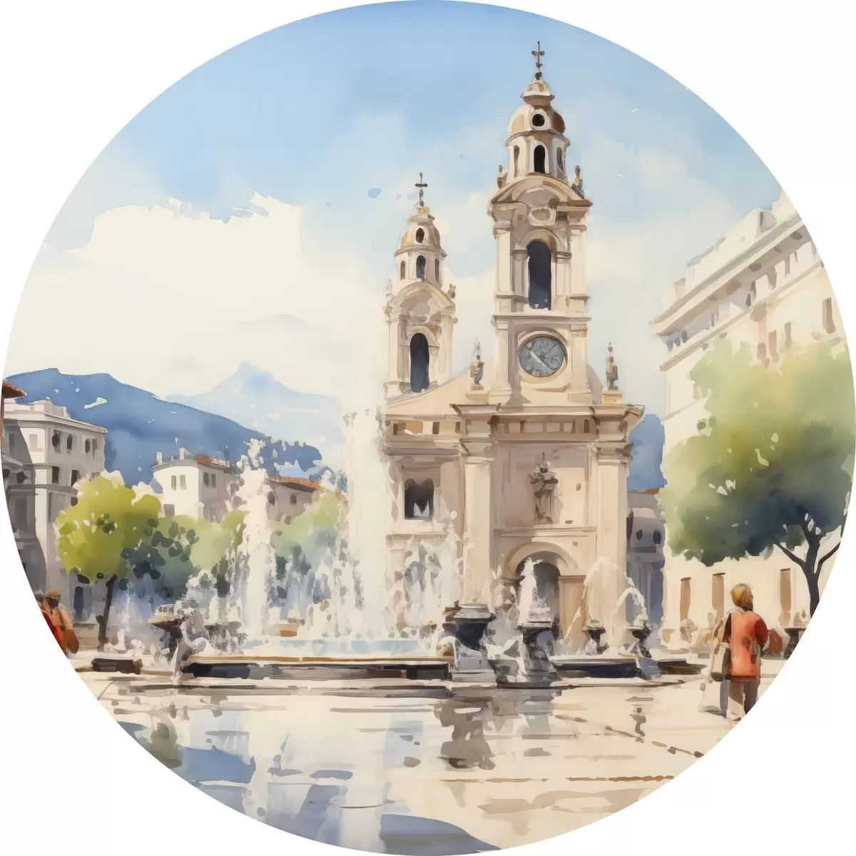 Pilt Abstraktne linnapilt torni ja purskkaevuga linnaväljakul, mäed eemal, akvarellstiilis Nr r43397