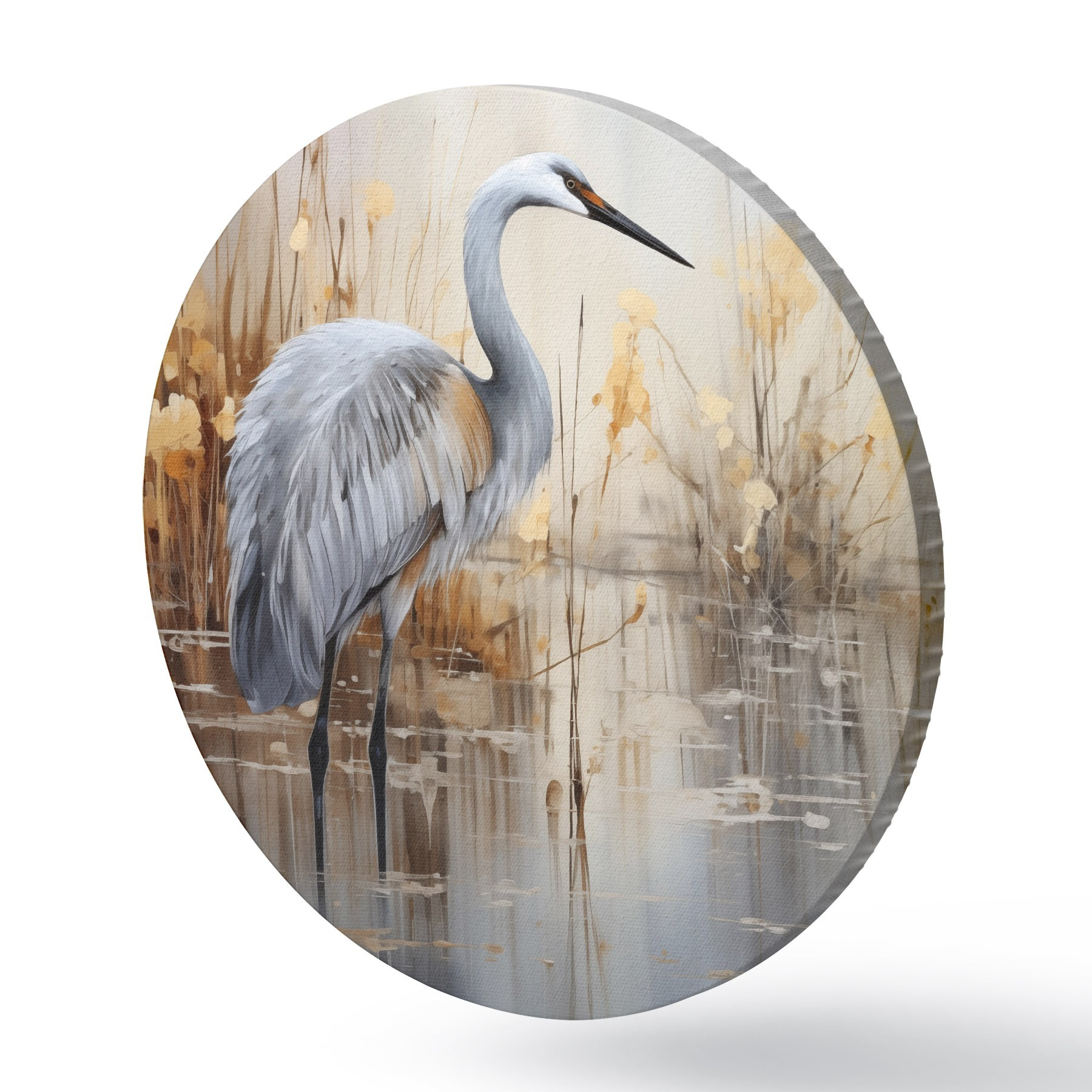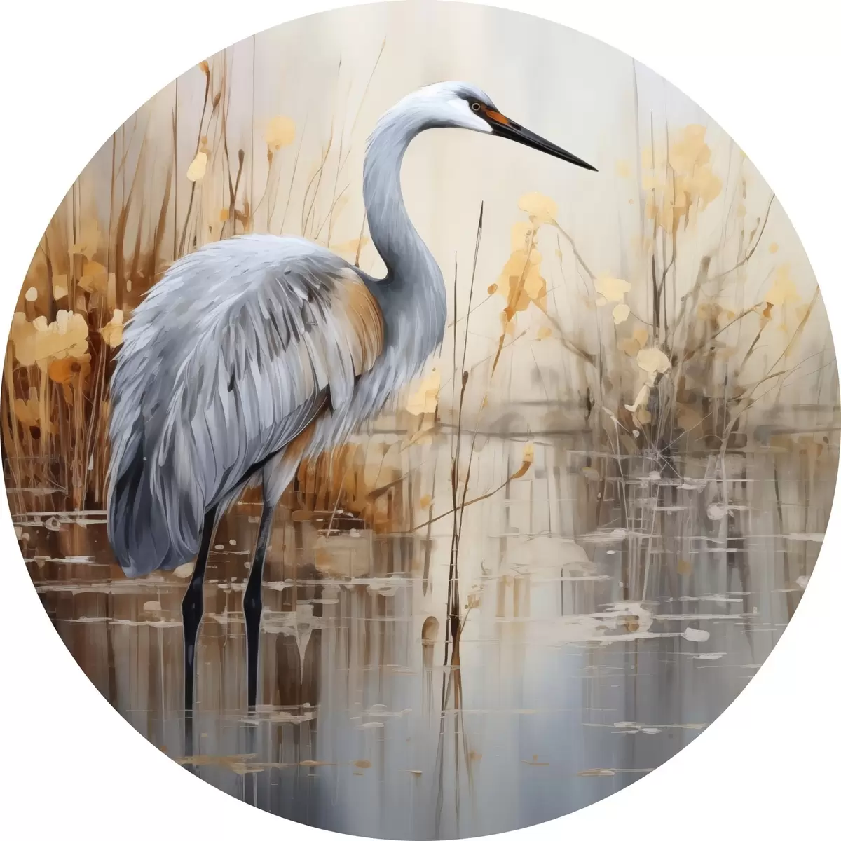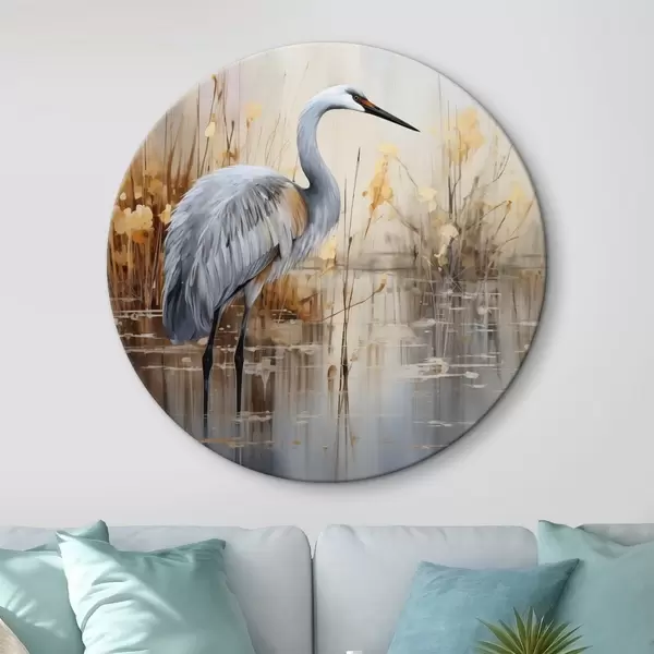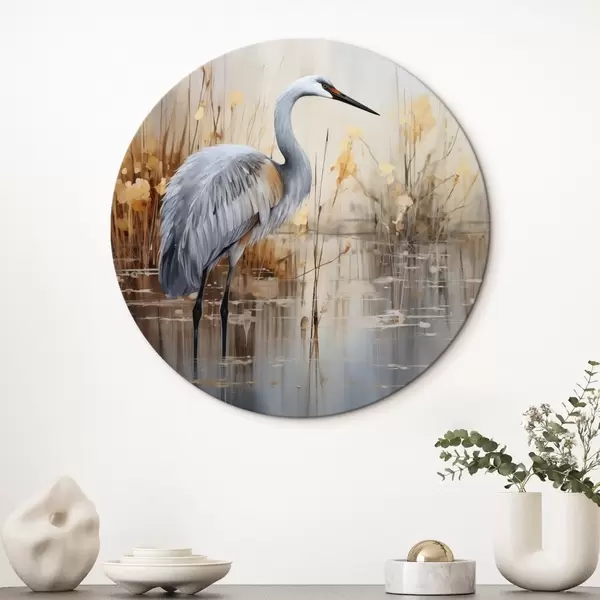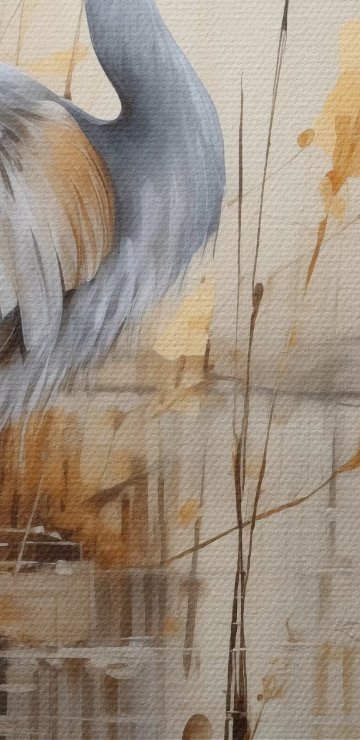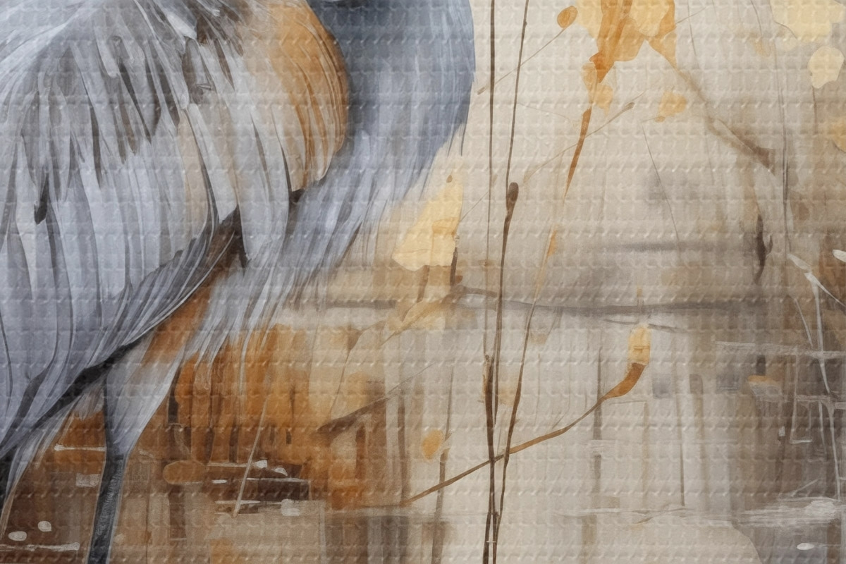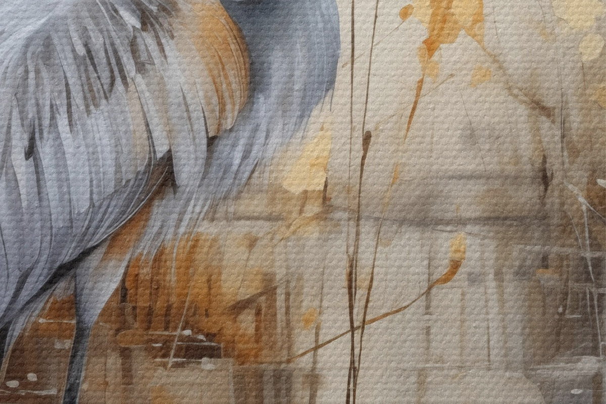 Pilt Hall haigur seisab tiigis , ümbritsetud kõrgete, õhukeste taimedega, taustaks on pehme segu beežist ja valgest Nr r43398