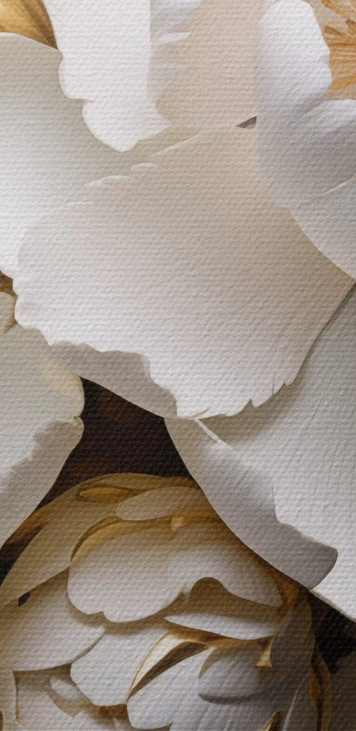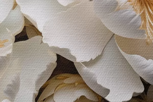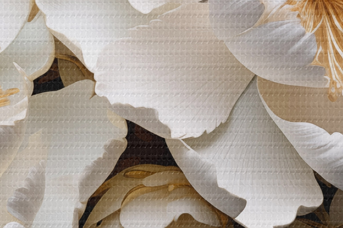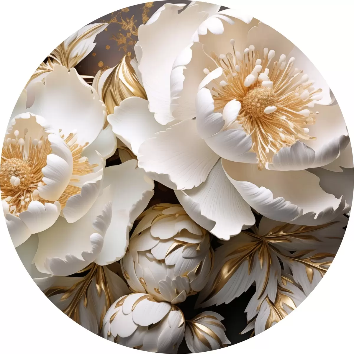 Pilt Valged ja kollased pioonid lehtedega, keerulised detailid, dekoratiivne kunst, tumedal taustal Nr r43399