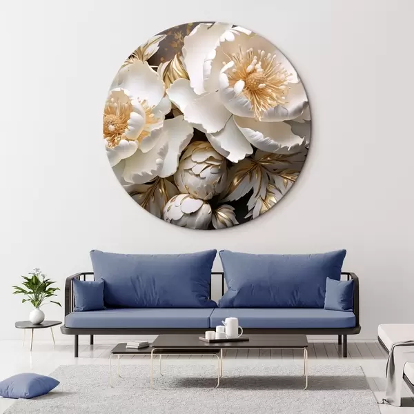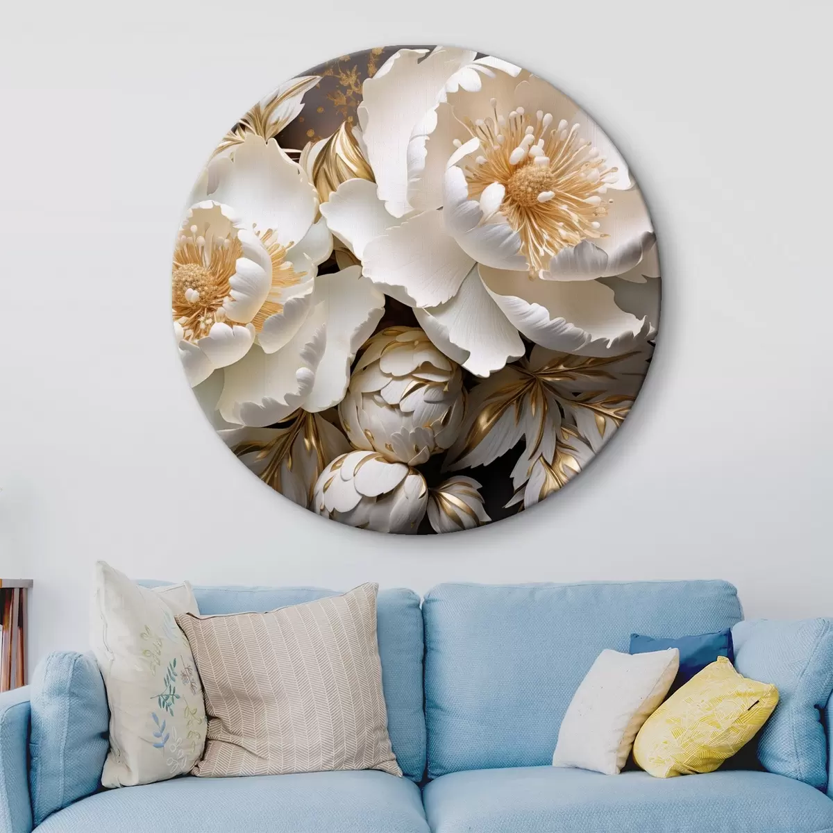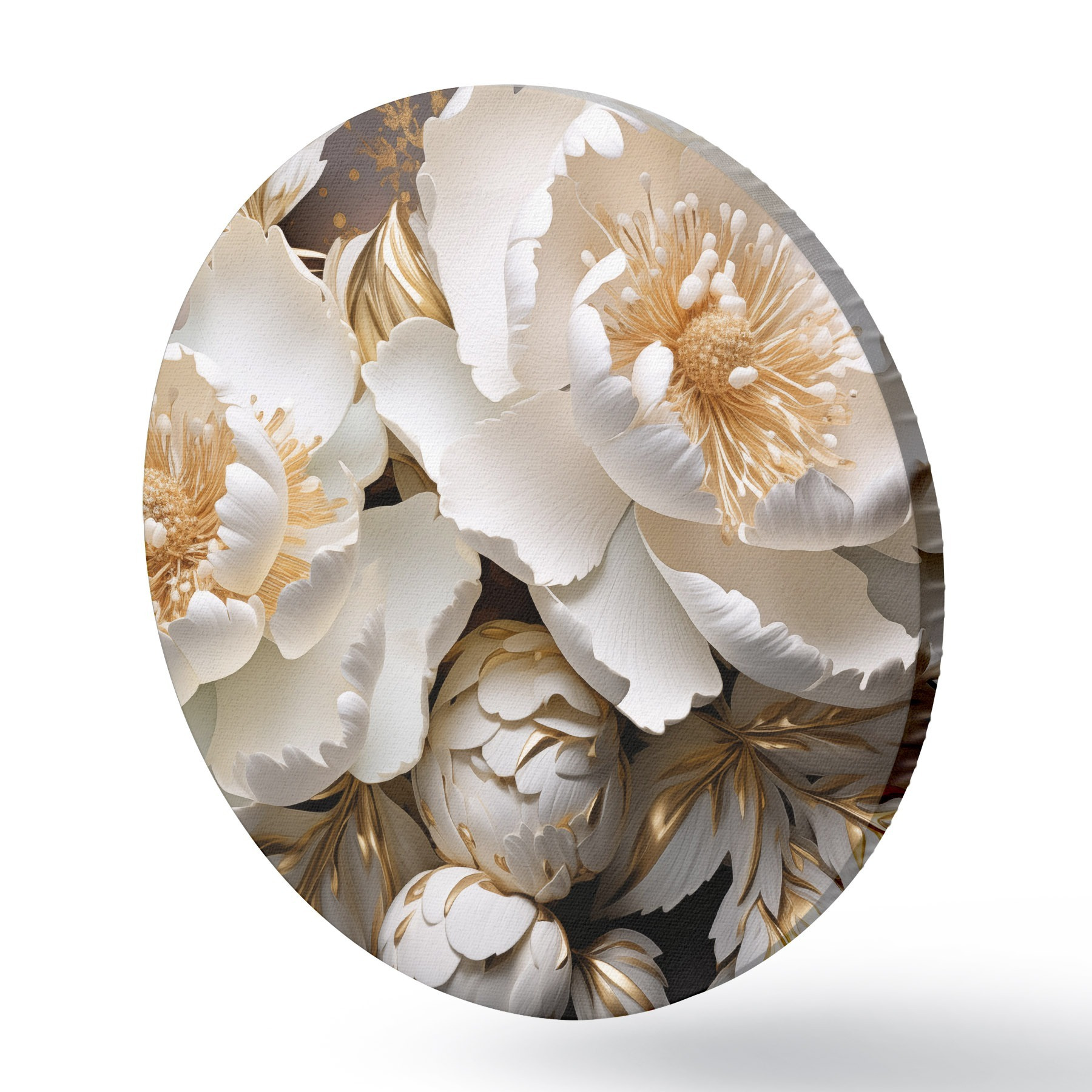 Pilt Valged ja kollased pioonid lehtedega, keerulised detailid, dekoratiivne kunst, tumedal taustal Nr r43399