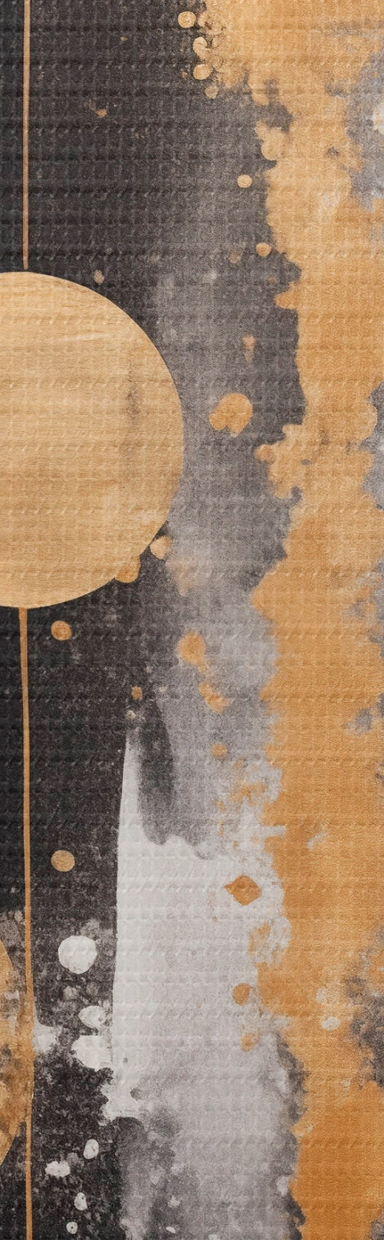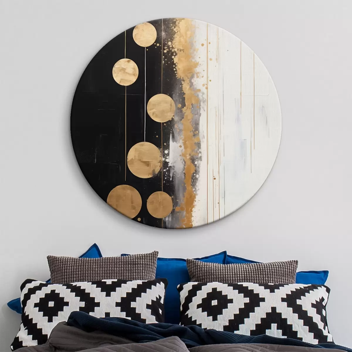 Pilt Abstraktne kunst, kus kollased ringid ripuvad mustal ja valgel taustal koos valgete ja kollaste laikudega Nr r43410