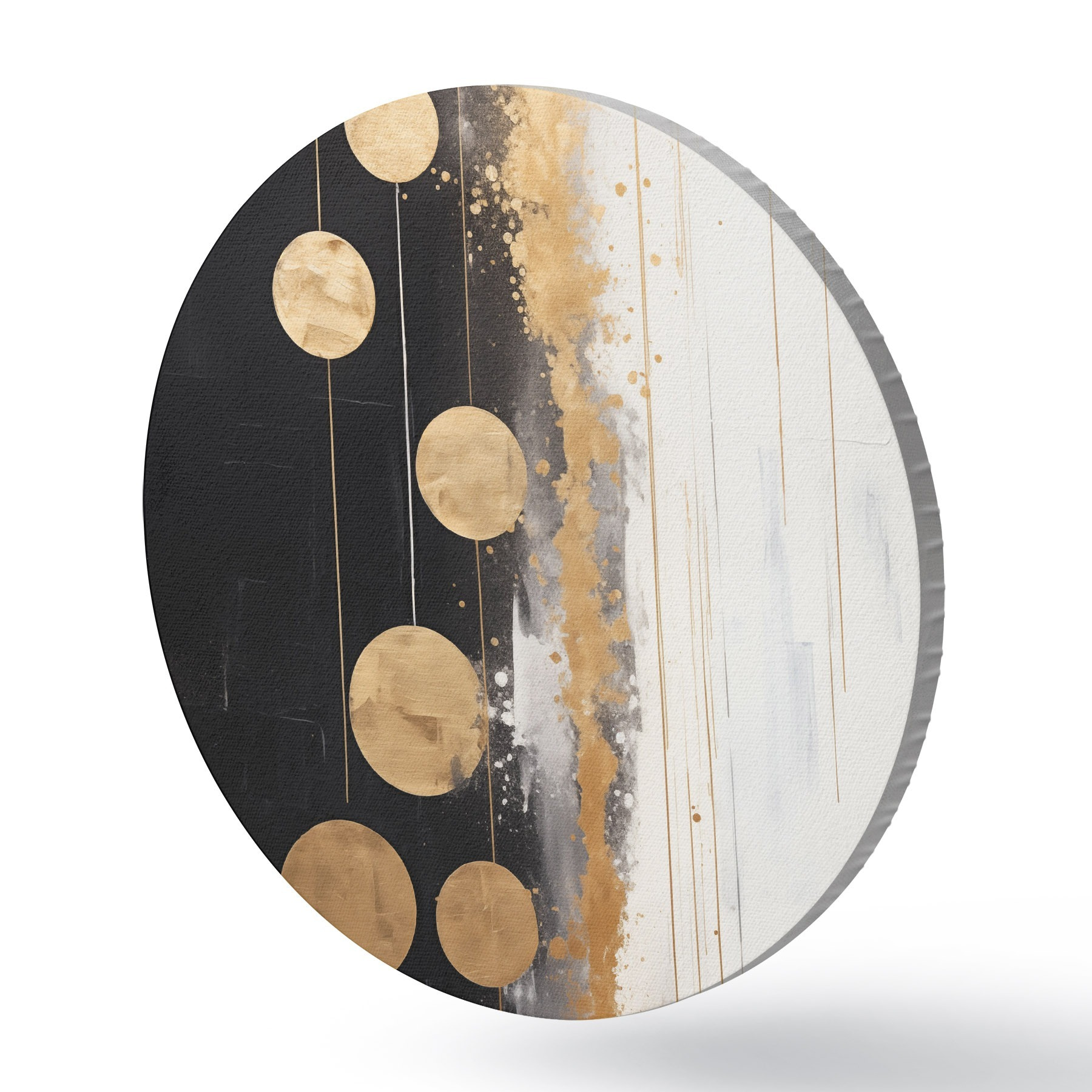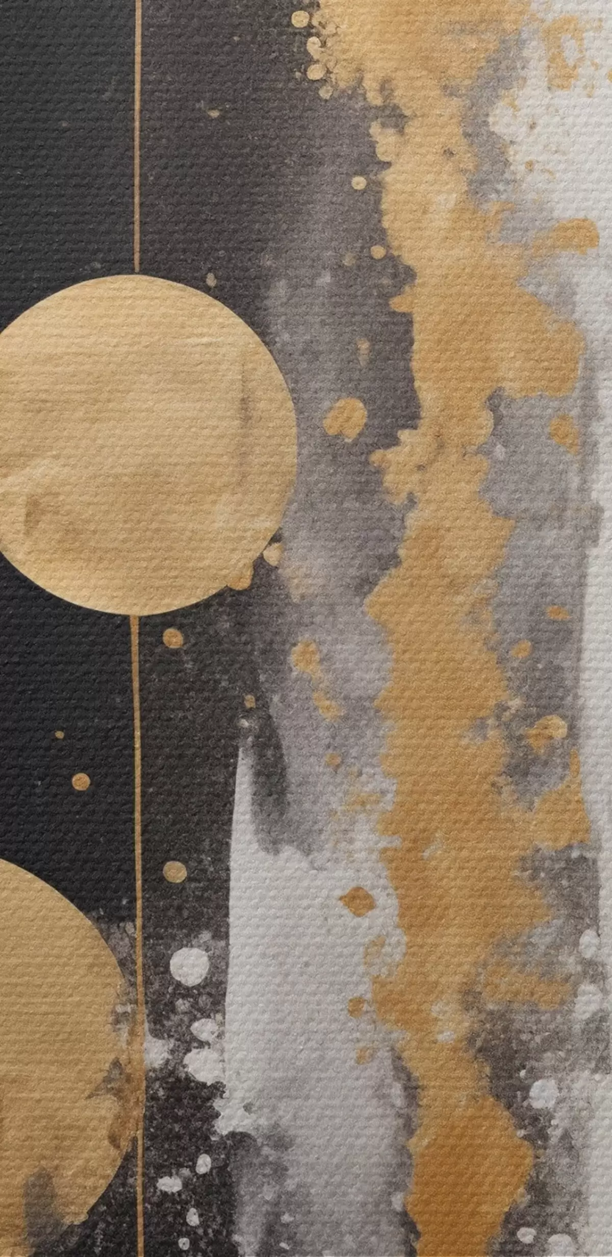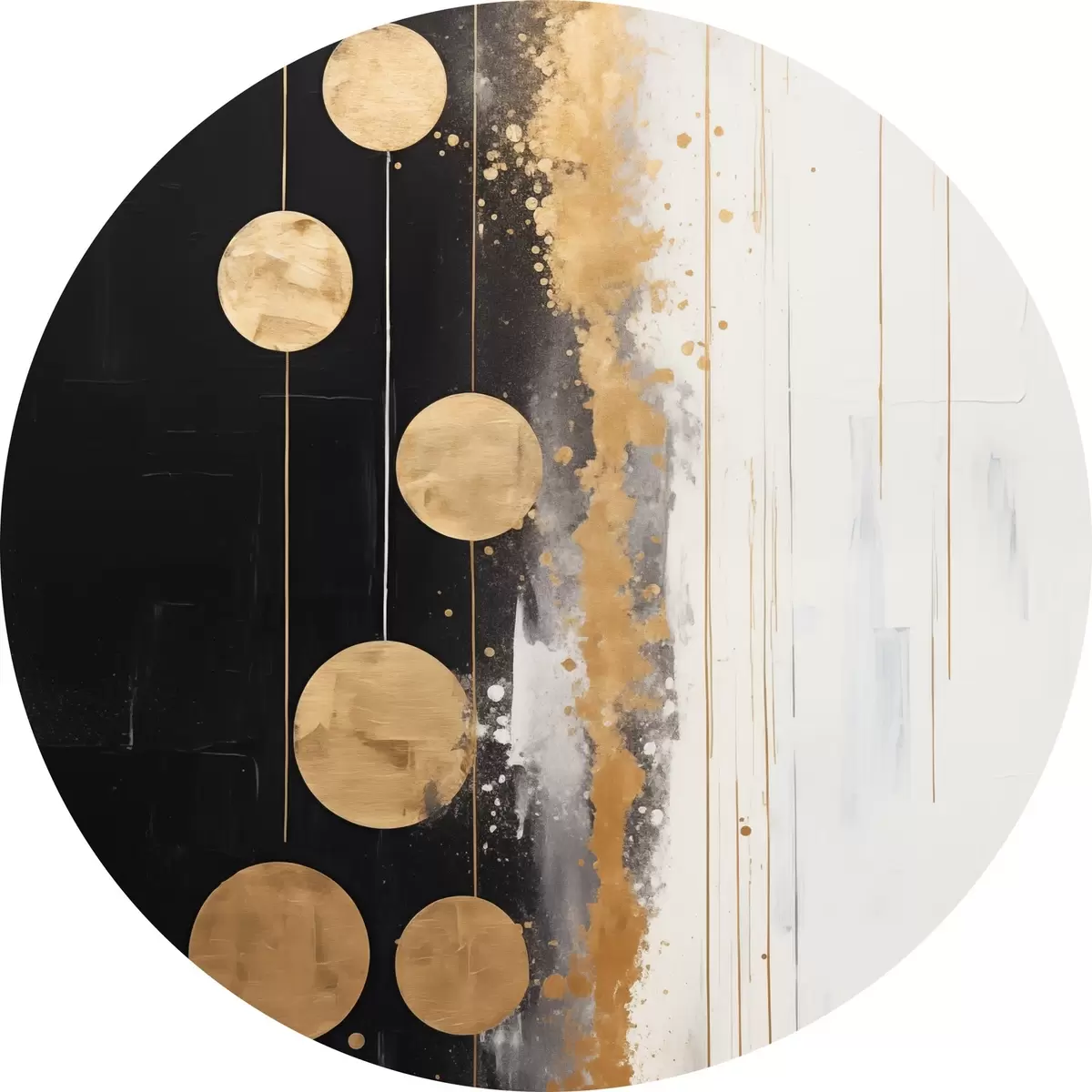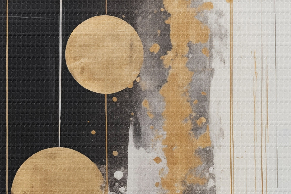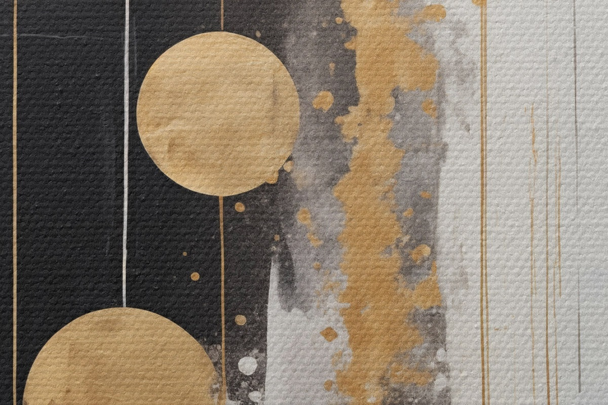 Pilt Abstraktne kunst, kus kollased ringid ripuvad mustal ja valgel taustal koos valgete ja kollaste laikudega Nr r43410