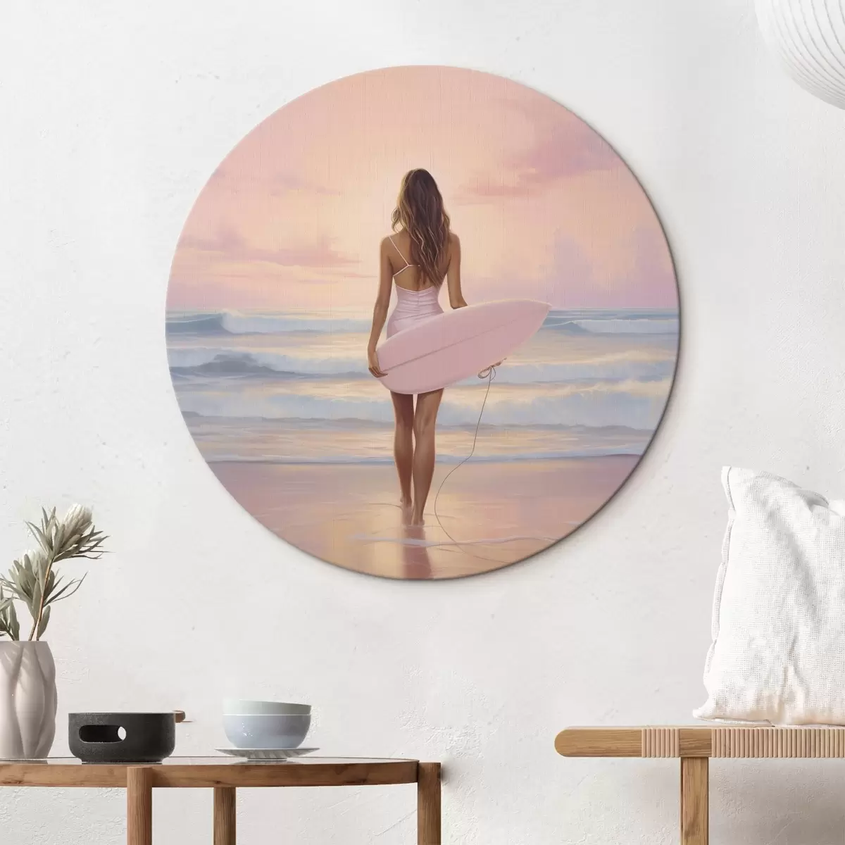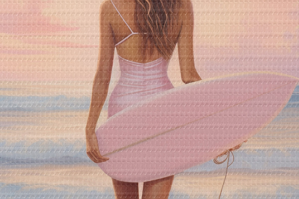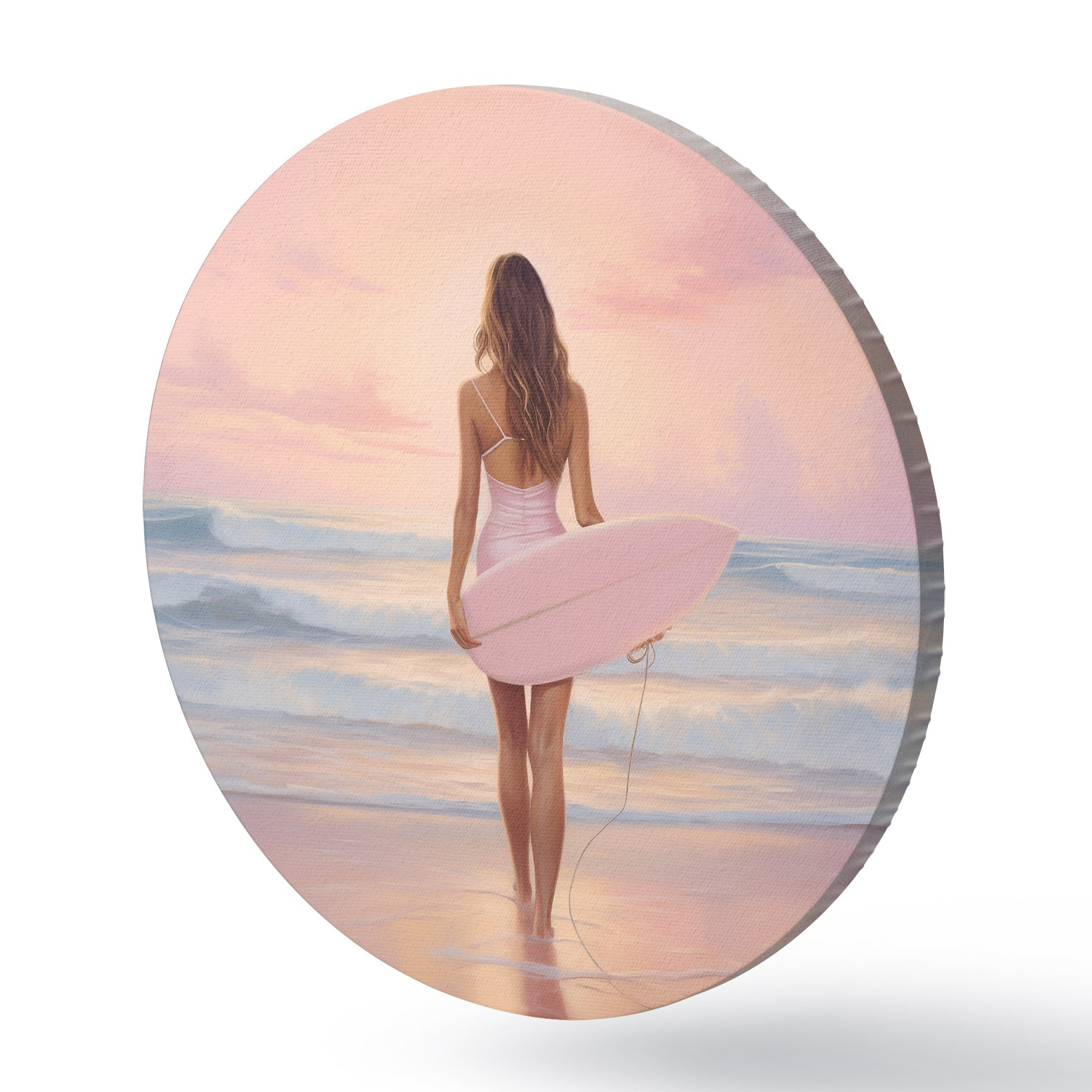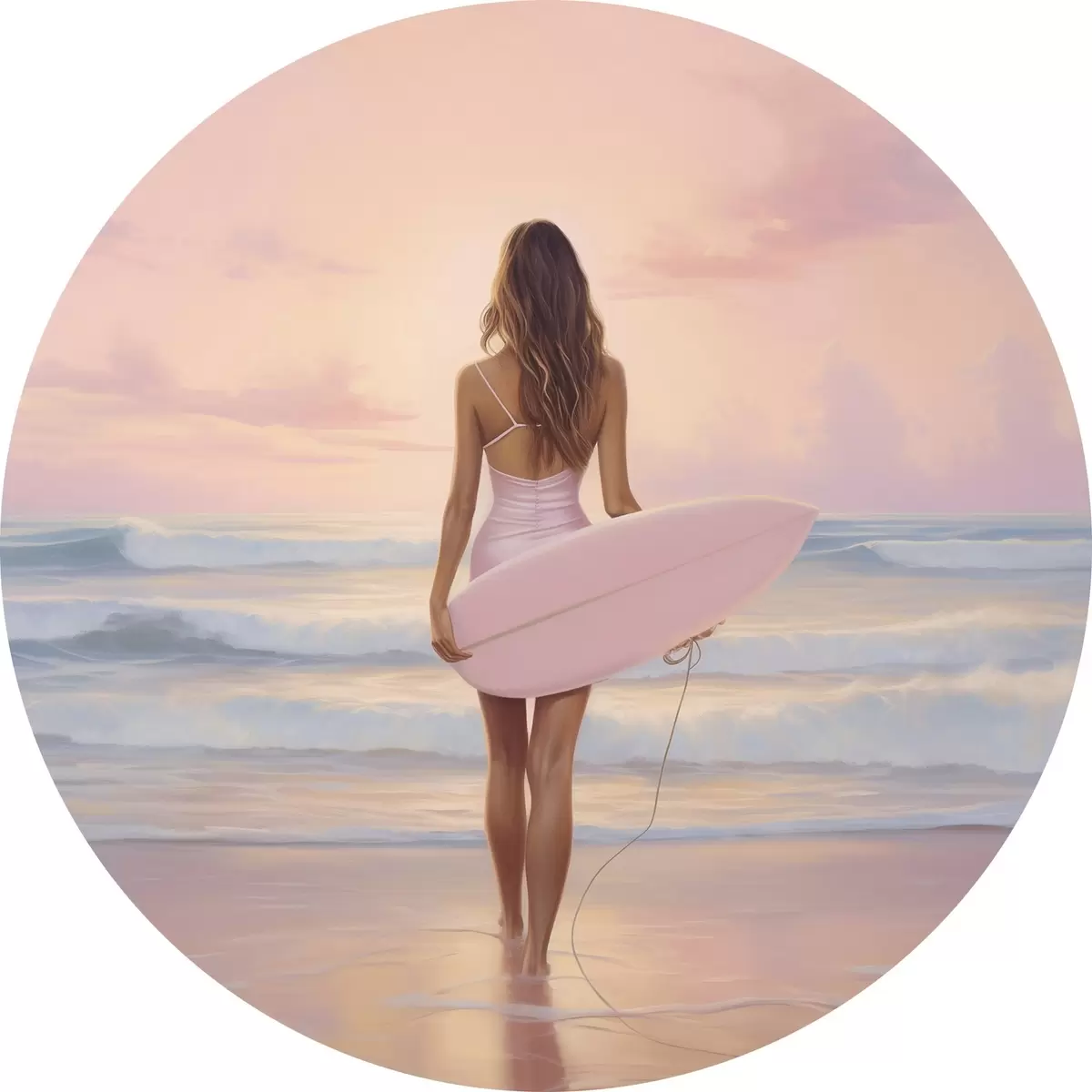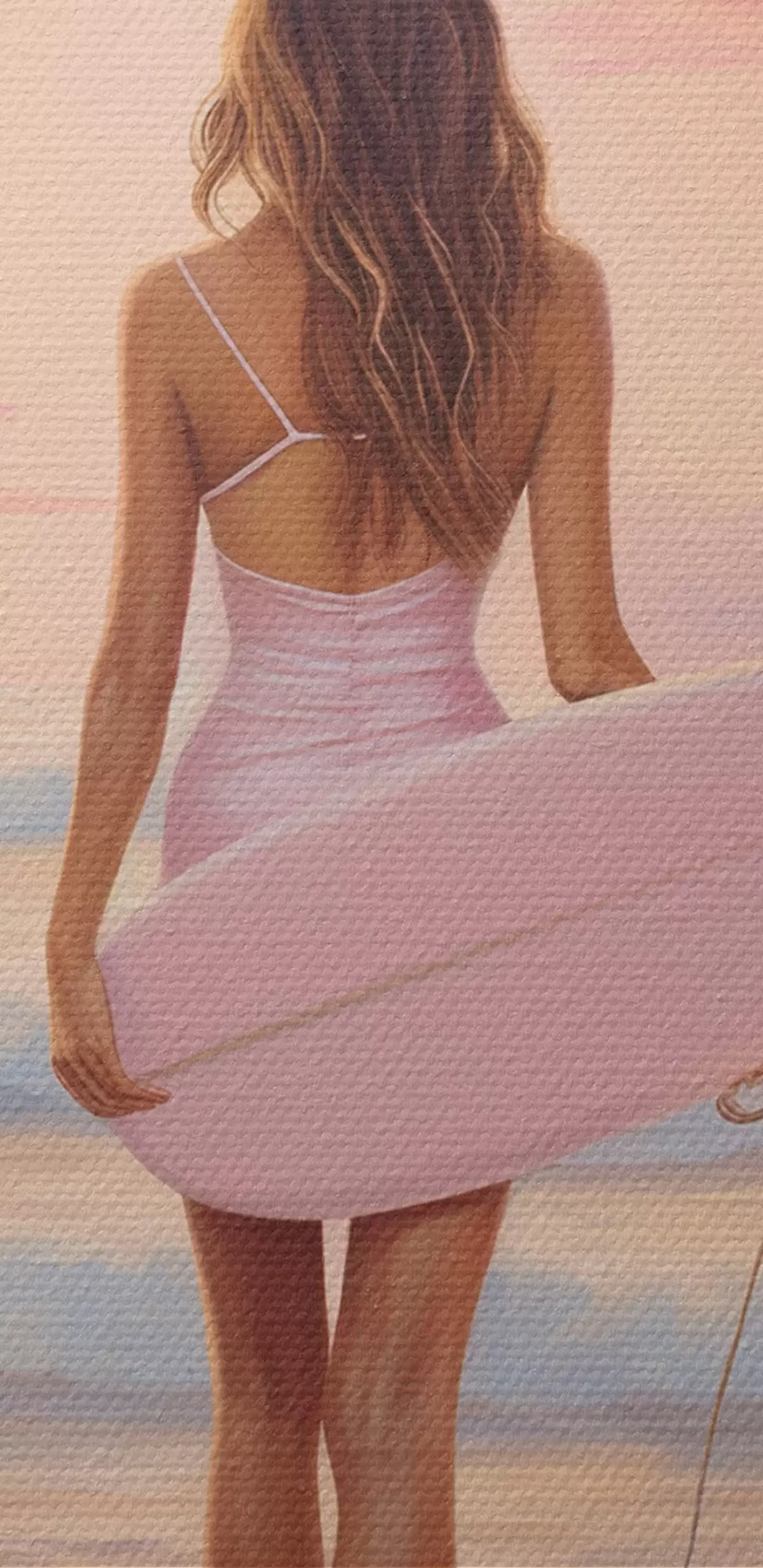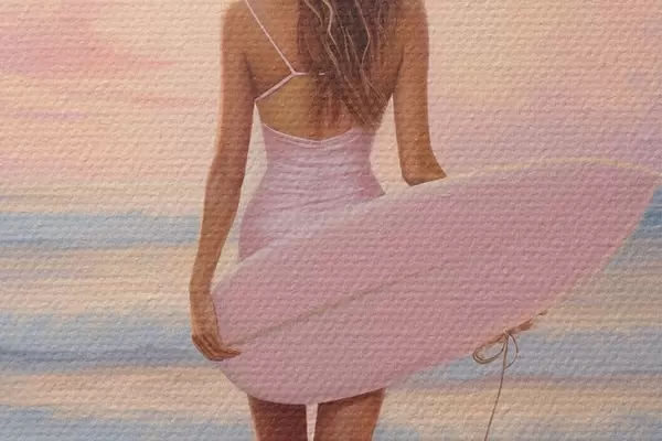 Pilt Tüdruk koos lainelauaga ookeani rannas, päikeseloojang, akrüülstiilis joonistus Nr r43881