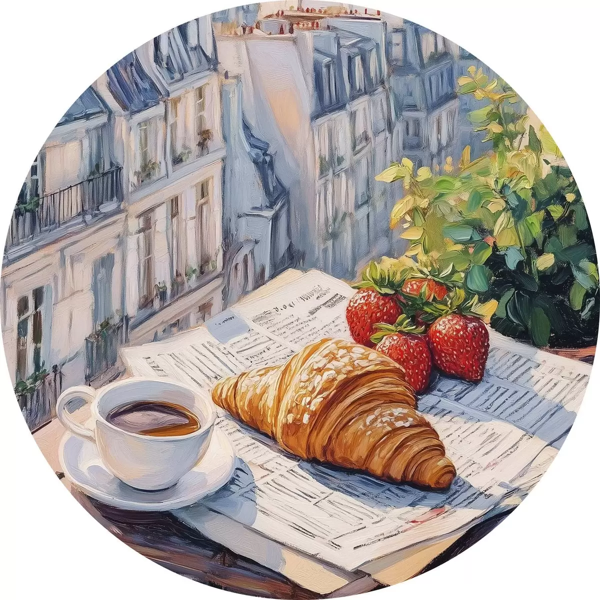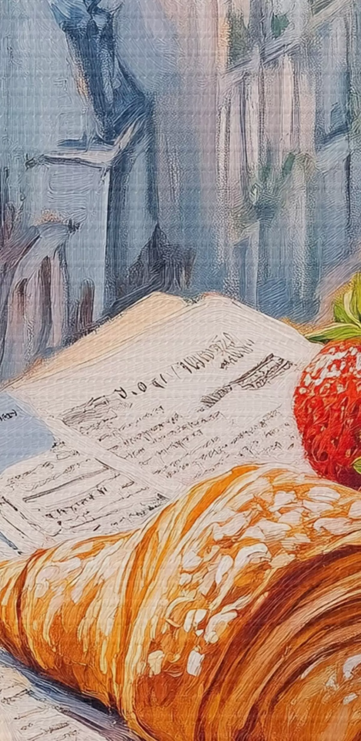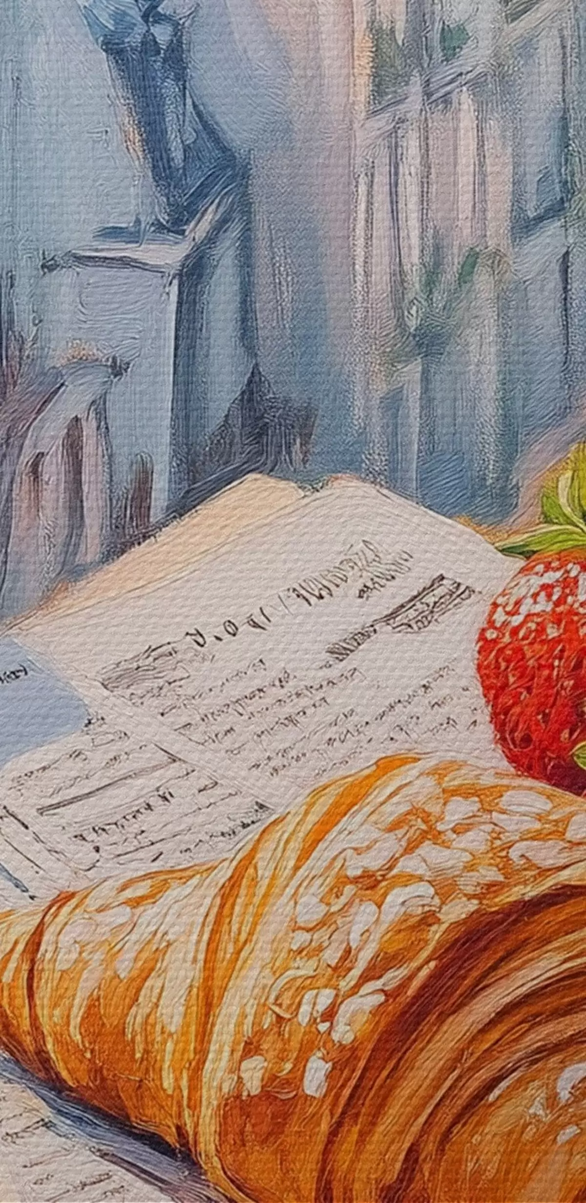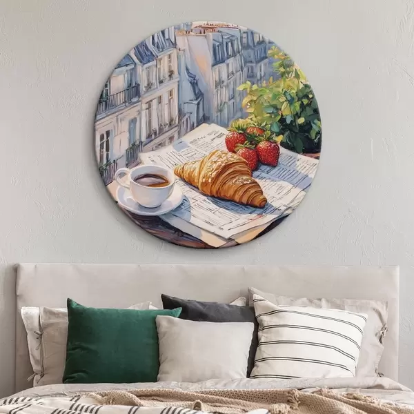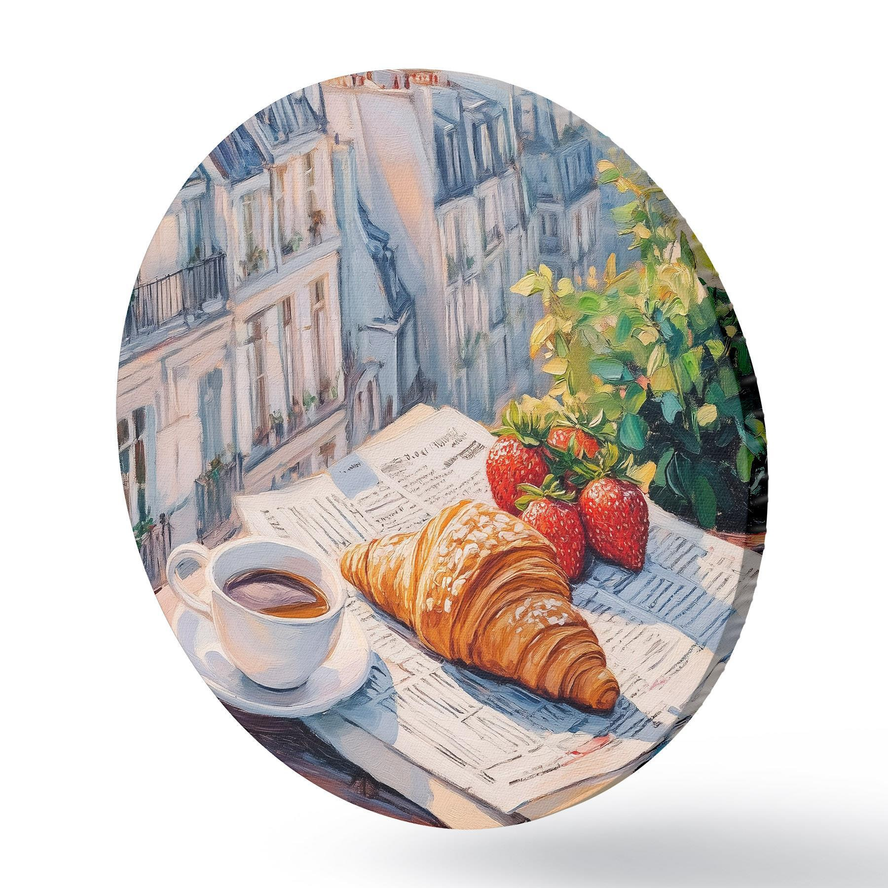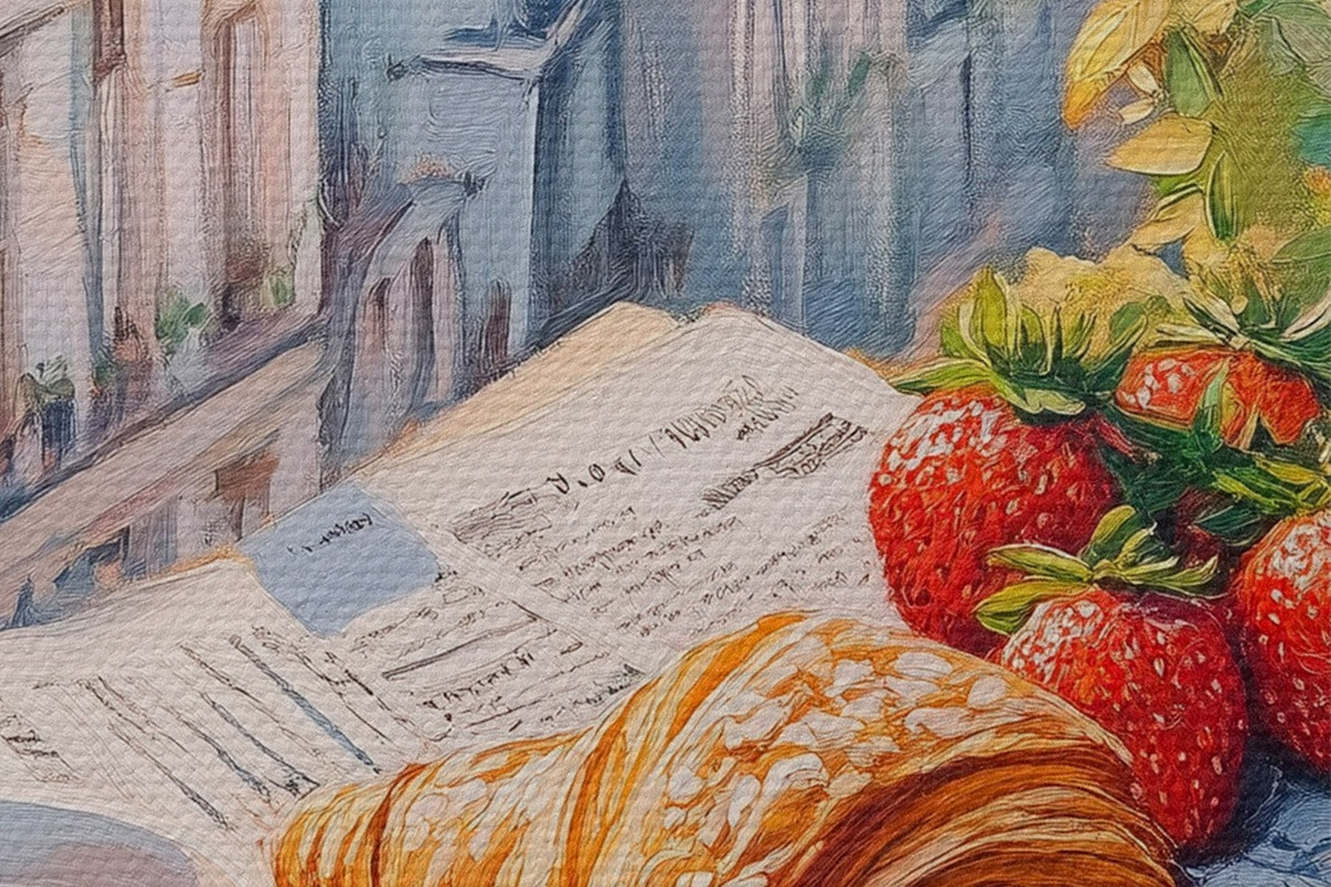 Pilt Päikesetõus Pariisis rõdul, Eiffeli torn, maasikad, kohv, päevik Nr r43890
