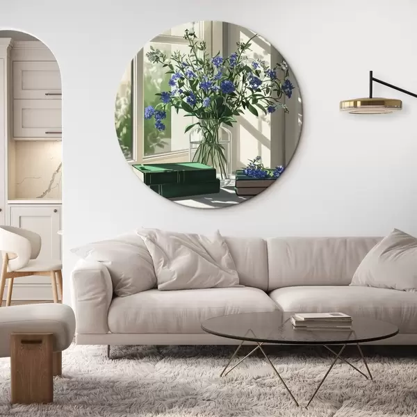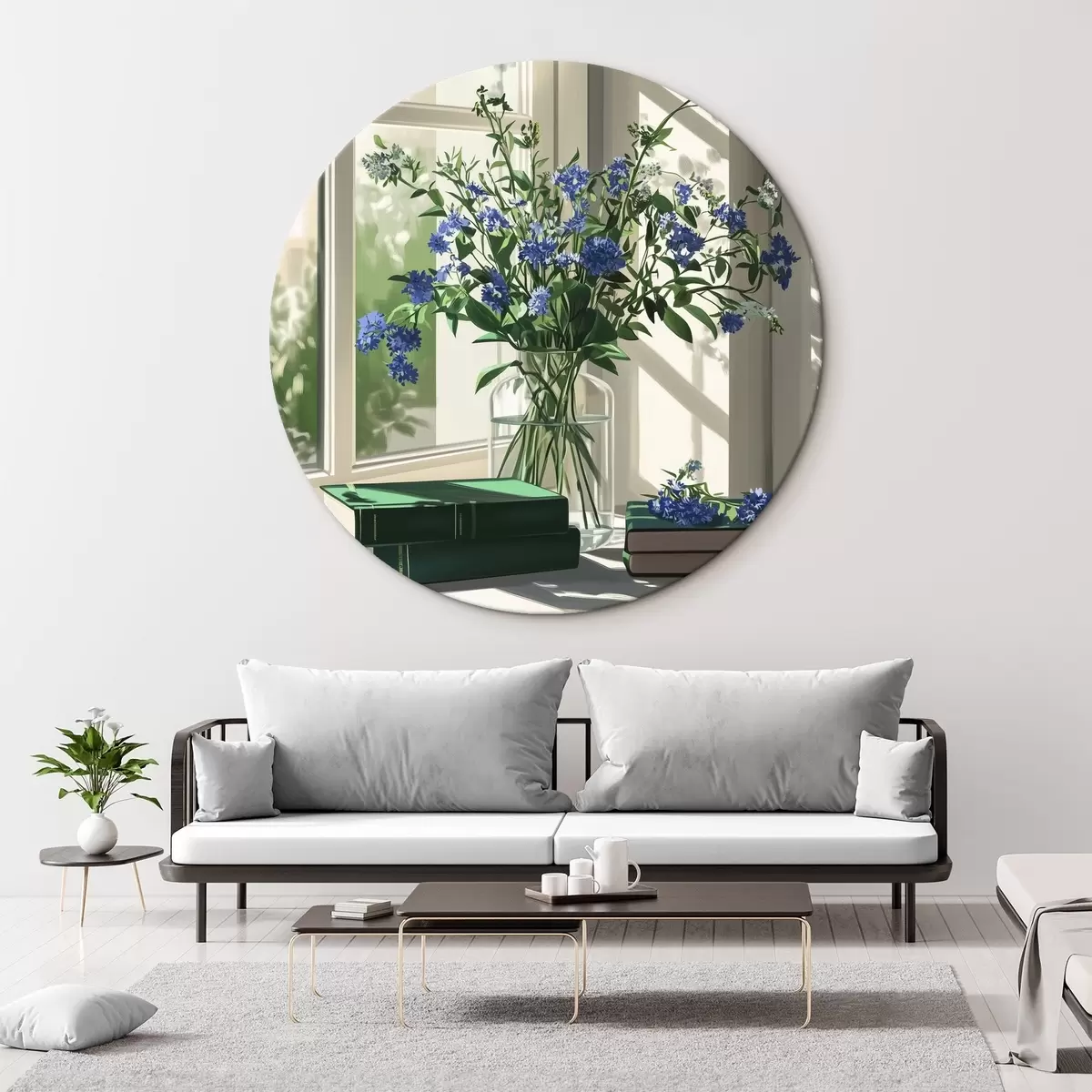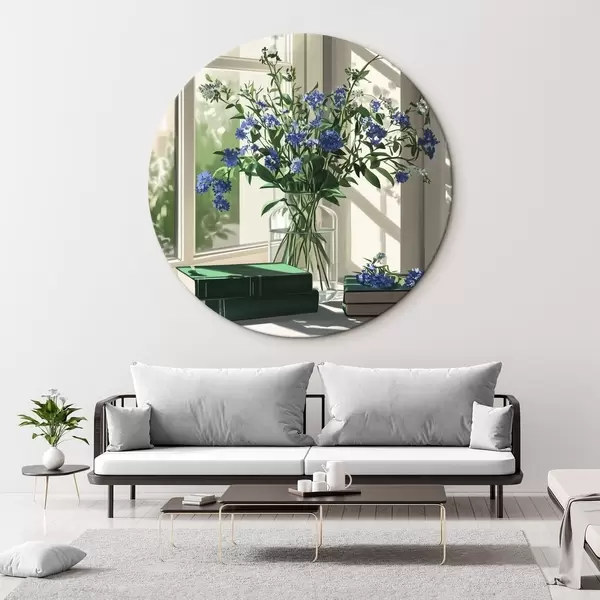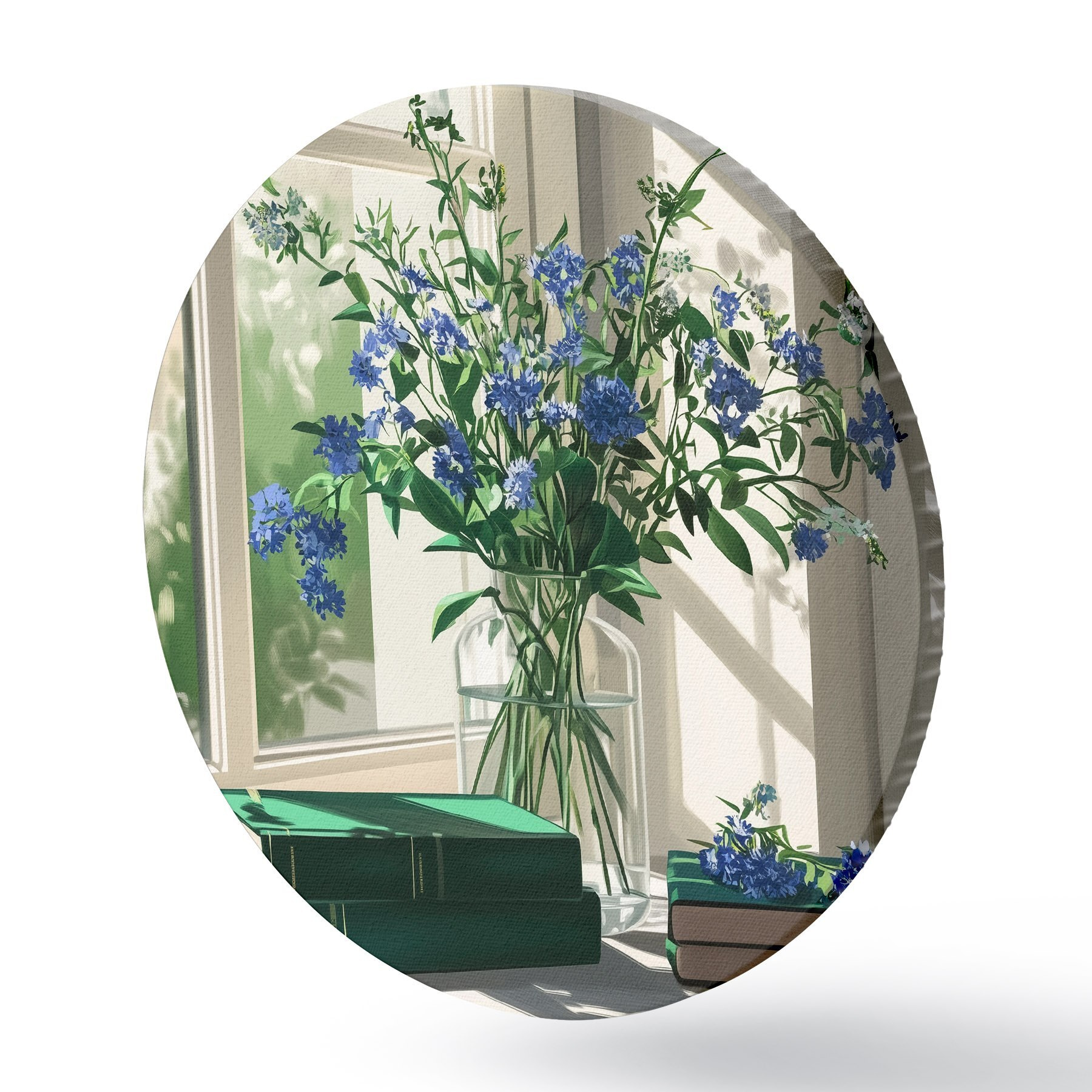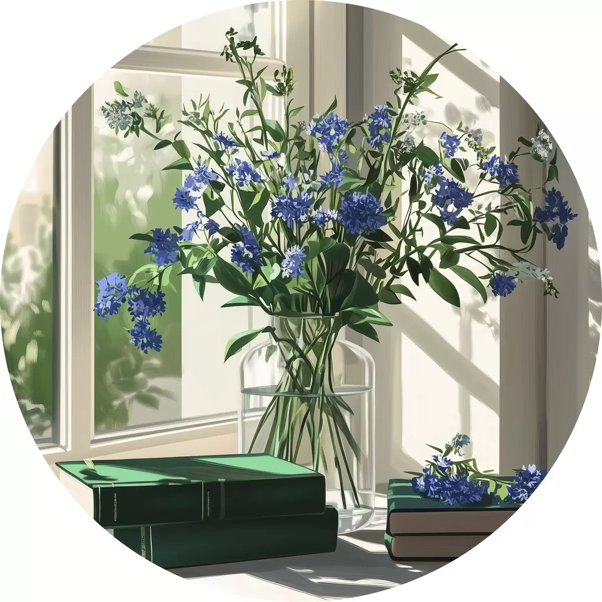 Pilt Raamatud ja lillad lilled vaasis aknalaual, rohelus Nr r44008