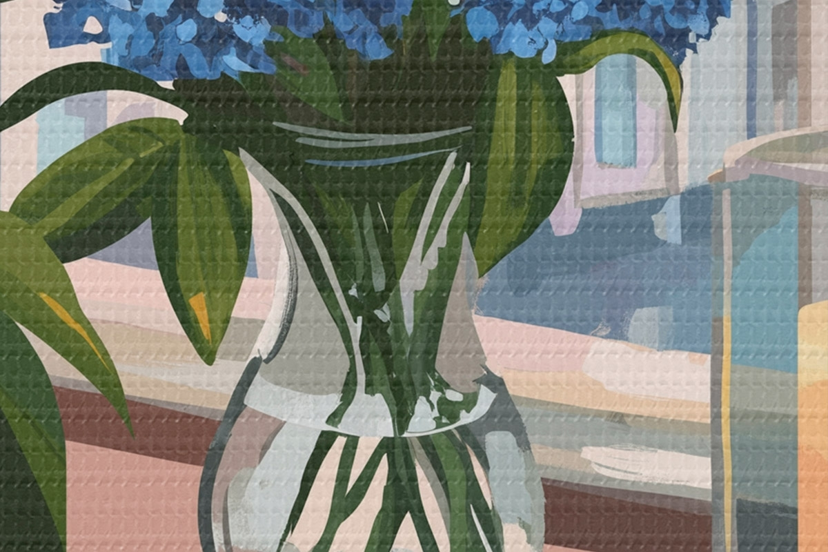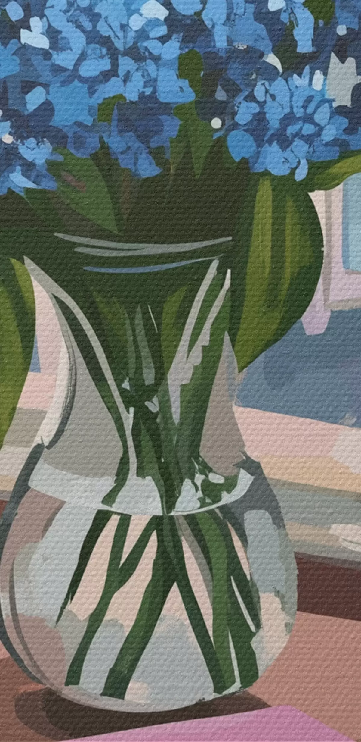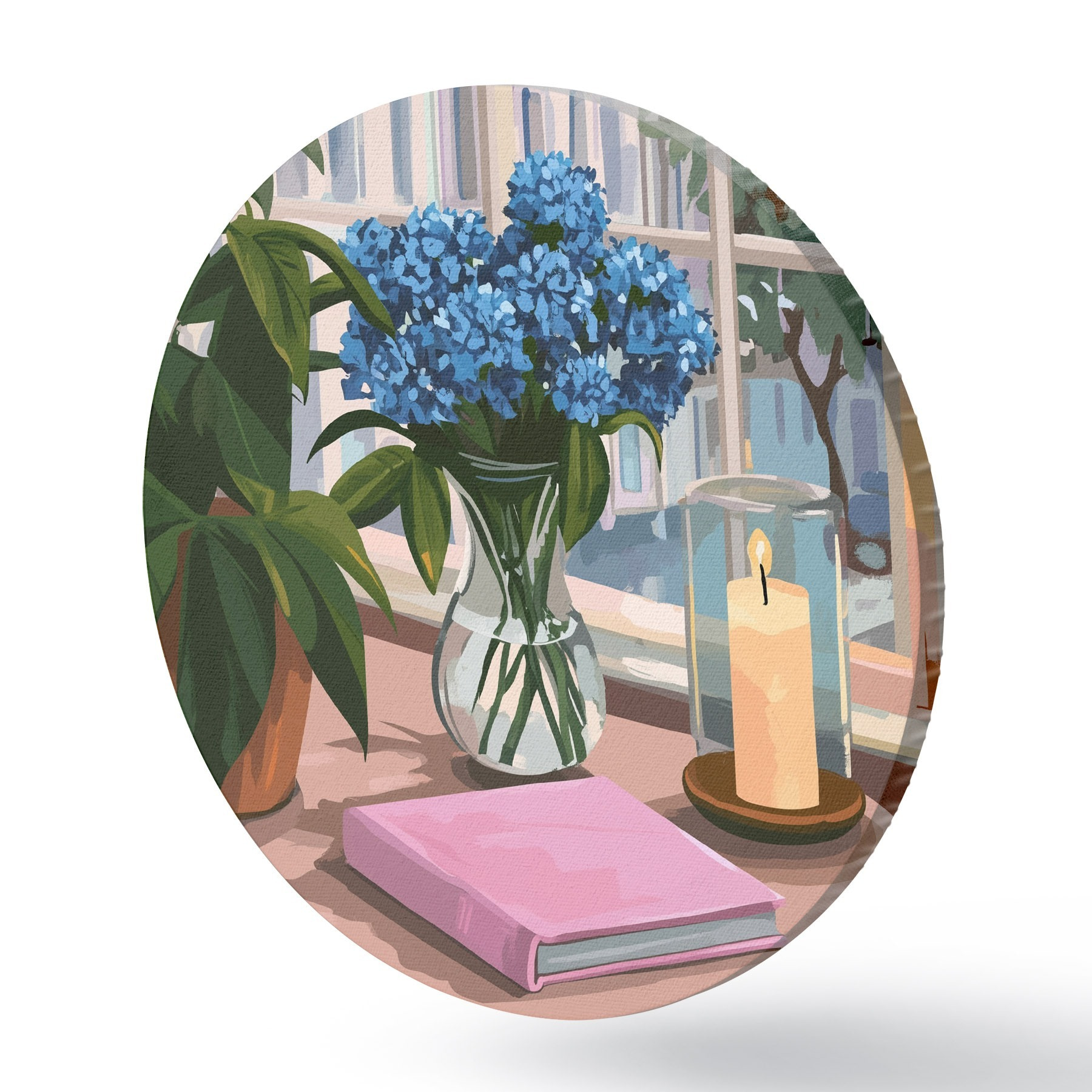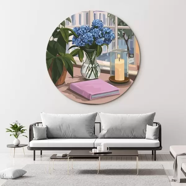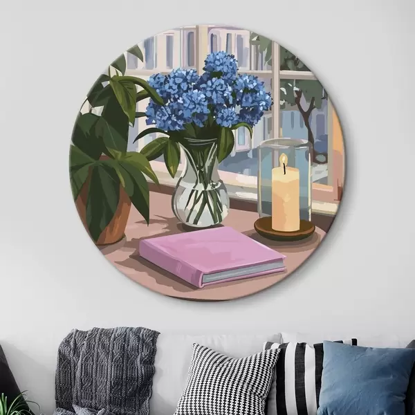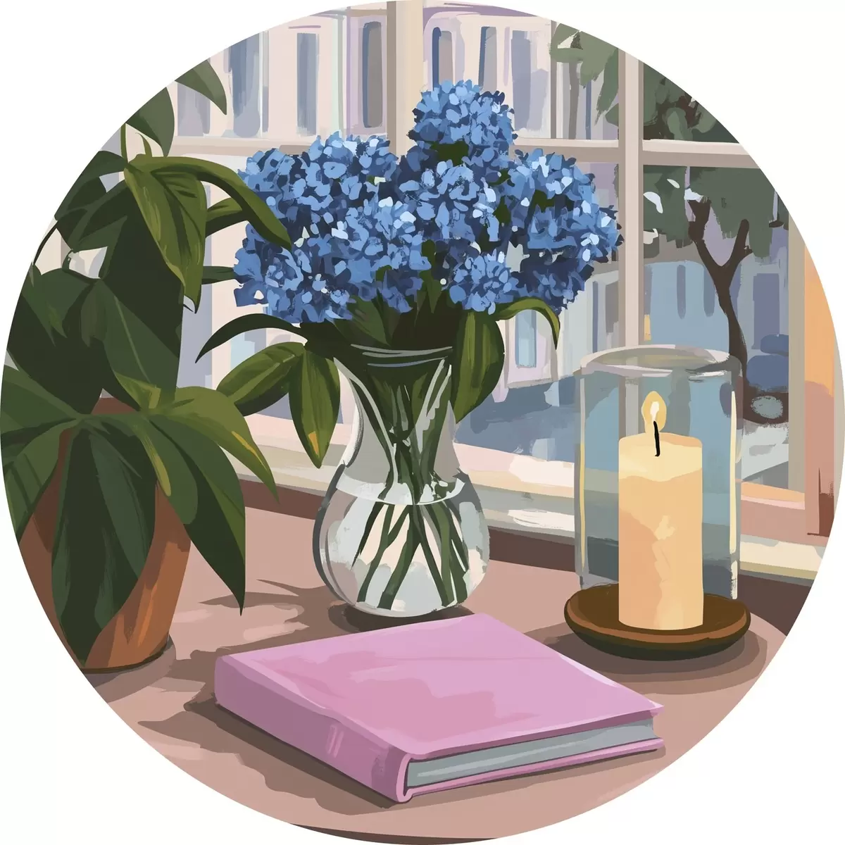 Pilt Hortensiad vaasis, aknavaade, küünal, hubane kodu Nr r44009