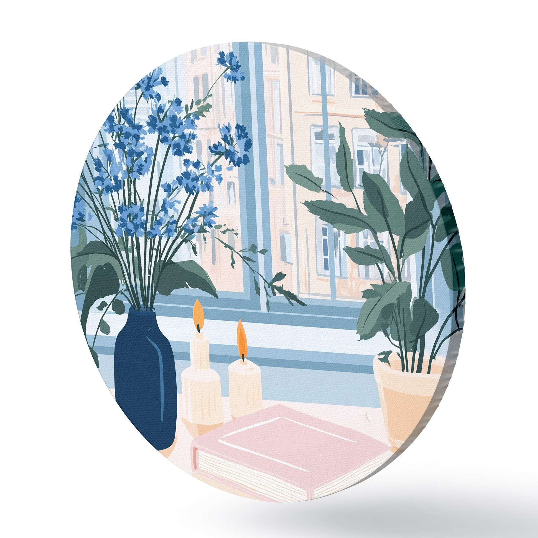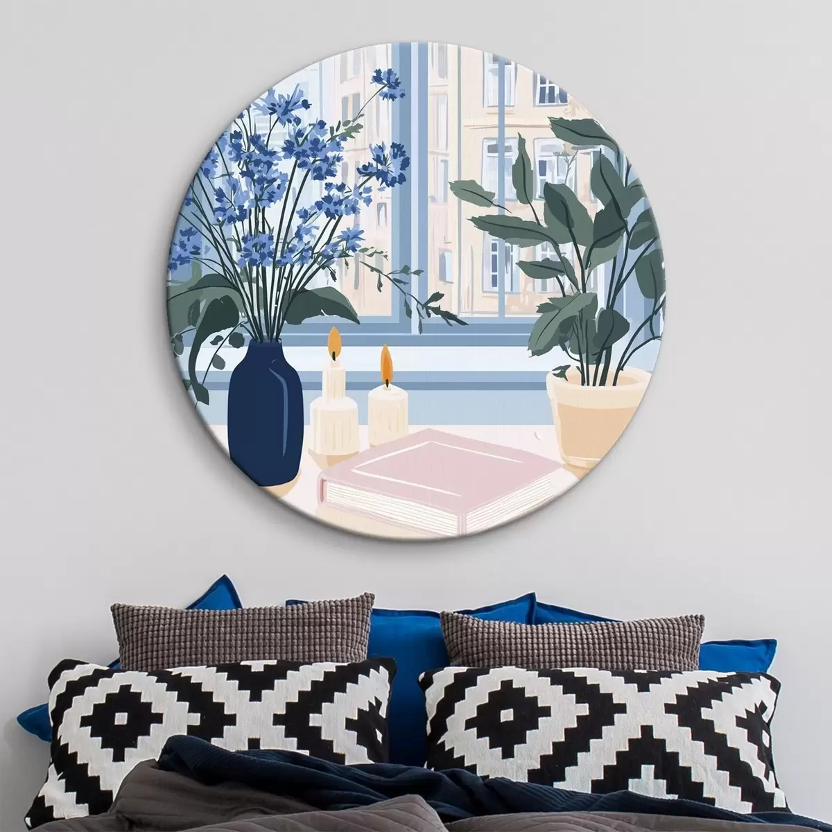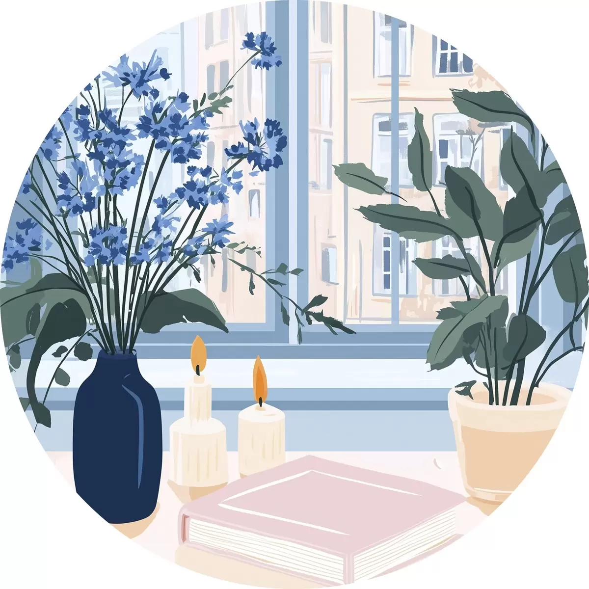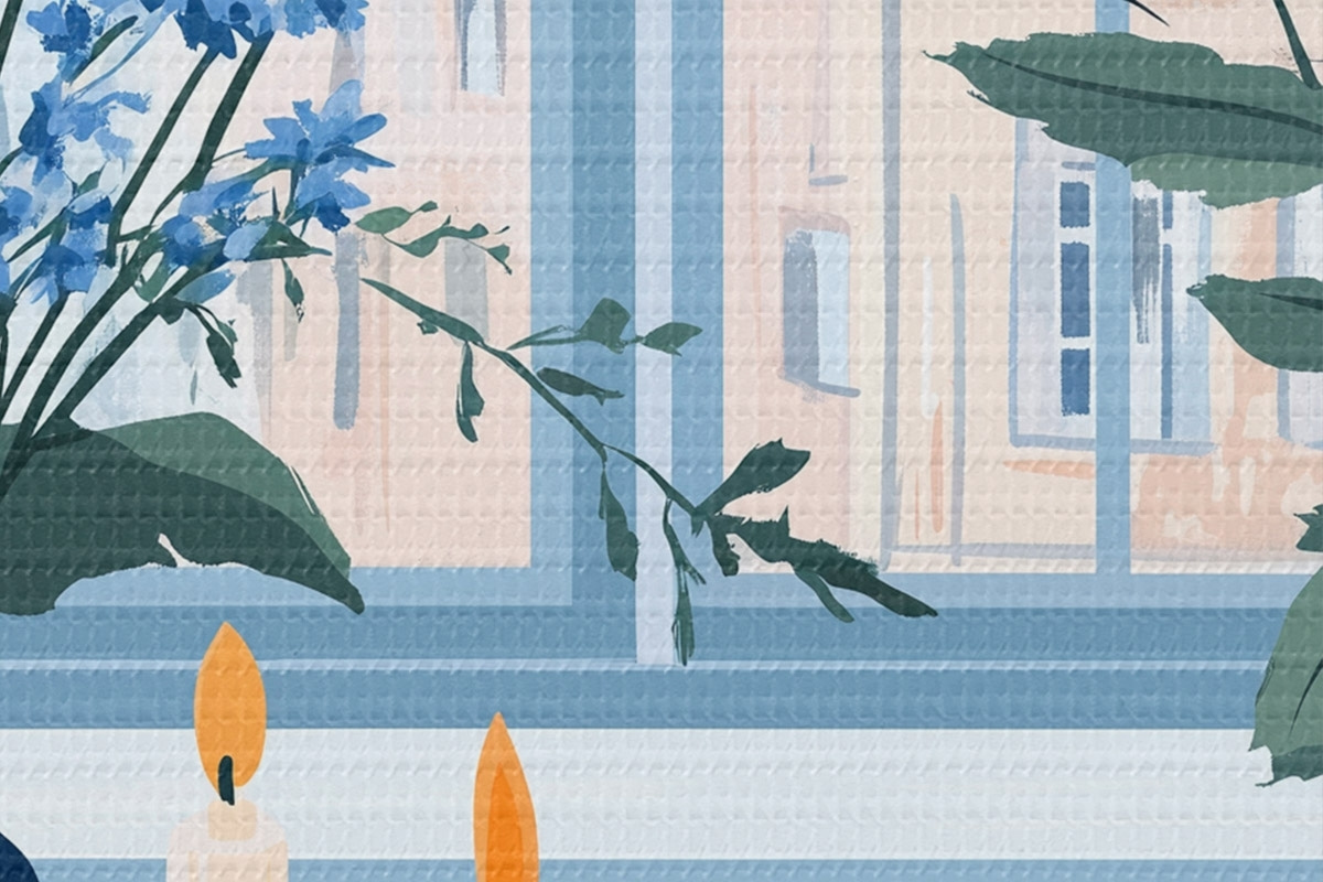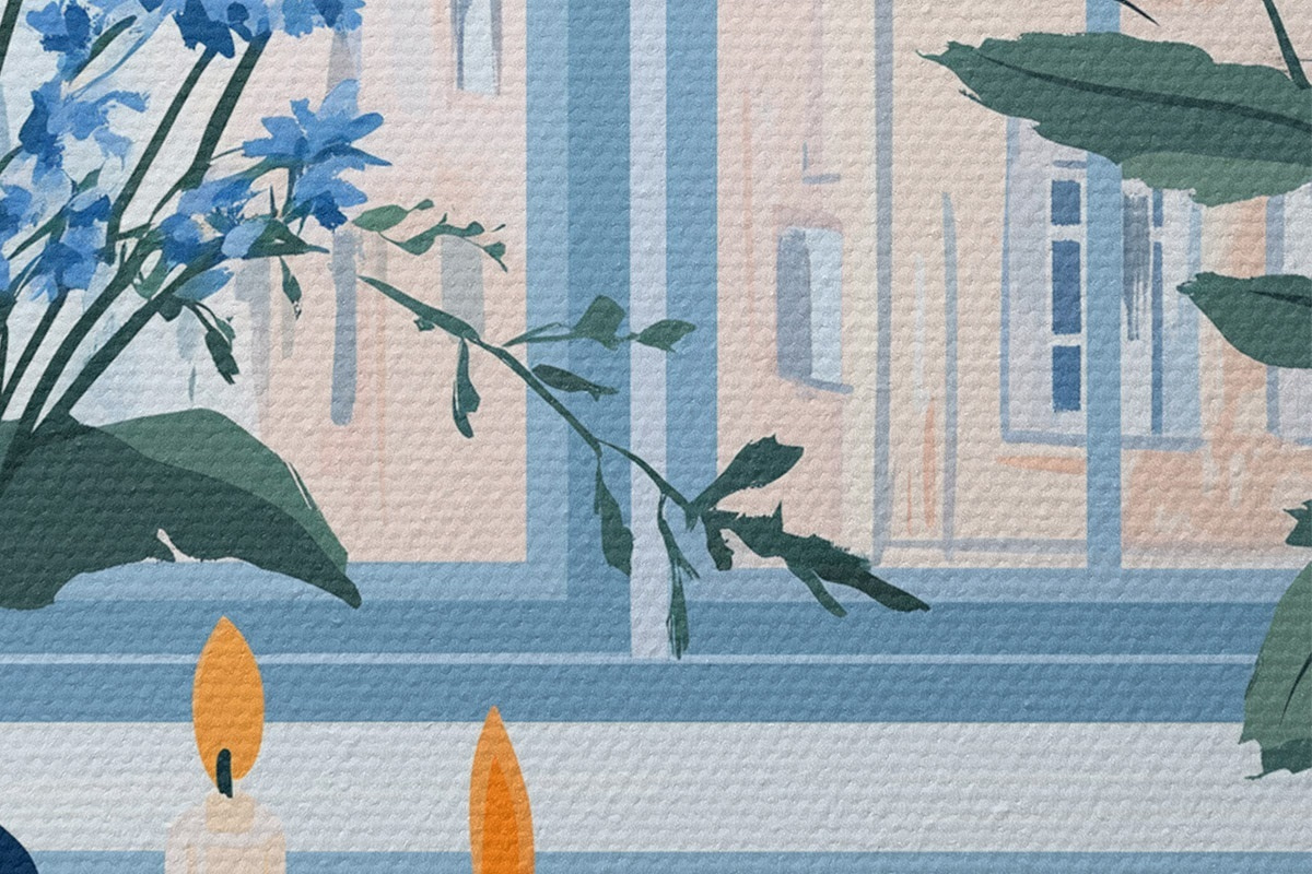Pilt Hubane kodu lillede ja aknavaatega, arhitektuur, sinised värvid Nr r44010