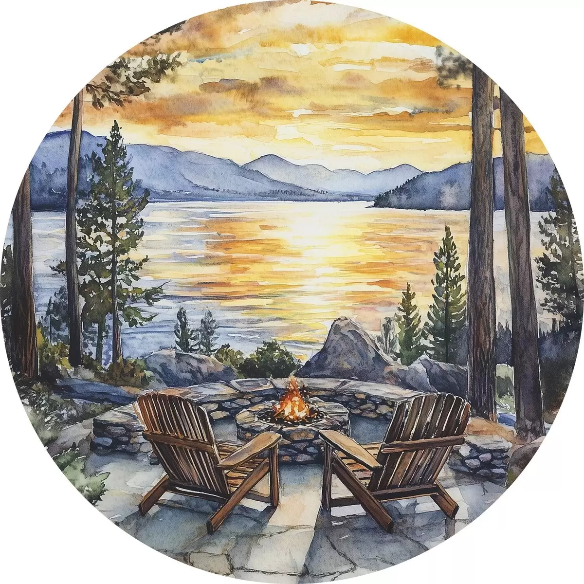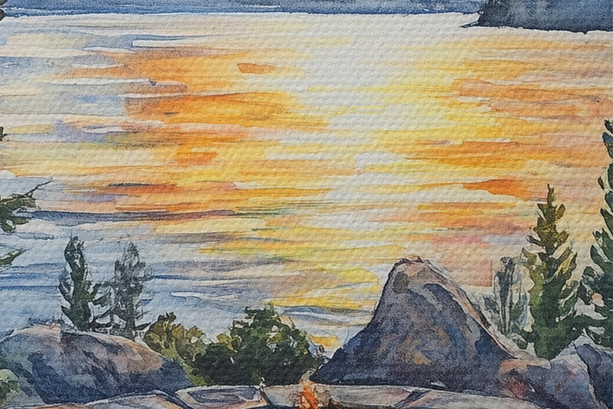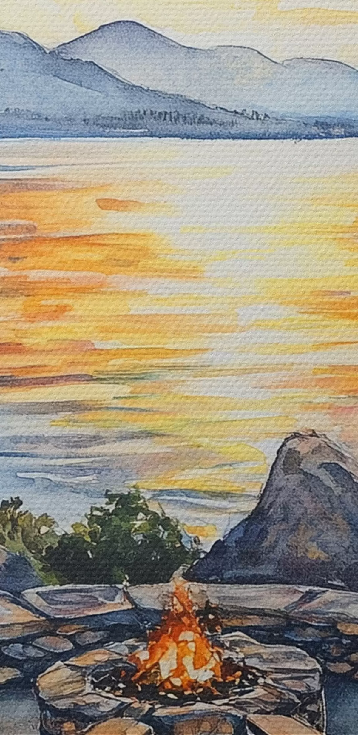 Pilt Järv koos mägedega päikeseloojangul, reisimine, hubane kamin, akvarell Nr r44018