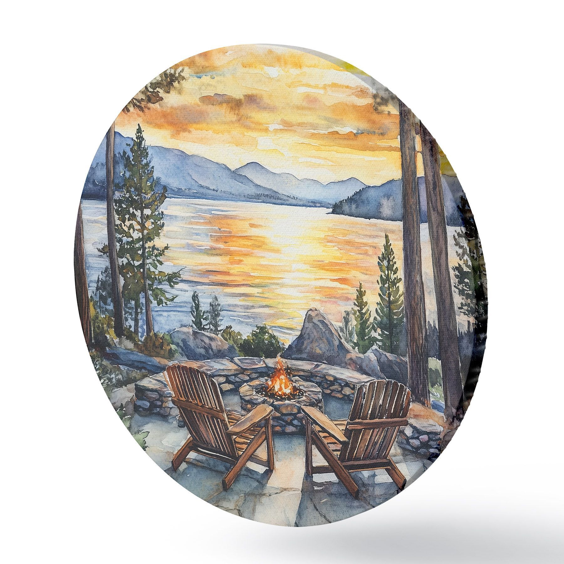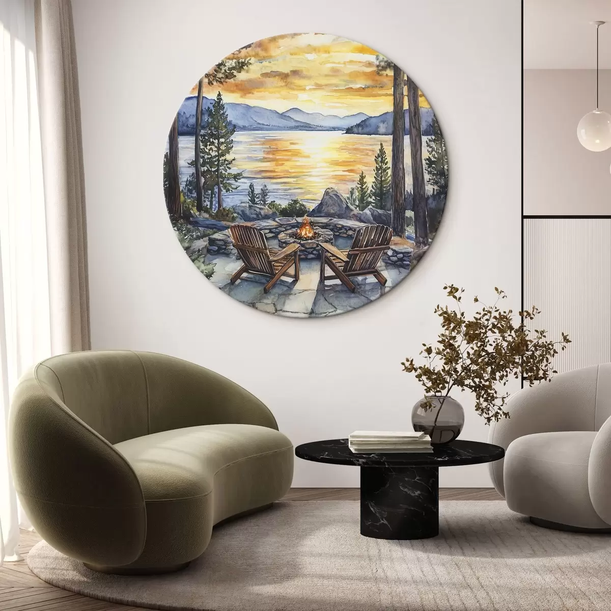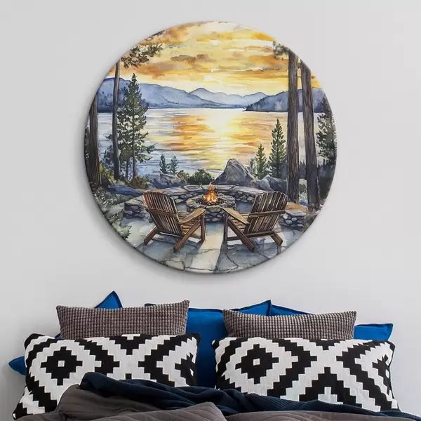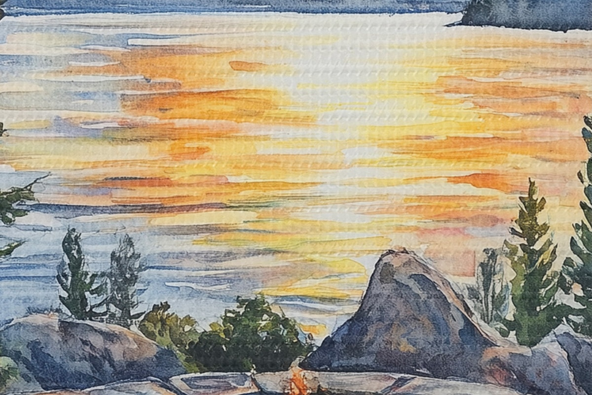 Pilt Järv koos mägedega päikeseloojangul, reisimine, hubane kamin, akvarell Nr r44018