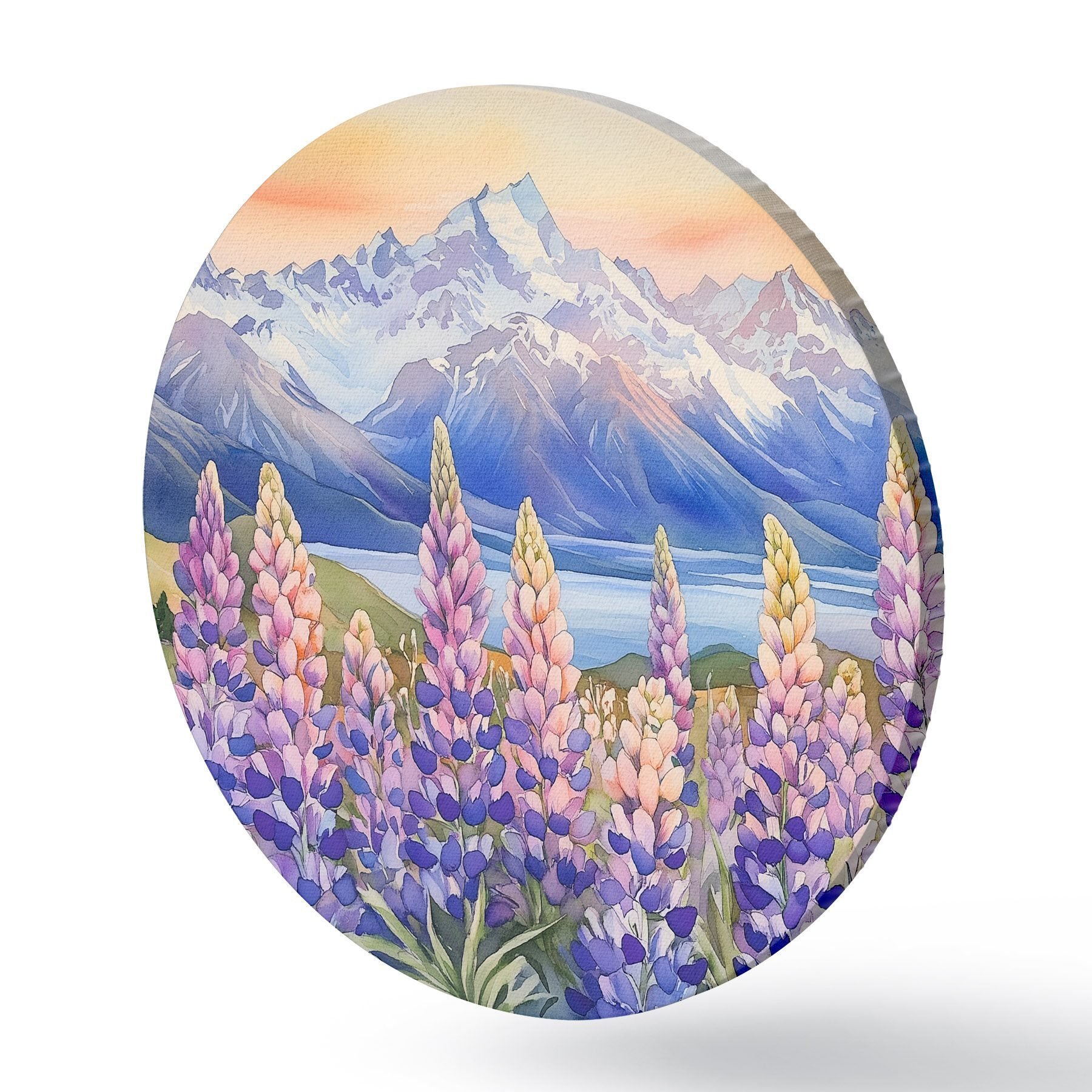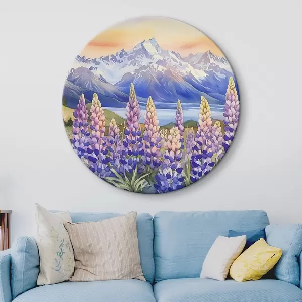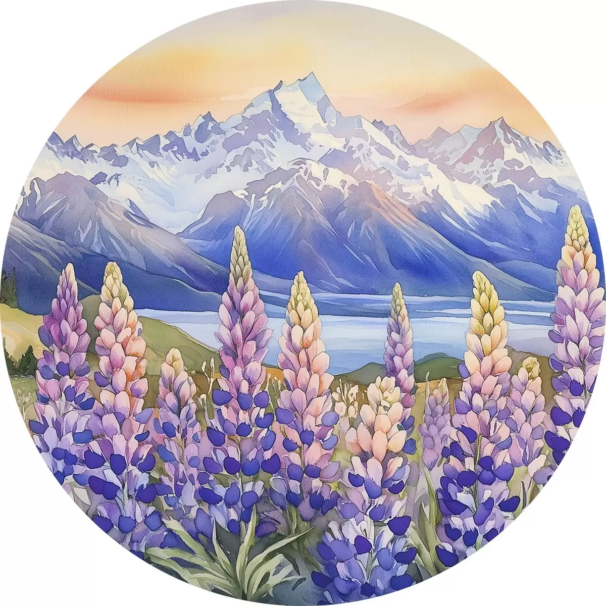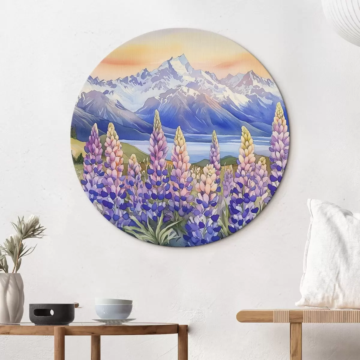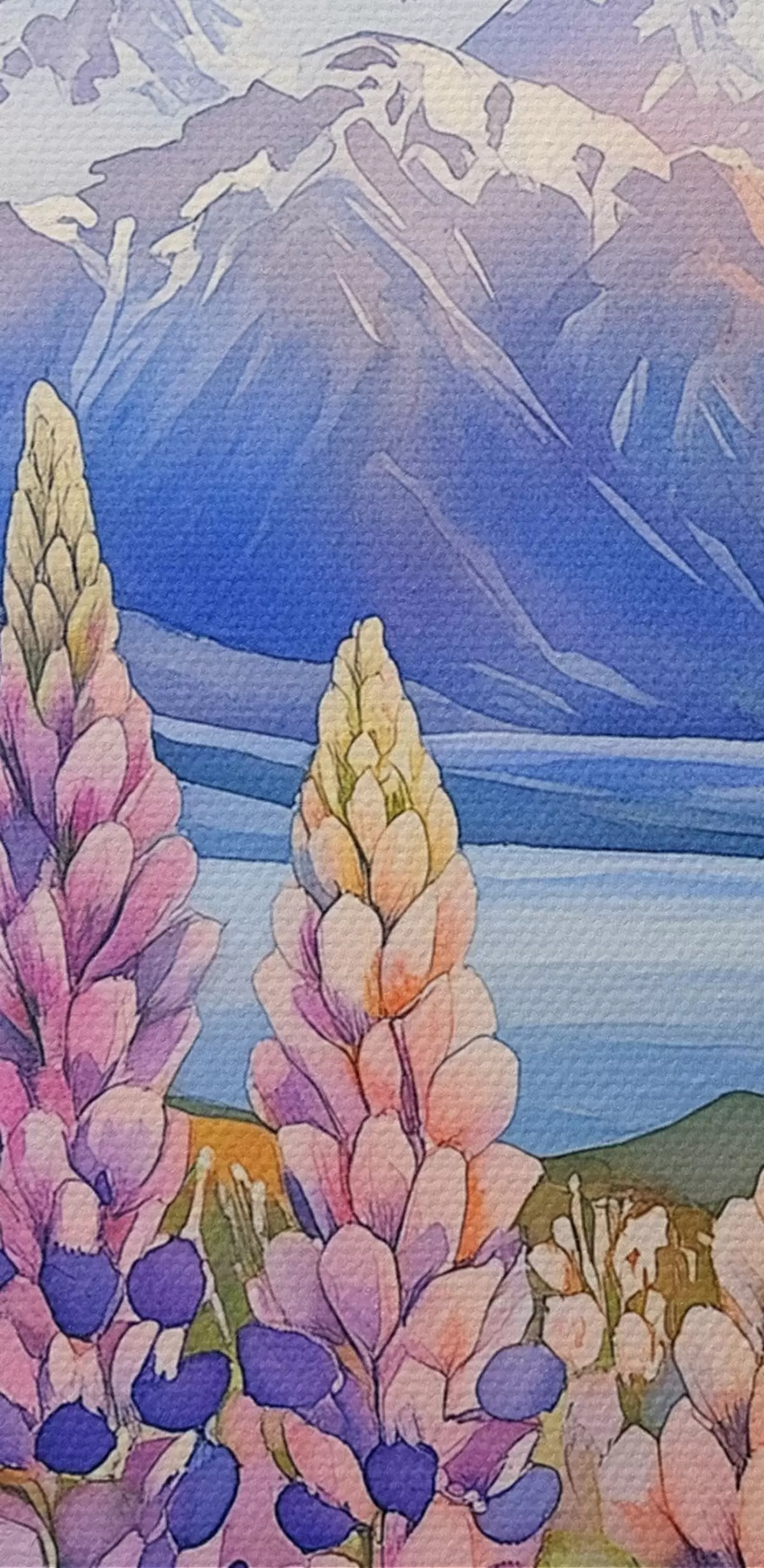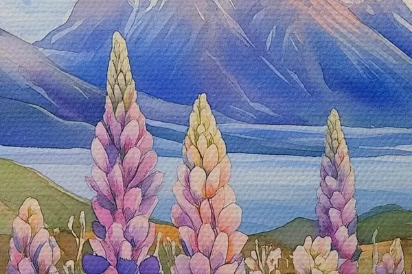 Pilt Lupiinide lilled, heinamaa, mäed, akvarellstiil, päikeseloojangu taevas Nr r44146