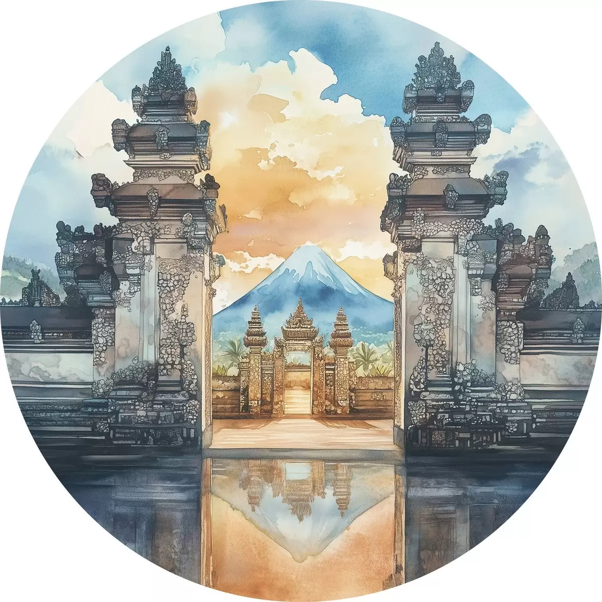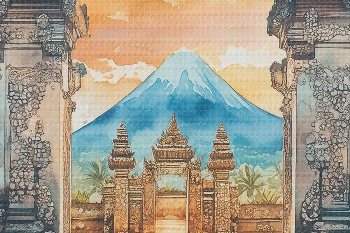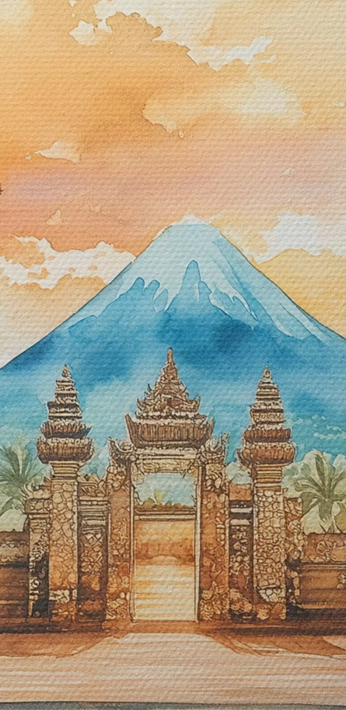 Pilt Bali esteetika, tempel, päikeseloojangu taevas, troopiline loodus, akvarellstiil Nr r44149