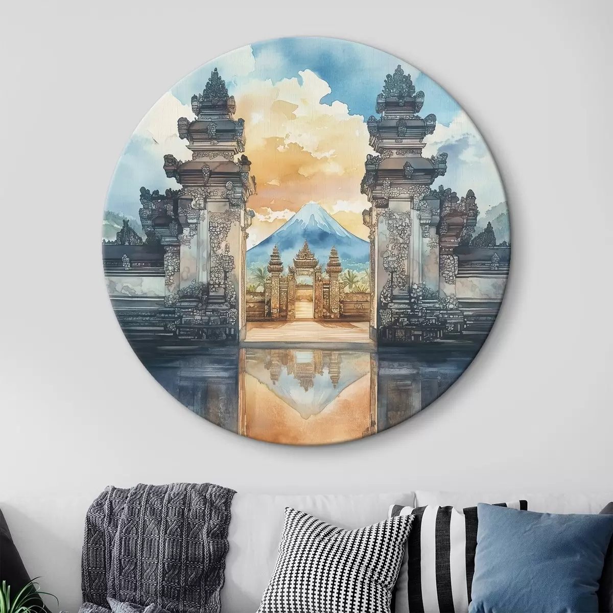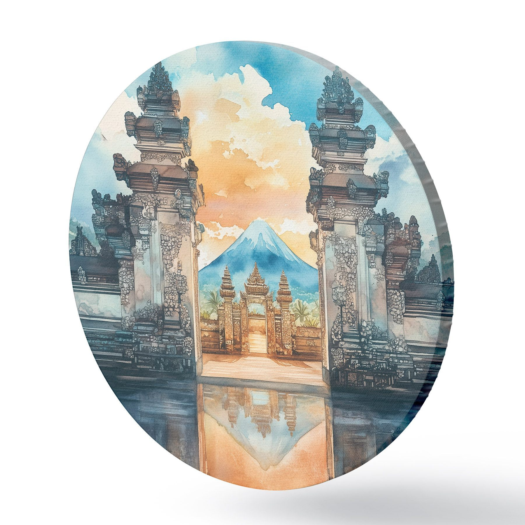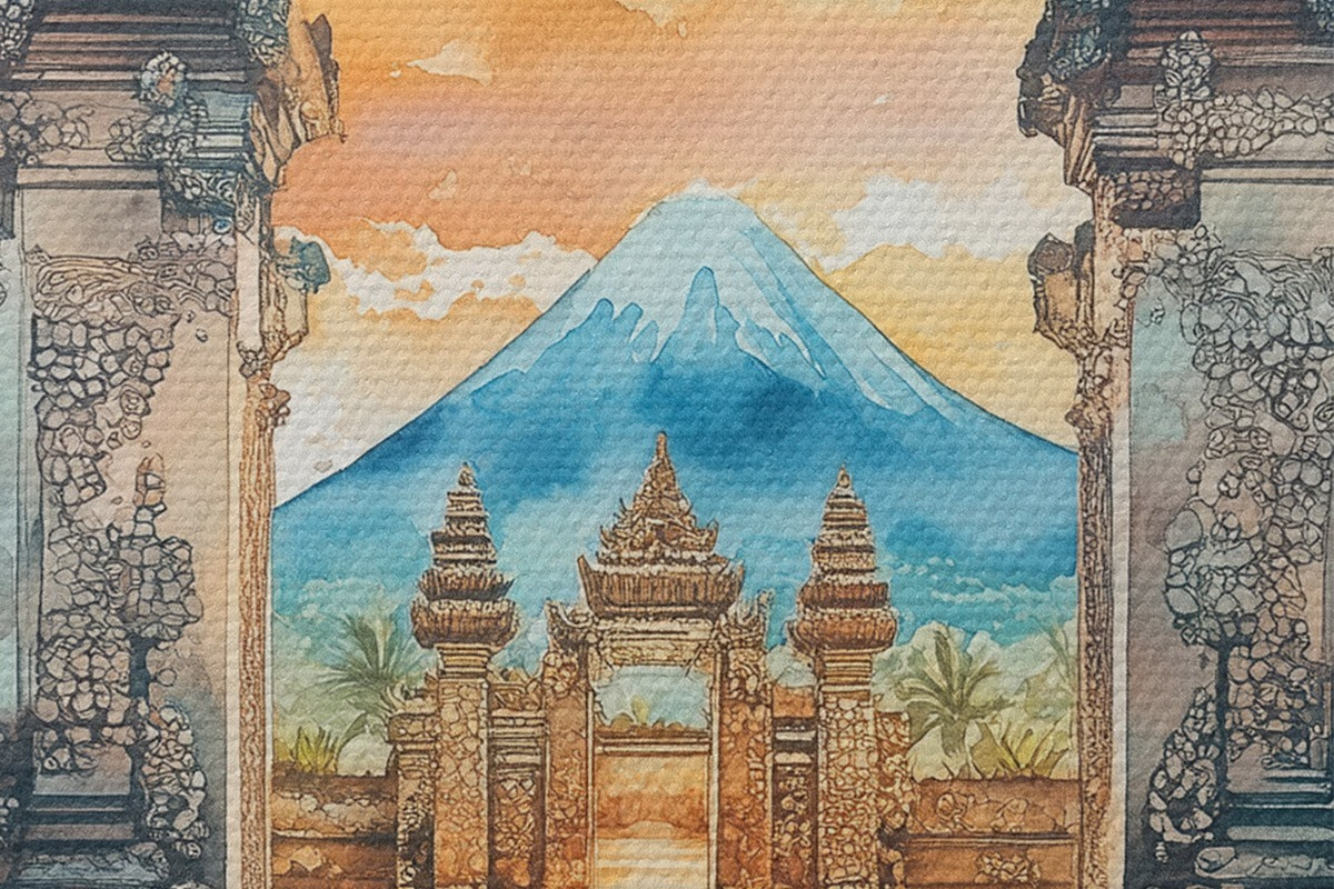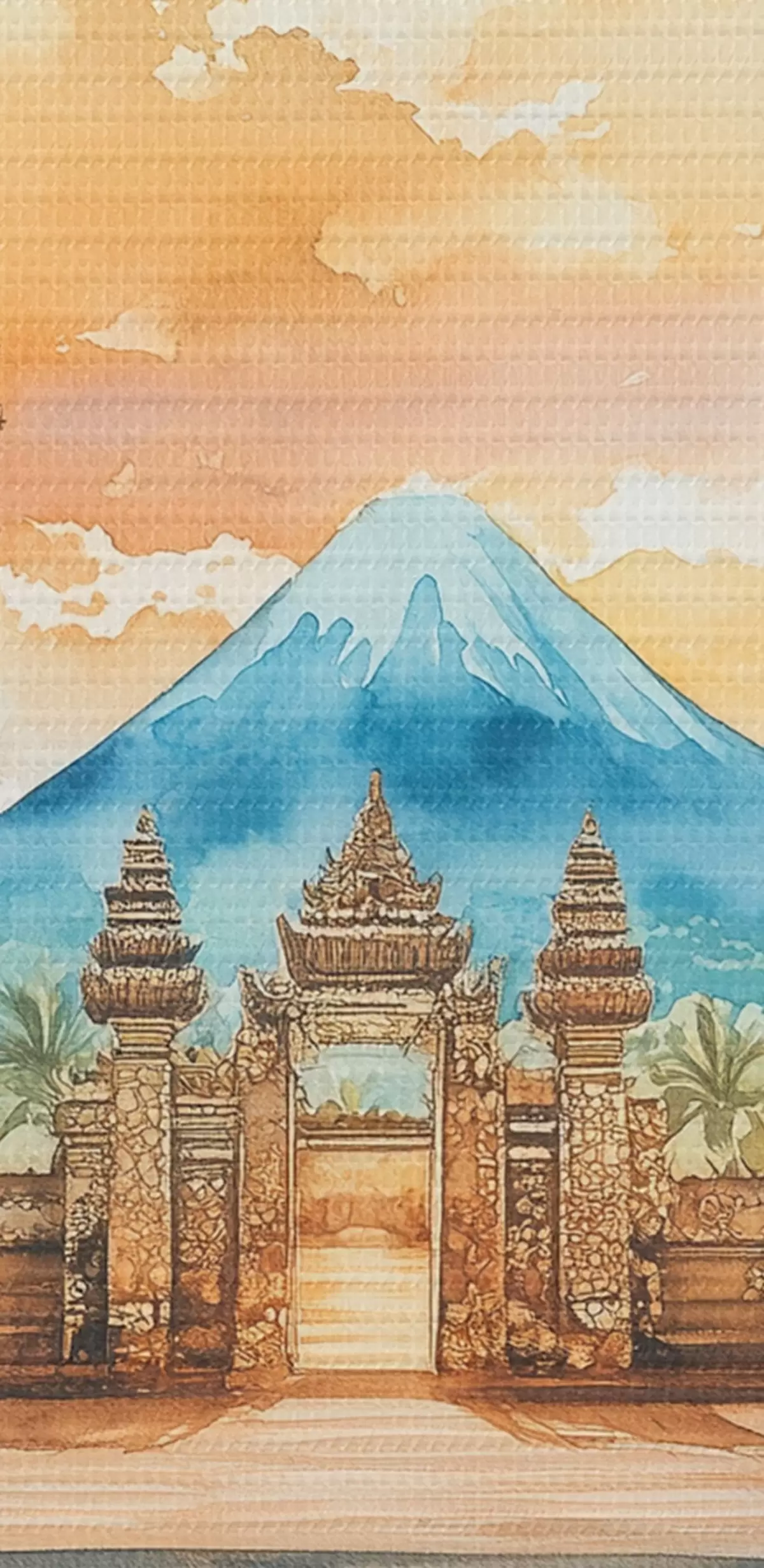Pilt Bali esteetika, tempel, päikeseloojangu taevas, troopiline loodus, akvarellstiil Nr r44149