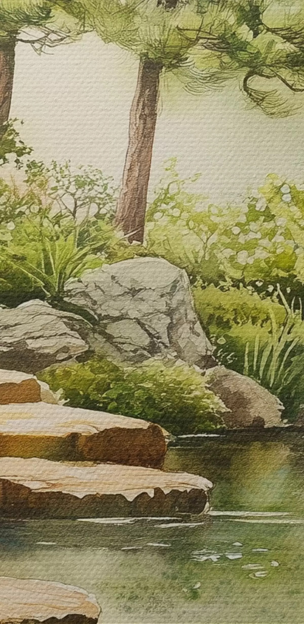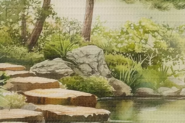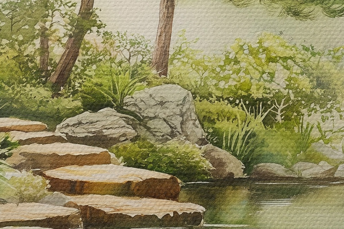 Pilt Idamaine aed koos järve ja puudega, loodus, akvarellstiilis Nr r44313