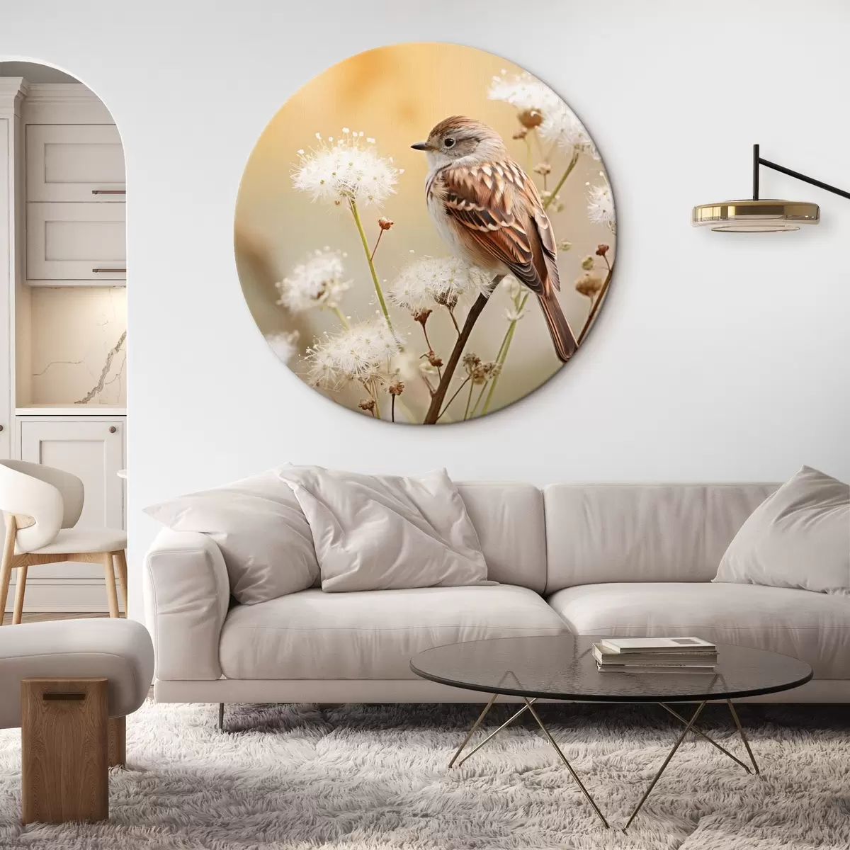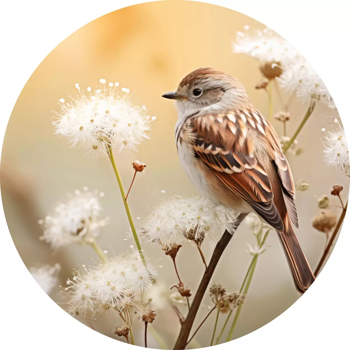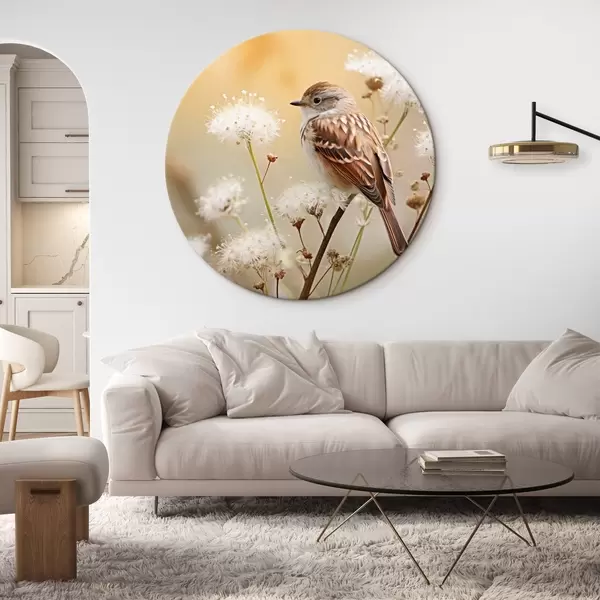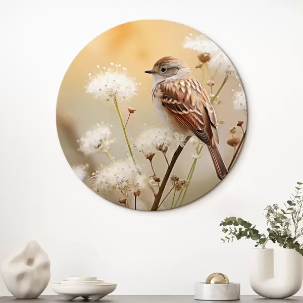 Pilt Linnuke istub valge lillega oksa peal, pehme fookus, loodusfoonil Nr r44393