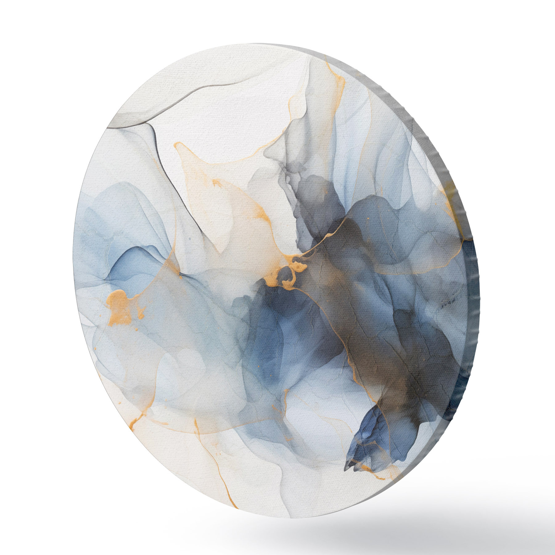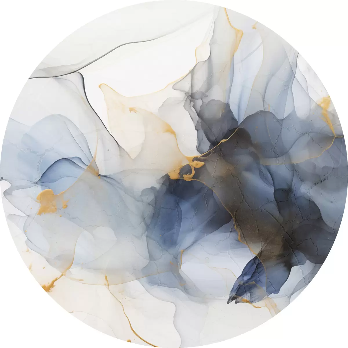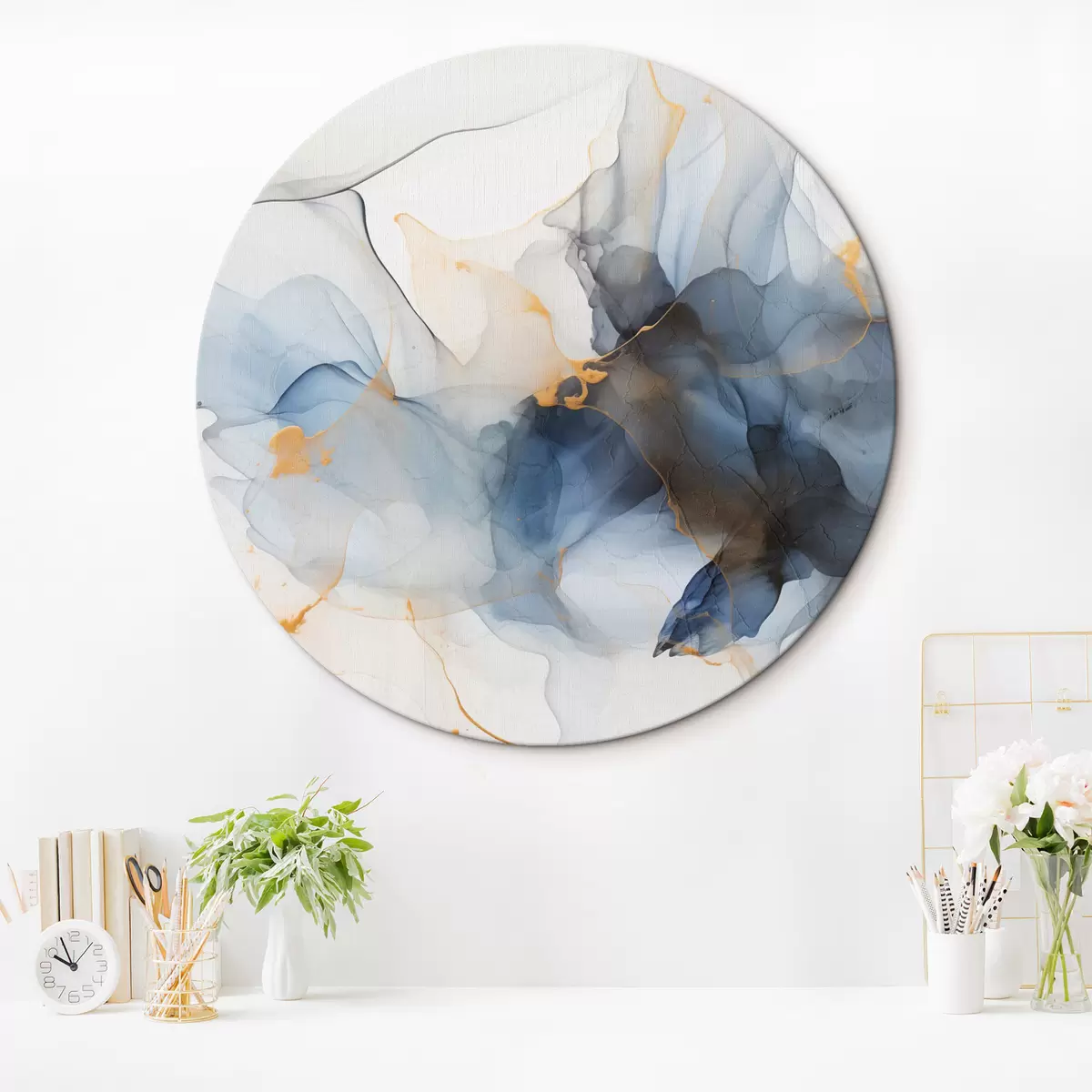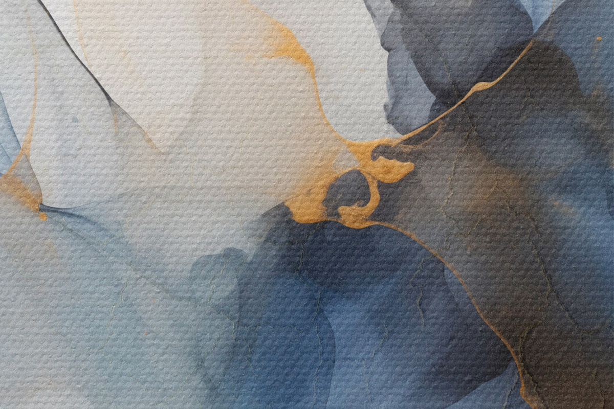 Pilt Abstraktne maal sinise tindiga, vedelad ja orgaanilised kujundid, õrnad tekstuurid valgel taustal Nr r44397