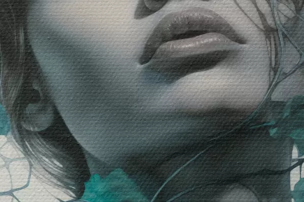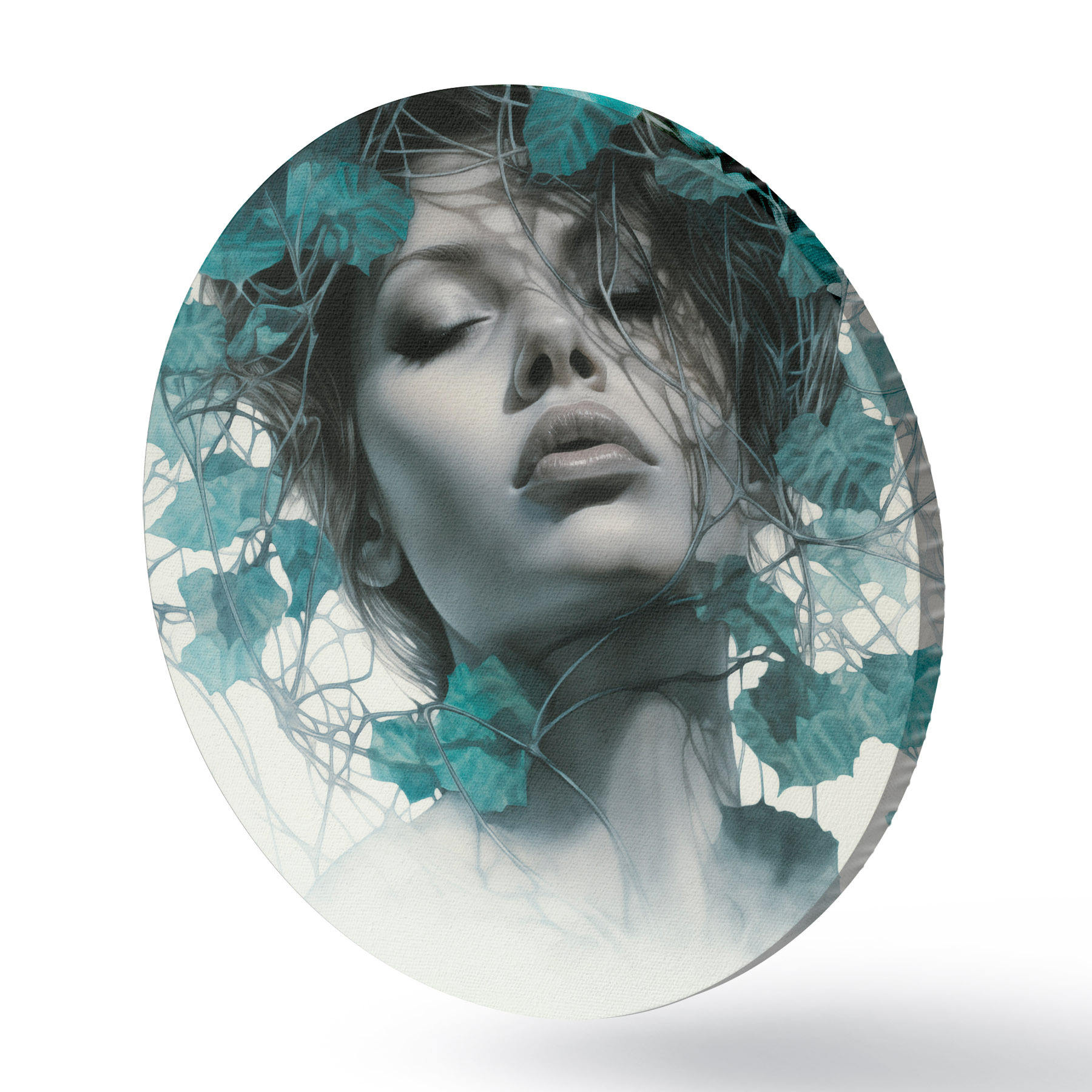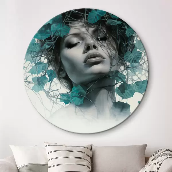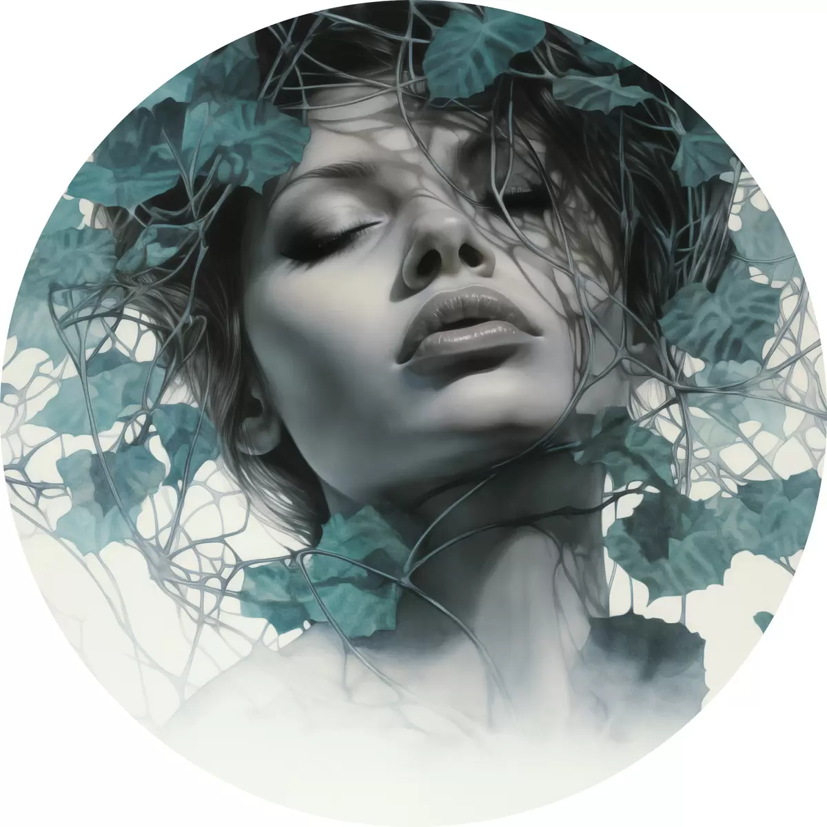 Pilt Suletud silmadega naise portree, ümbritsetud roheliste lehtede ja okstega Nr r44399